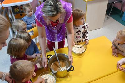 W naszym klubiku dzieci tworzyły dziś małe jeżyki – wsypywały ryż do garnka z kajmakiem i mieszając, obserwowały, jak powstaje słodka masa. Każdy mógł poczuć się jak mały kucharz i dobrze się przy tym bawić.