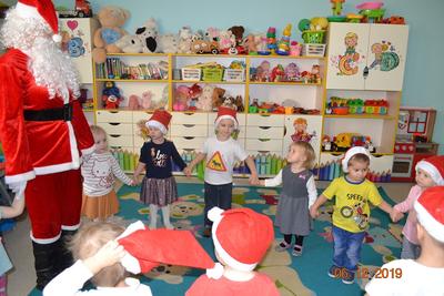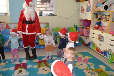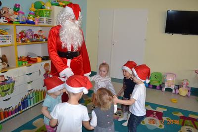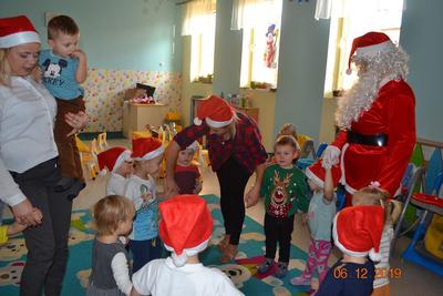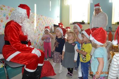 6 grudni w naszym klubiku wszyscy przenieśliśmy się w ,,bajkowy świat”. Nasze Maluchy wyglądały jak małe elfy, a może raczej jak małe Mikołaje, ponieważ wszystkie dzieci miały czerwone czapeczki Od rana w klubiku panował gwar i radość, dzieci z wielką niecierpliwością oczekiwały na przyjście niezwykłego gościa – Św. Mikołaja! Niekiedy rozbrzmiewały dzwoneczki… to oznaczało, że Mikołaj jest tuż, tuż. Wreszcie … Przyjechał!! – PRAWDZIWY – ŚWIĘTY MIKOŁAJ! To był naprawdę niezwykły gość, który obdarował prezentami wszystkie dzieci. Dziecie za otrzymane prezenty podziękowały Mikołajowi wspólnym tańcem pięknymi uśmiechami. Dzieci zapraszały Gościa do domów oraz prosiły, aby przyjechał do nich za rok. No… oczywiście obiecywały, że będą grzeczne.