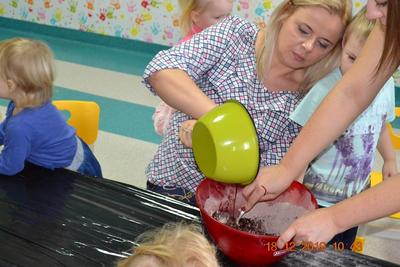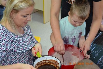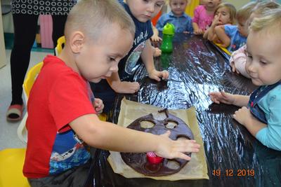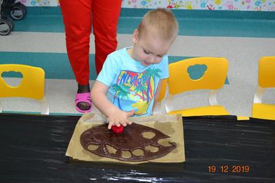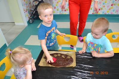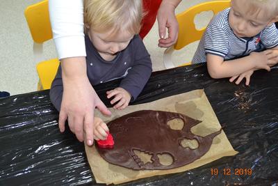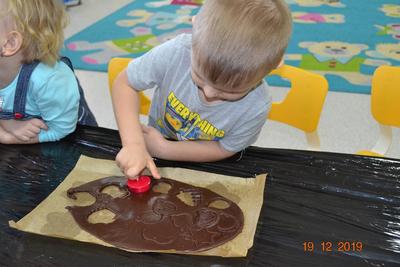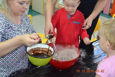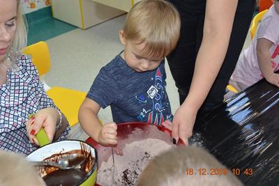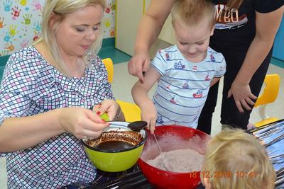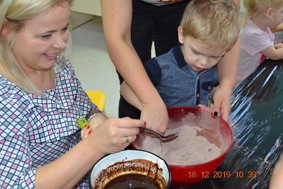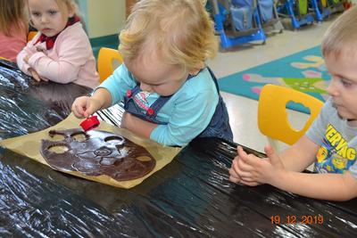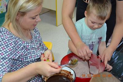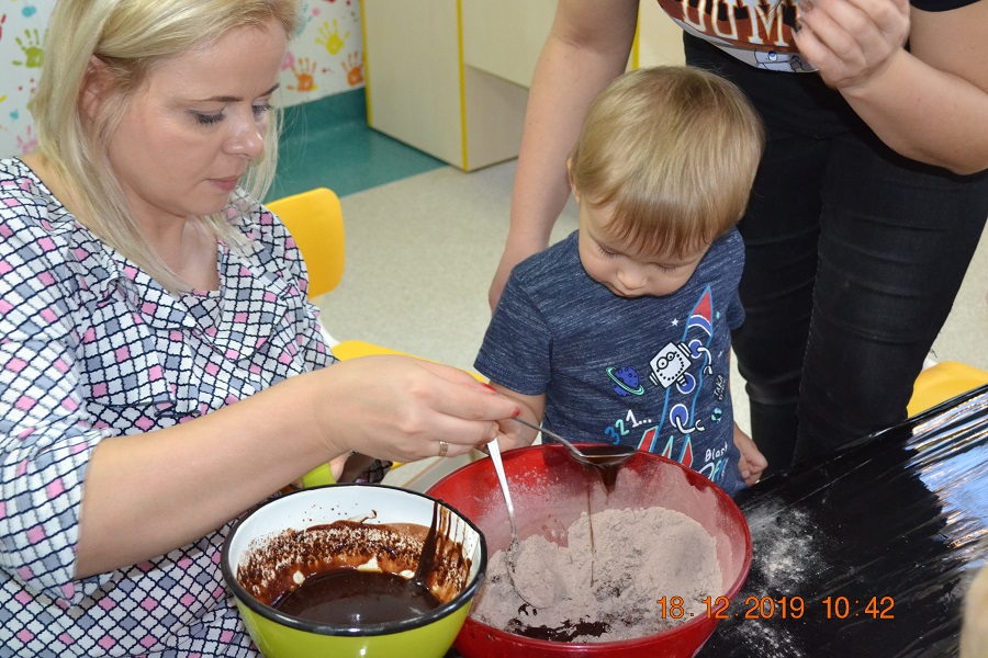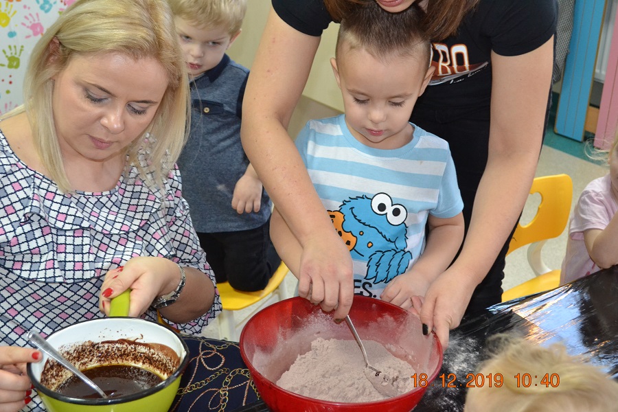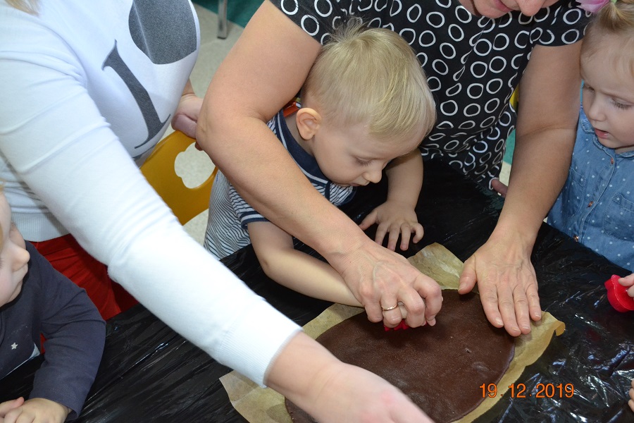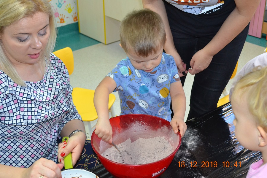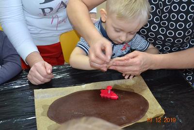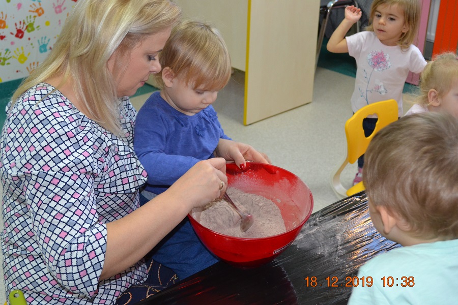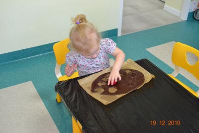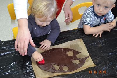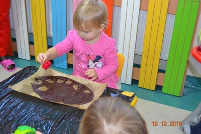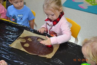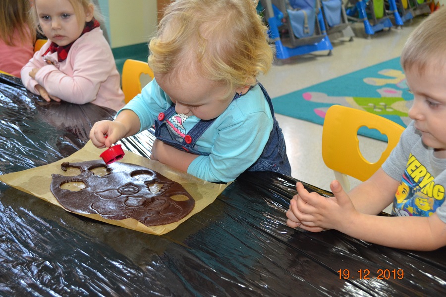Czyż to nie wspaniale, w klubiku zabawić się w prawdziwego cukiernika, piekarza. Wspólne wałkowanie ciasta na pierniki, a następnie wykrawanie różnych kształtów dzięki niezliczonej ilości foremek to dopiero była zabawa. Pełne blaszki gotowych do upieczenia ciasteczek dzieci zanosiły do naszej kuchni, gdzie pod czujnym okiem cioci nabierały złocistej barwy. Gdy tylko pierwsze wypieki zostały wyciągnięte z piekarnika to po klubiku zaczął się unosić wspaniały aromat pieczonych pierniczków, który wprawił wszystkich w cudowny, świąteczny nastrój. Oczywiście pierwsza blaszka ciasteczek wylądowała w brzuszkach naszych małych cukierników.