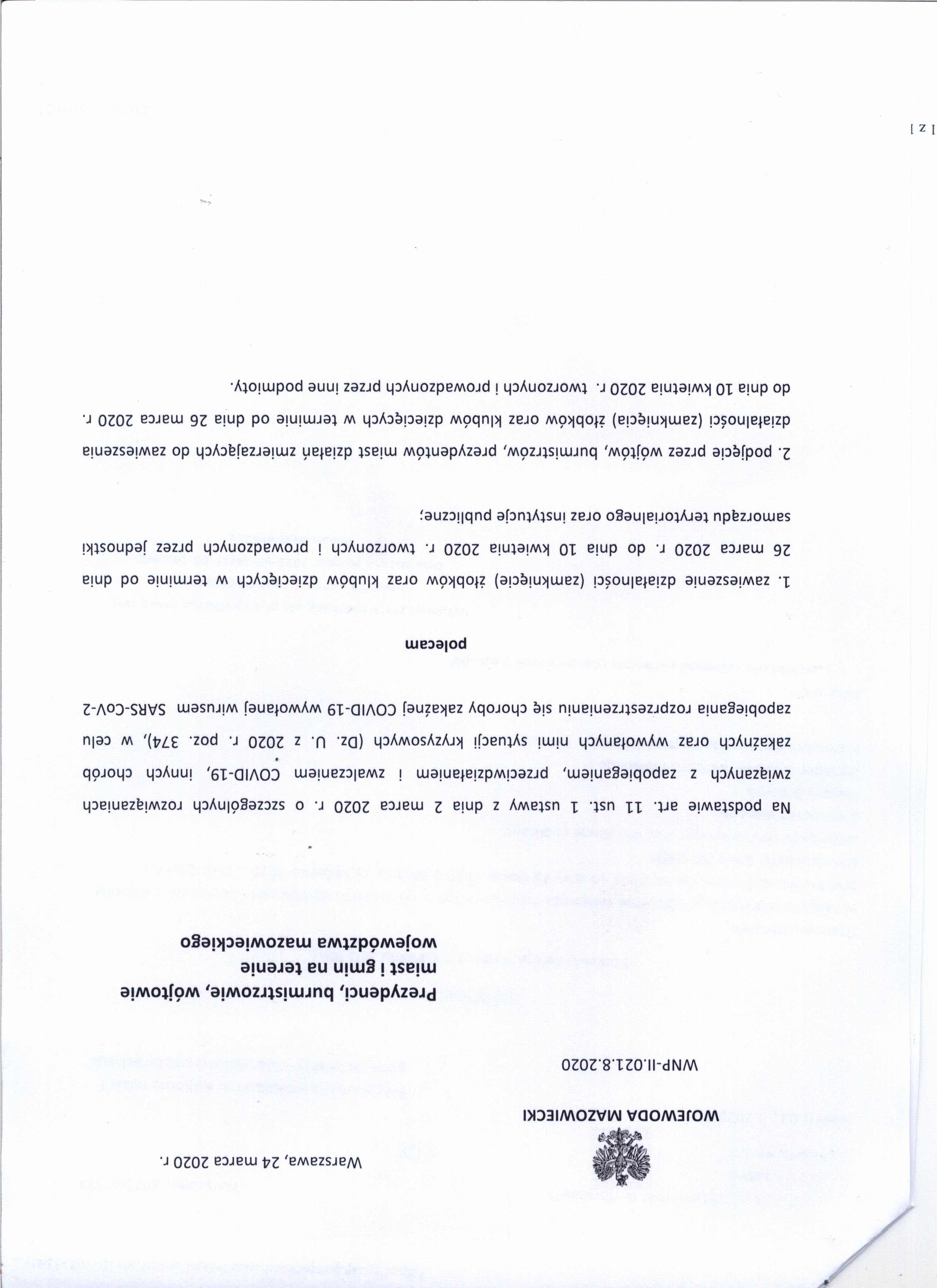 W związku z poleceniem Wojewody Mazowieckiego z dnia 24 marca 2020 roku, Wójt Gminy Gozdowo wydał Zarządzenie Nr 36/2020 z dnia 26 marca 2020r. w sprawie zawieszenia świadczenia opieki w Klubach Dziecięcych prowadzonych przez Gminę Gozdowo od 26 marca 2020 roku do 10 kwietnia 2020r.