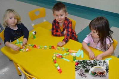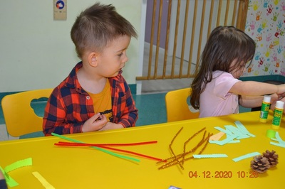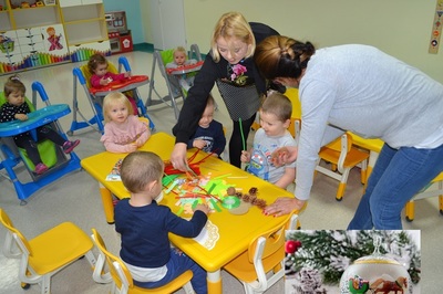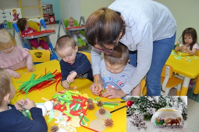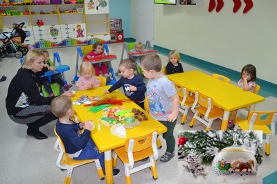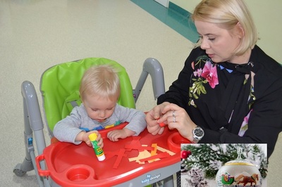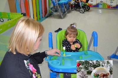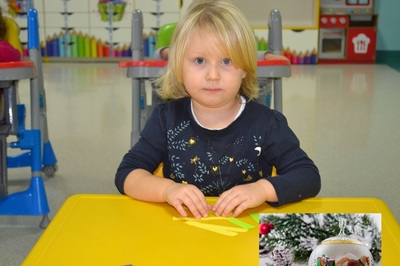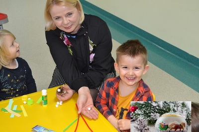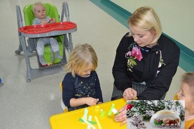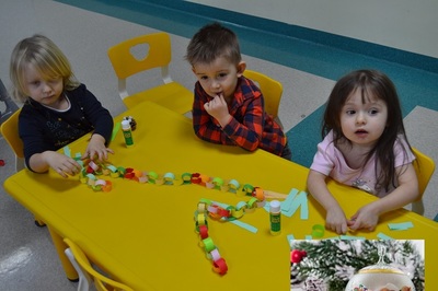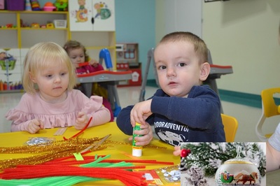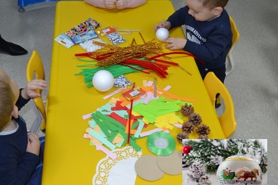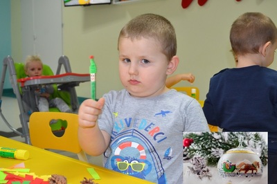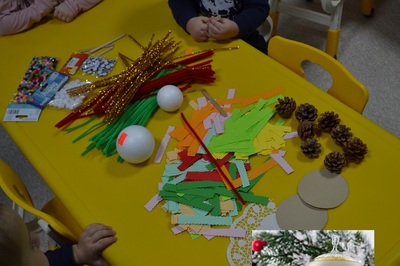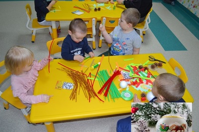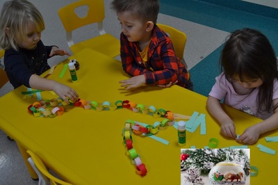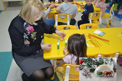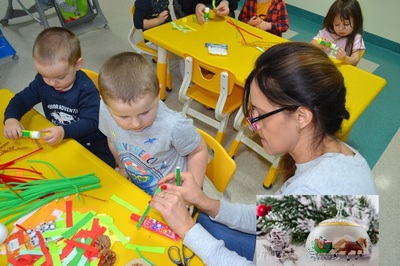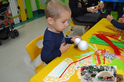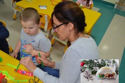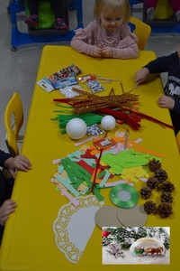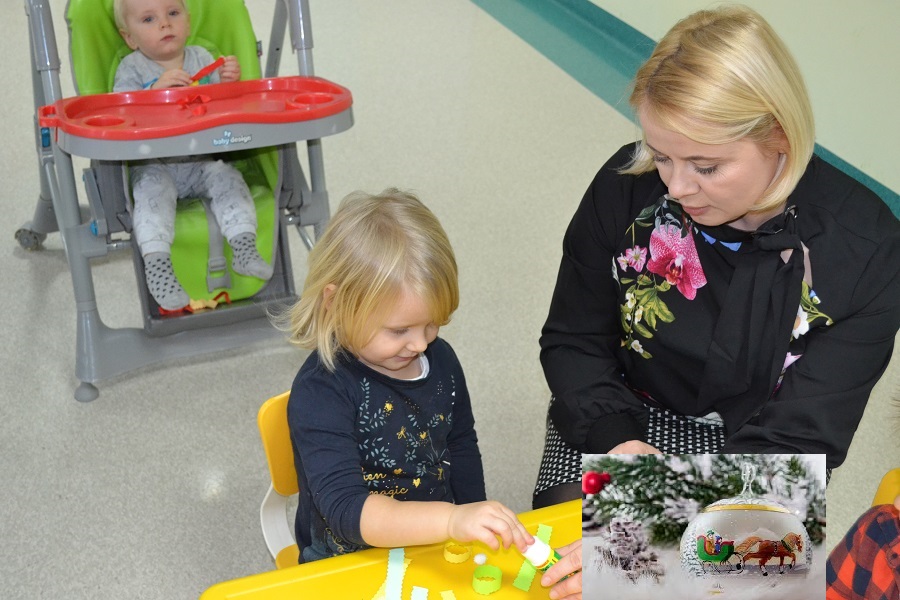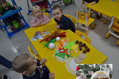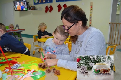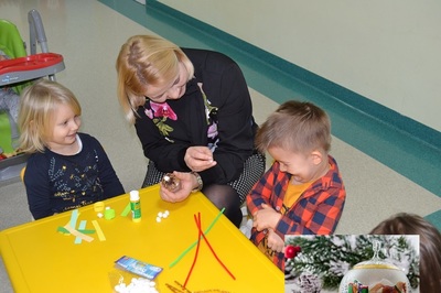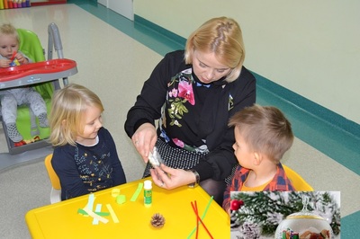 Naszym małym artystom bardzo spodobał się ten pomysł, było przy tym mnóstwo dobrej zabawy. Wspólnie z ciociami dzieci przygotowały łańcuch na choinkę, bałwanka, bombkę ze sznurka i inne cuda.