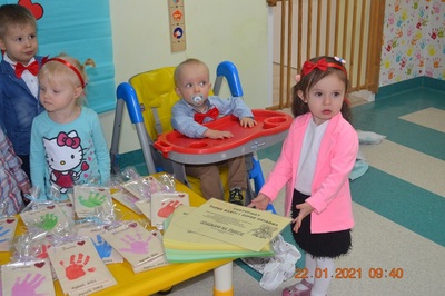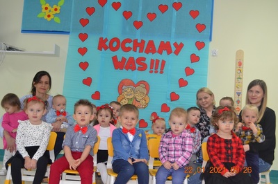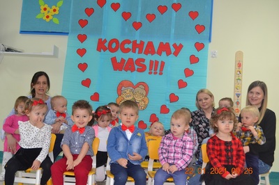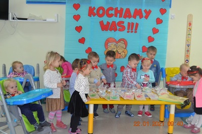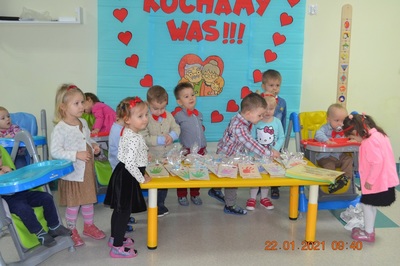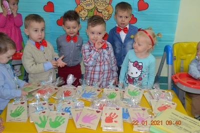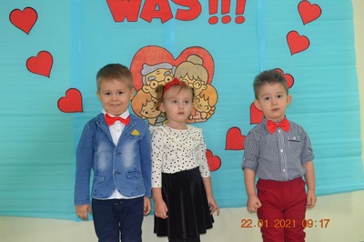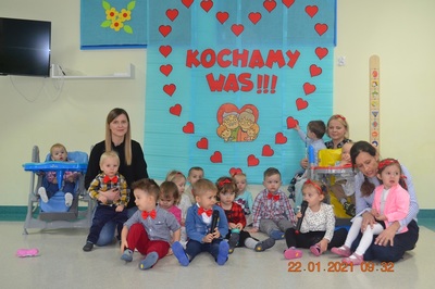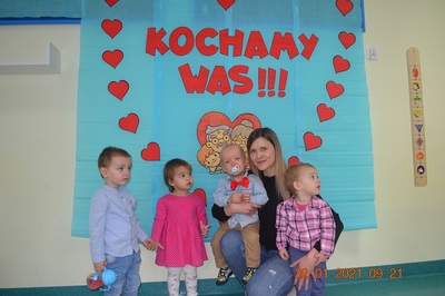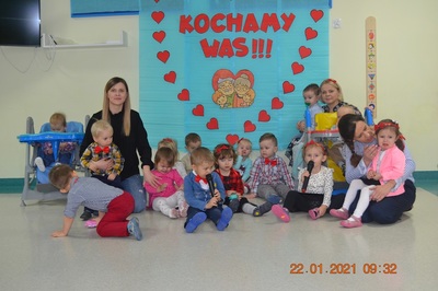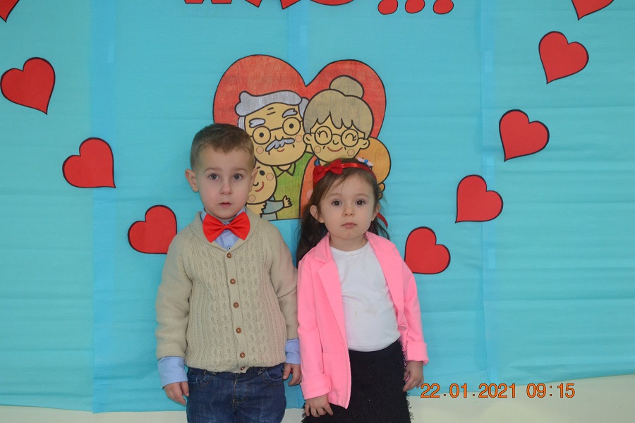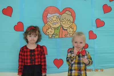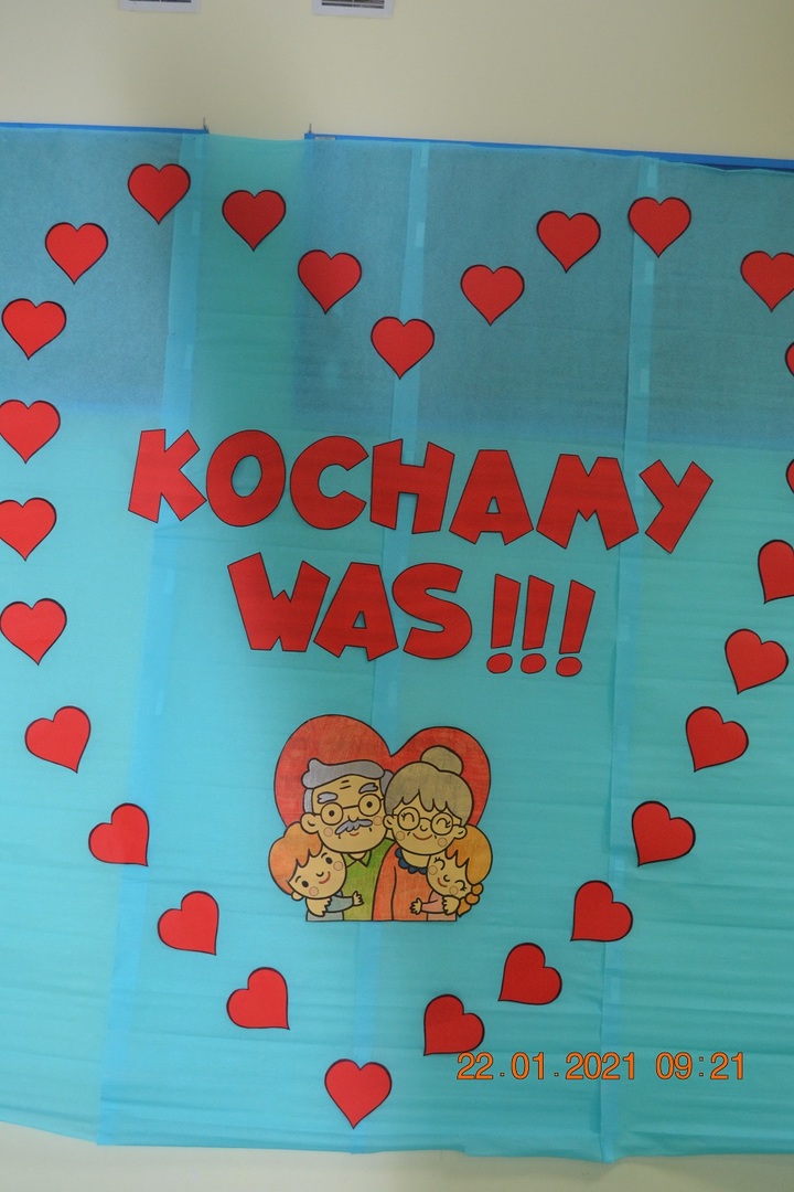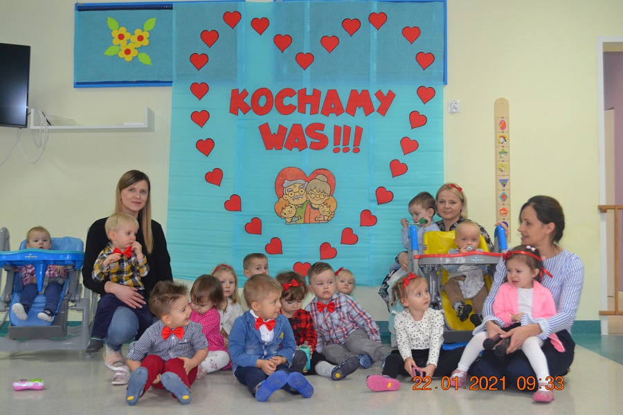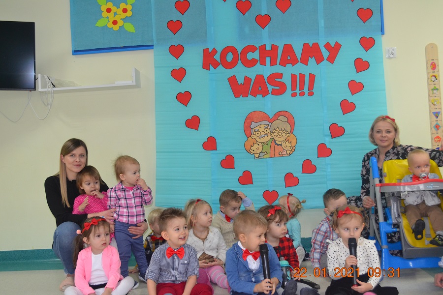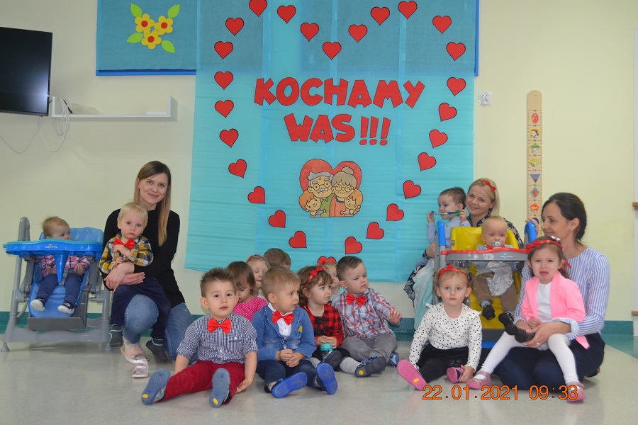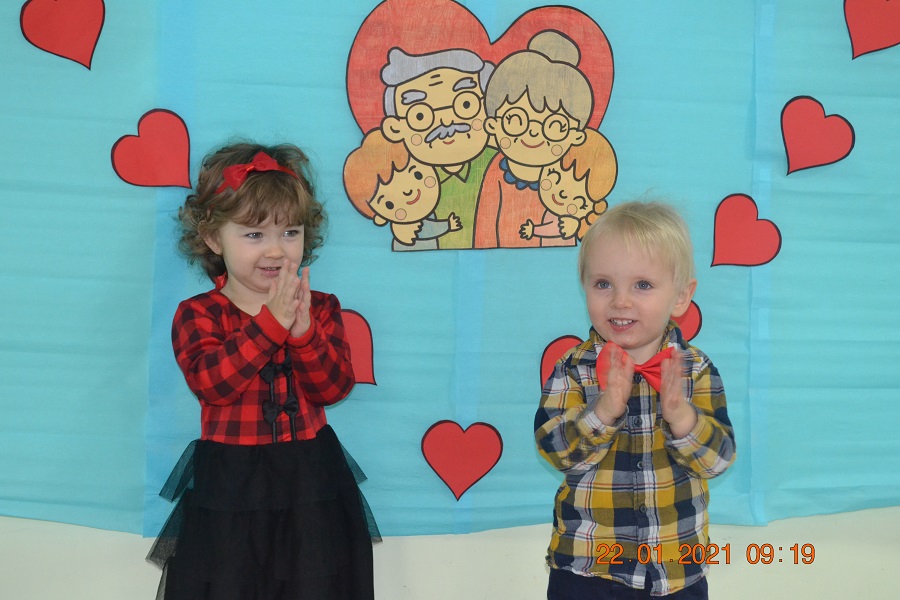 W tych trudnych czasach i spotkania okolicznościowe muszą przybrać inną formę, dlatego w tym roku zamiast spotkania z dziadkami dzieci wspólnie ze swoimi ciociami przygotowały życzenia dla solenizantów. Gabryś pięknie wyrecytował wierszyk, a dzieci wspólnie odśpiewały piosenkę dla wszystkich babć i dziadków oraz głośno i wyraźnie wspólnymi siłami odśpiewaliśmy 100 lat.