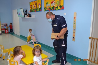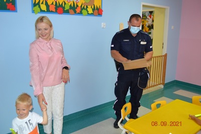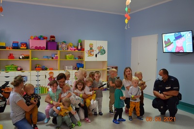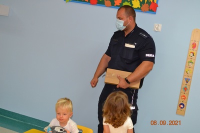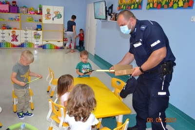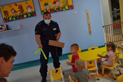 Kolejnym punktem spotkania było omówienie tematyki bezpieczeństwa na drodze. Dzieci poznały podstawowe zasady poruszania się po drodze. Dzielnicowy rozdał wszystkim naszym podopiecznym elementy odblaskowe.
