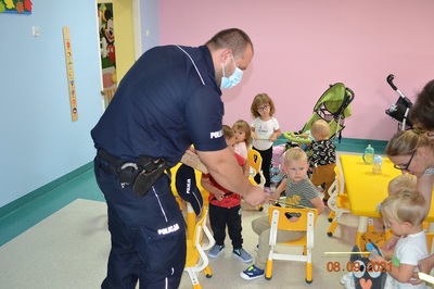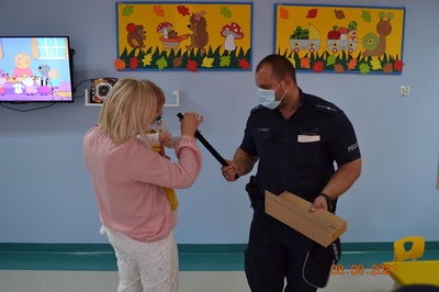 Młodzi słuchacze z chęcią rozmawiali z mundurowym na temat zawodu policjanta, dowiedzieli się czym zajmują się policjanci oraz w jaki sprzęt wyposażeni są idąc do służby.