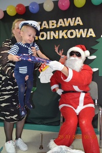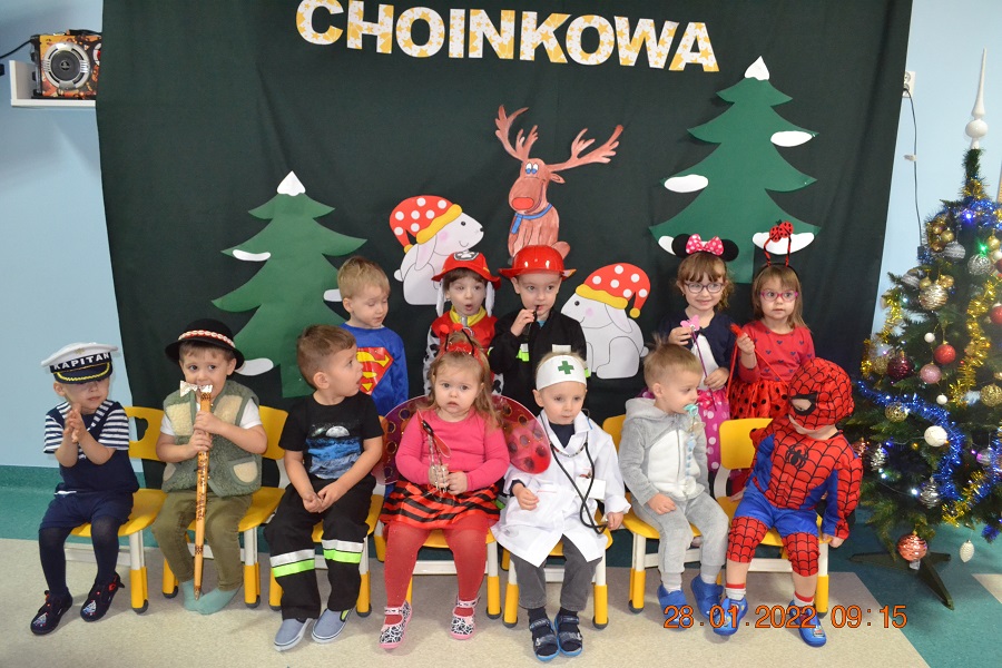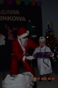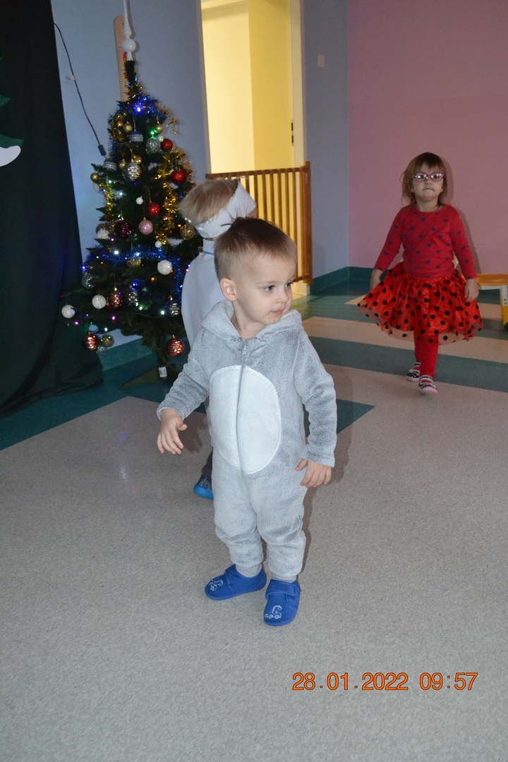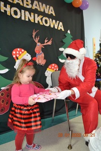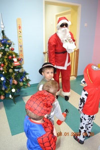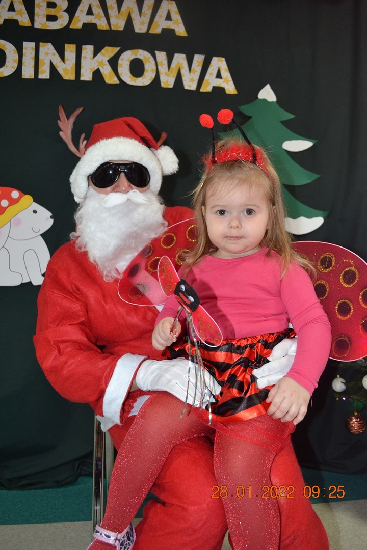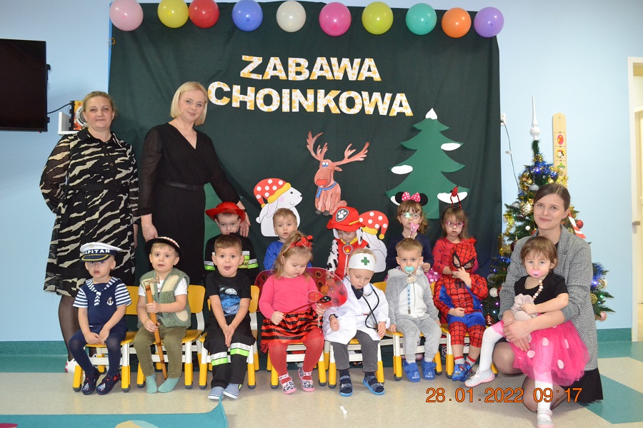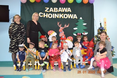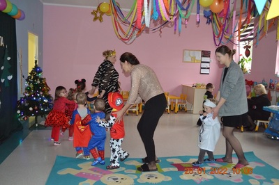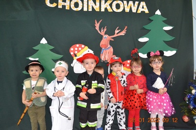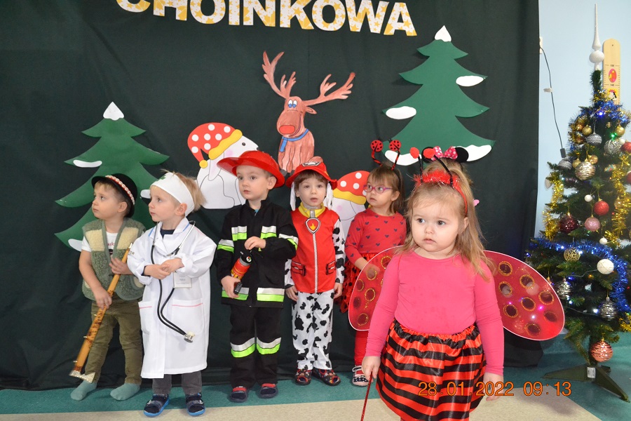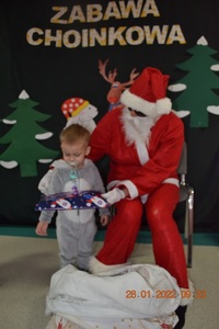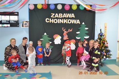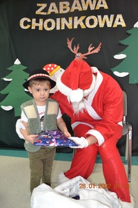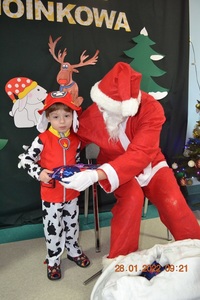 W tym roku połączyliśmy zabawę choinkową z balem karnawałowym. Było wiele wrażeń i dobrej zabawy. Odwiedził nas nawet gość specjalny – Święty Mikołaj. Dzieci otrzymały upominki, za które podziękowały gościowi wspólnym tańce, następnie pożegnały go i rozpoczął się wielki bal karnawałowy. Na bal przybyły księżniczki, wróżki, policjant, strażak i wiele innych postaci z bajek. Był słodki poczęstunek, a czas mijał w rytmach skocznej muzyki przy której dzieci bawiły się bo obiadku.