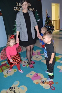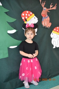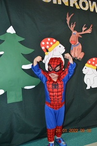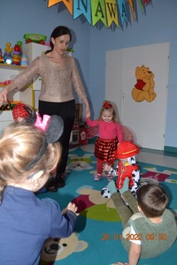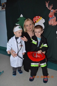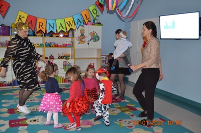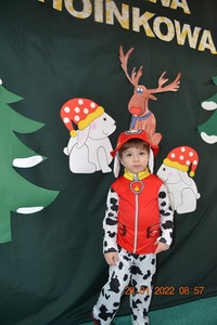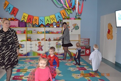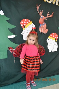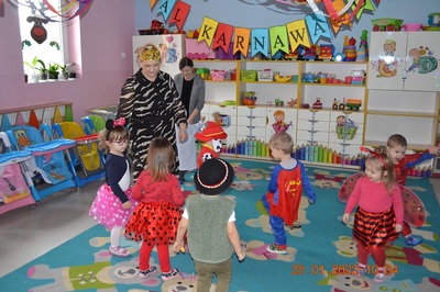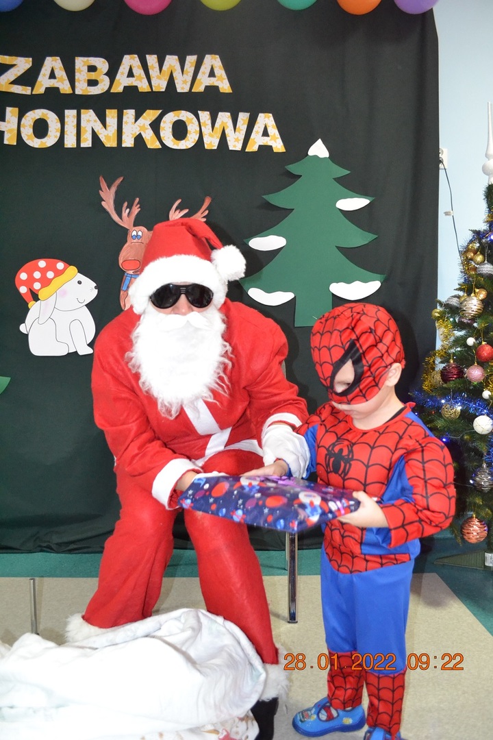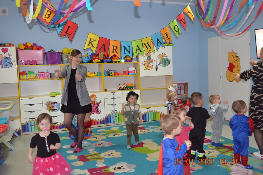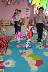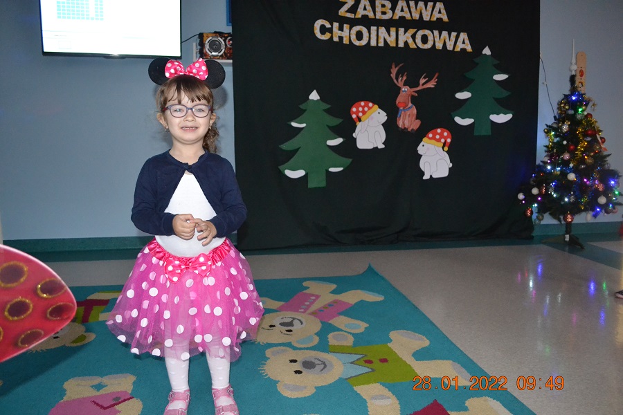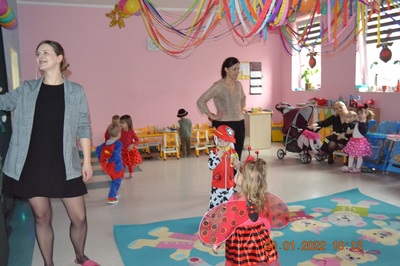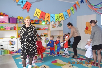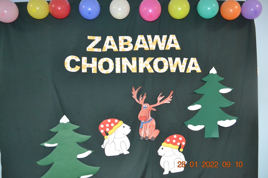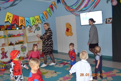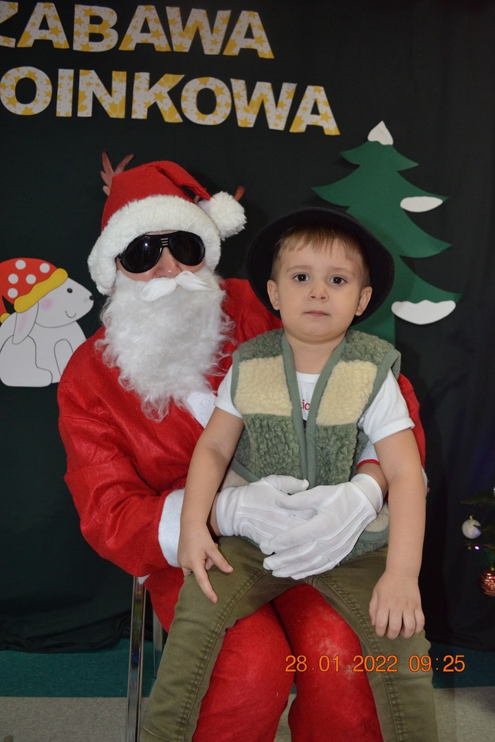W tym roku połączyliśmy zabawę choinkową z balem karnawałowym. Było wiele wrażeń i dobrej zabawy. Odwiedził nas nawet gość specjalny – Święty Mikołaj. Dzieci otrzymały upominki, za które podziękowały gościowi wspólnym tańce, następnie pożegnały go i rozpoczął się wielki bal karnawałowy. Na bal przybyły księżniczki, wróżki, policjant, strażak i wiele innych postaci z bajek. Był słodki poczęstunek, a czas mijał w rytmach skocznej muzyki przy której dzieci bawiły się bo obiadku.