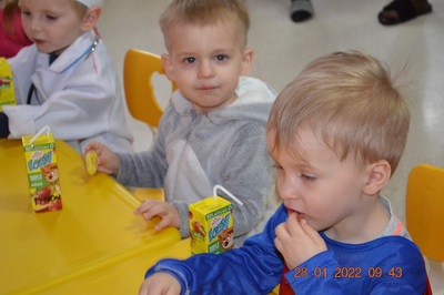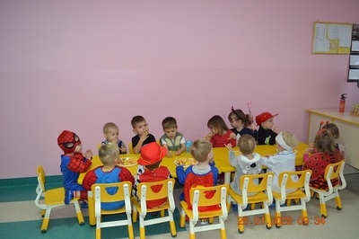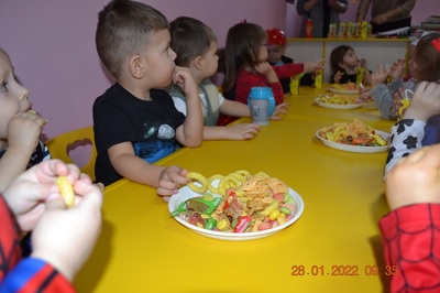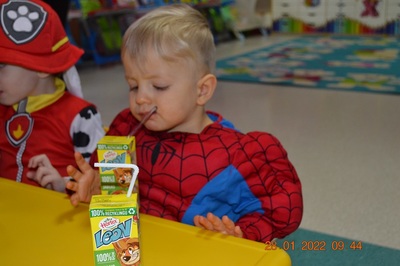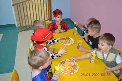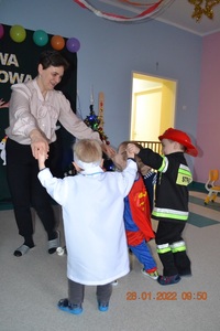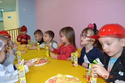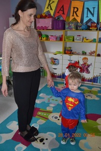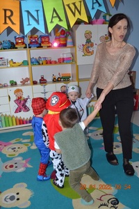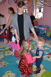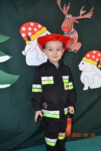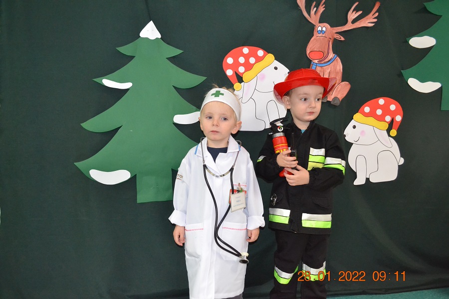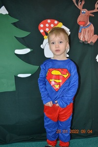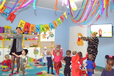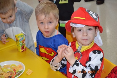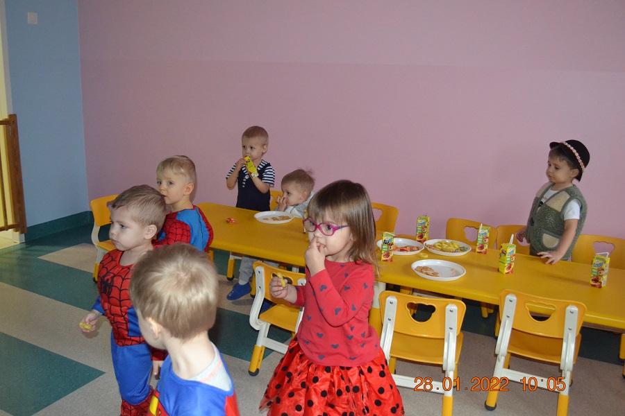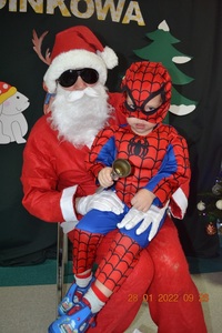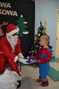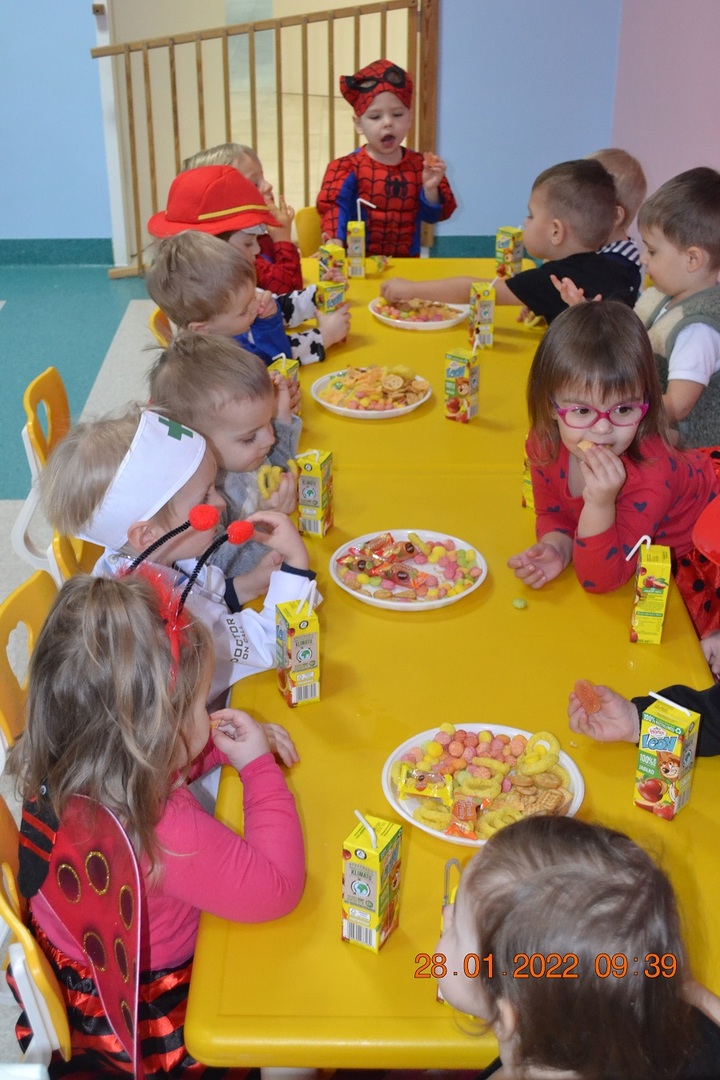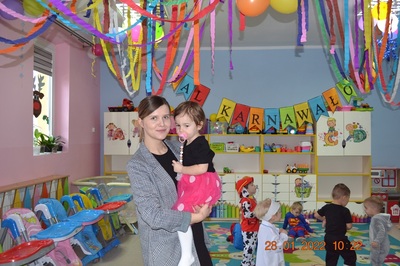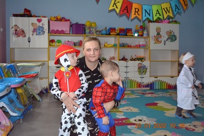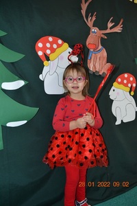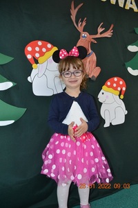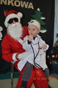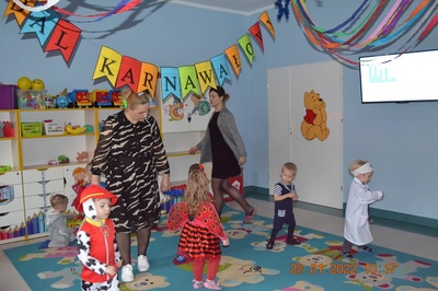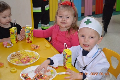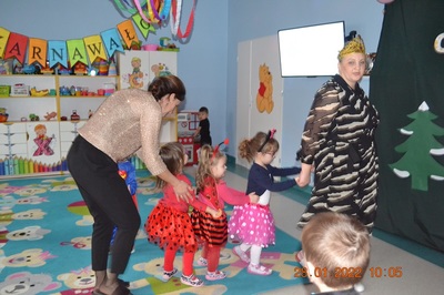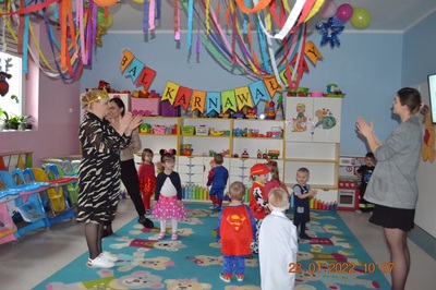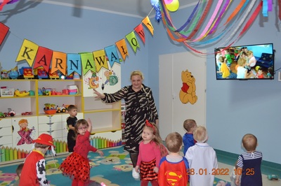 W tym roku połączyliśmy zabawę choinkową z balem karnawałowym. Było wiele wrażeń i dobrej zabawy. Odwiedził nas nawet gość specjalny – Święty Mikołaj. Dzieci otrzymały upominki, za które podziękowały gościowi wspólnym tańce, następnie pożegnały go i rozpoczął się wielki bal karnawałowy. Na bal przybyły księżniczki, wróżki, policjant, strażak i wiele innych postaci z bajek. Był słodki poczęstunek, a czas mijał w rytmach skocznej muzyki przy której dzieci bawiły się bo obiadku.