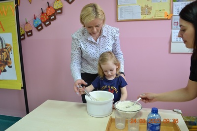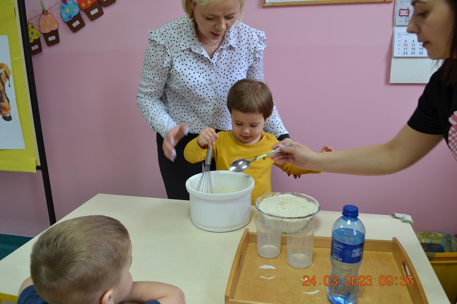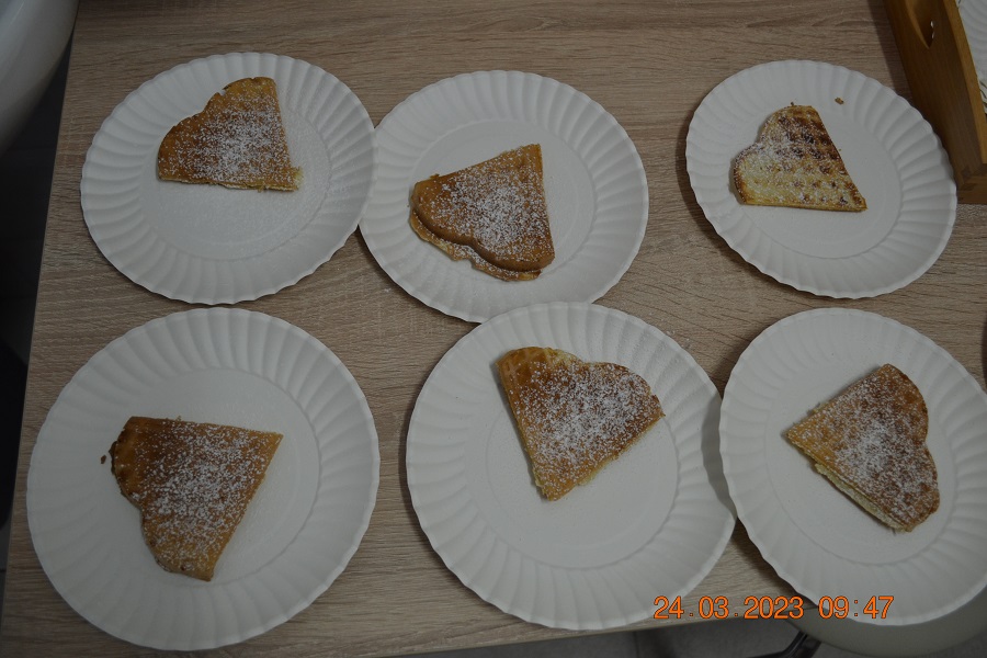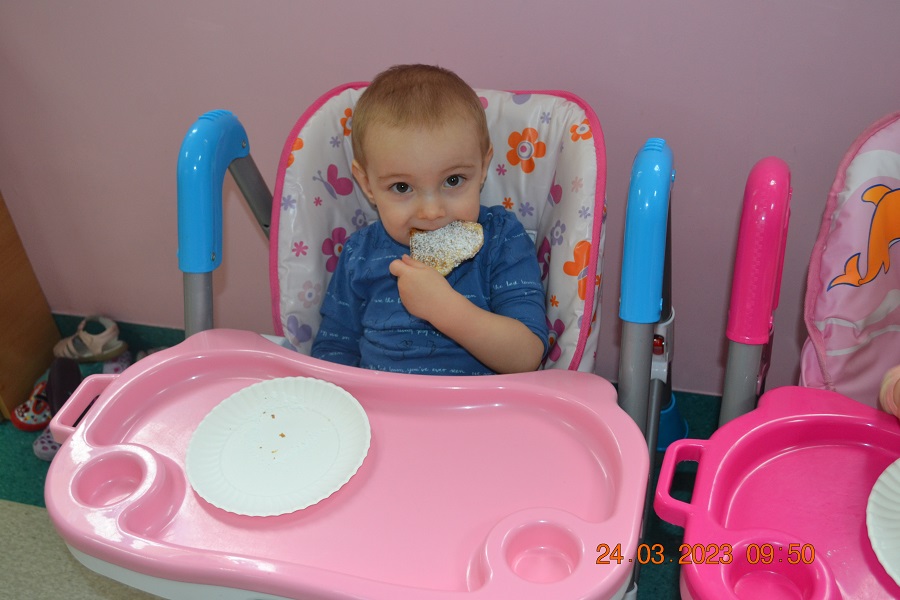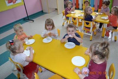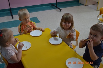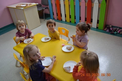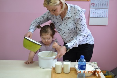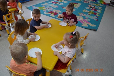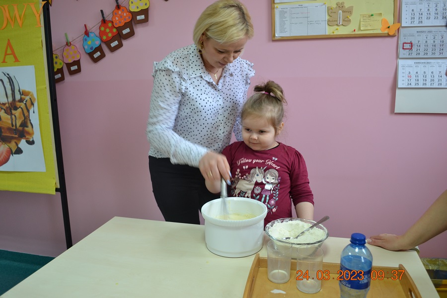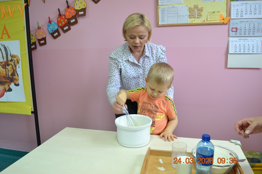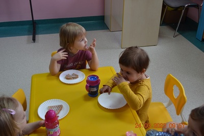 24 marca w kubiku obchodziliśmy "Międzynarodowy dzień gofra". Podczas zajęć dzieci dowiedziały się wielu ciekawostek na temat gofrów. Poznały zasady bezpiecznego korzystania ze sprzętu kuchennego, a także utrwaliły zasady higieny podczas posiłków. W tym dniu dzieci przygotowały ciasto na gofry z mąki, jajek, mleka i innych składników następnie ciocie piekły gofry, a dzieci z ogromnym apetytem zajadały gotowe, ciepłe gofry. Smakowały lepiej niż nad morzem, bo włssnoręcznie wykonane, a głównym składnikiem były serduszka bardzo zaangażowane w wymieszanie składników. Wspólne przygotowanie gofrów było świetną zabawą, a dzieci już pytały kiedy jeszcze będziemy razem przygotowywać te pyszności.