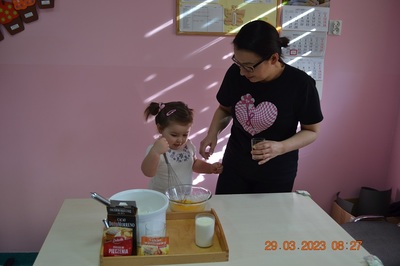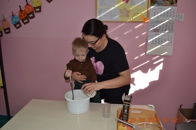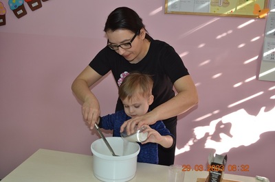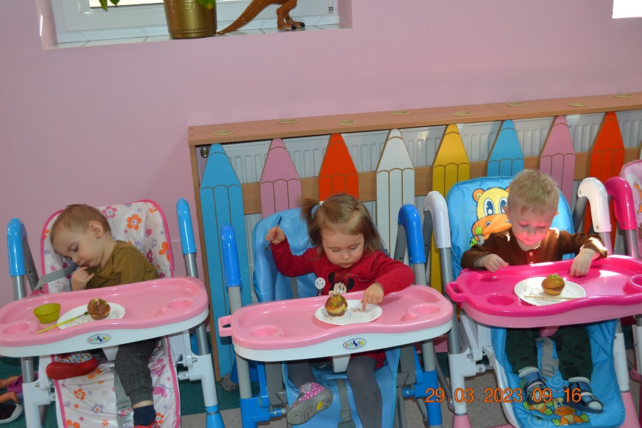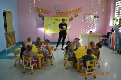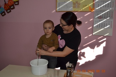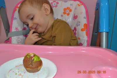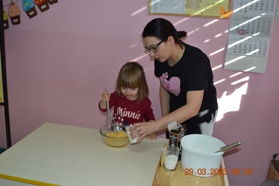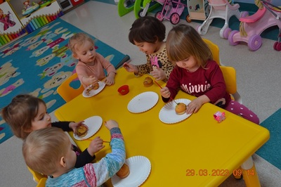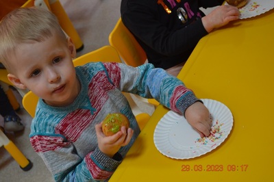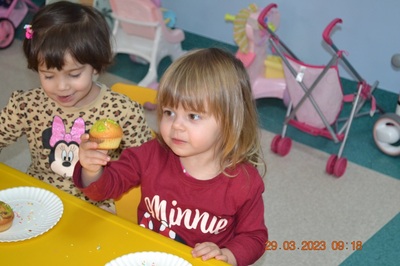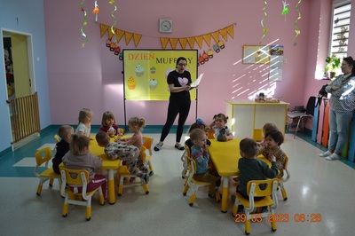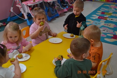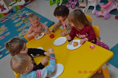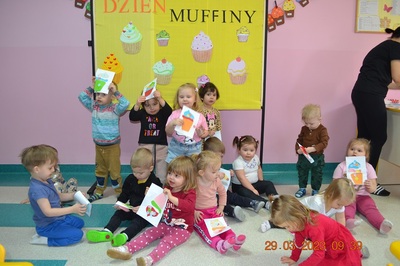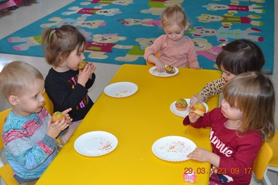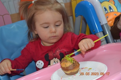 Tematem dzisiejszych zajęć były muffinki. Rozpoczynając dzień dzieci wysłuchały wiersza Olgi Adamowicz "Muffinki", na podstawie którego opowiadały o wyglądzie muffinek - jakie mogą mieć smaki. Ten dzień był też kolejną okazją do zajęć kulinarnych. Dzieci poznały składniki do wypieku muffinek, odmierzały, mieszały i przelewały ciasto do specjalnych sylikonowych papilotek. Czekając na wystygnięcie babeczek dzieci wykonały pracę plastyczną przedstawiającą muffiny. Następnie każde dziecko ozdobiło swoją muffinkę zielonym lukrem i kolorową posypką. Ależ pyszne te babeczki.