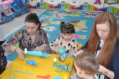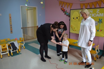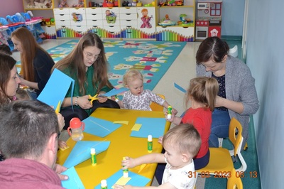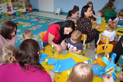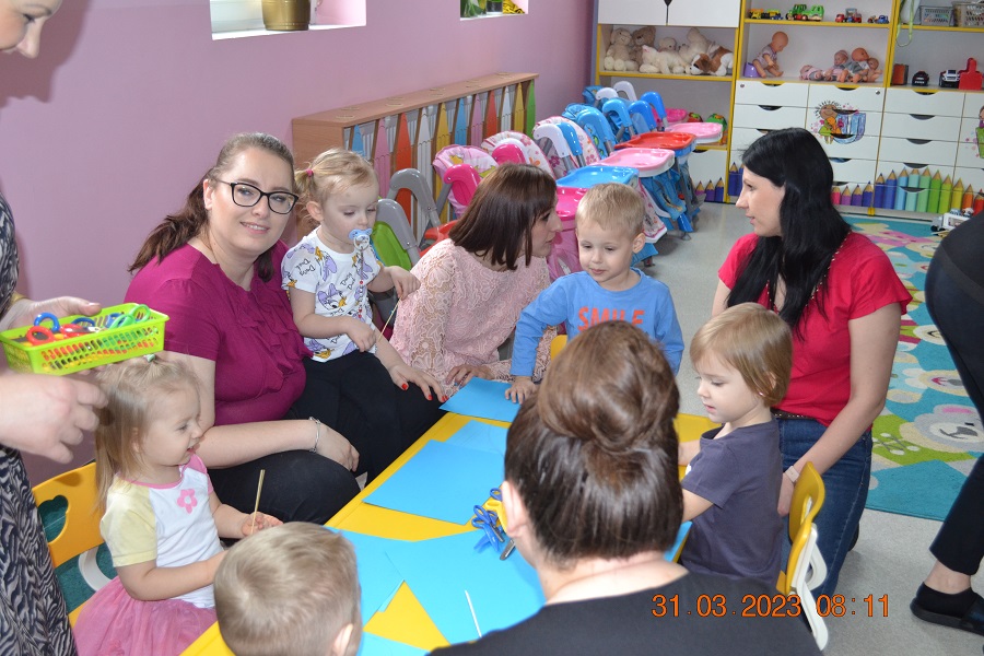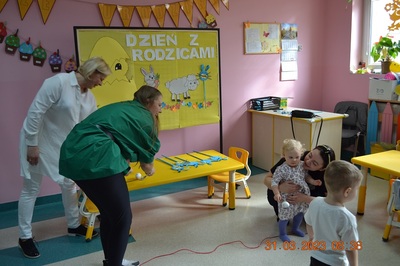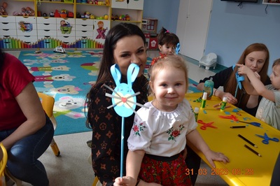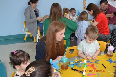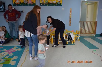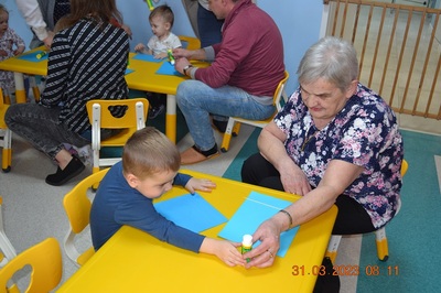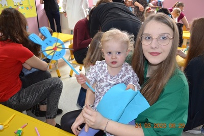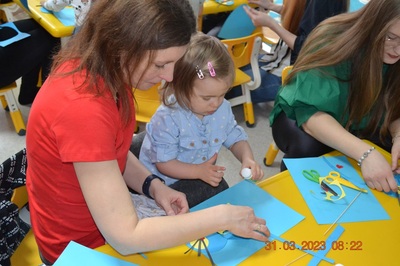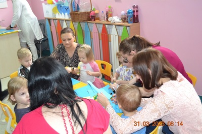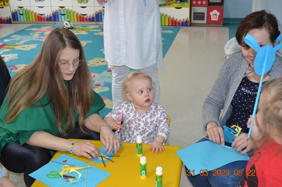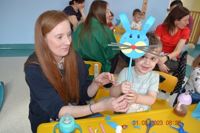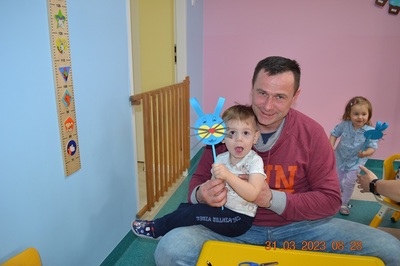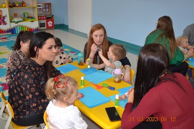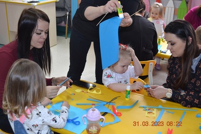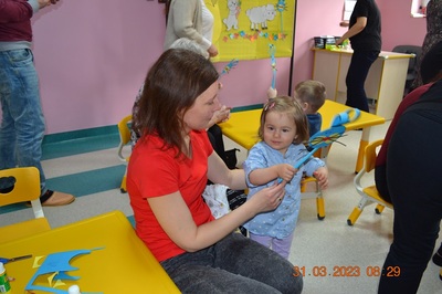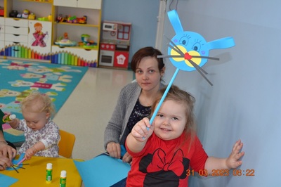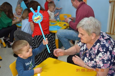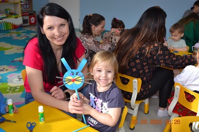 31 marca odbyły się zajęcia otwarte dla rodziców. Tego dnia rodzice zawitali do naszego klubiku, by wspólnie ze swoimi pociechami uczestniczyć w zajęciach. Na początek zajęć czekała dla rodziców i dzieci praca plastyczna pod tytułem "Zajączek". Było to wyzwanie, bo rodzice musieli wycinać nożyczkami plastikowymi, co nie jest łatwe, ale prace zostały wykonane perfekcyjnie.