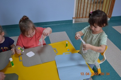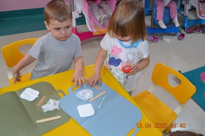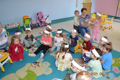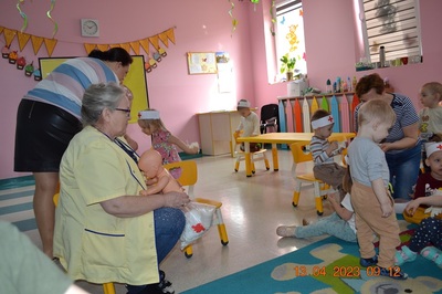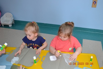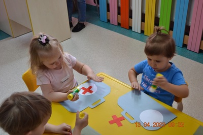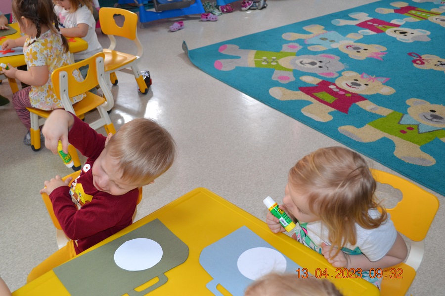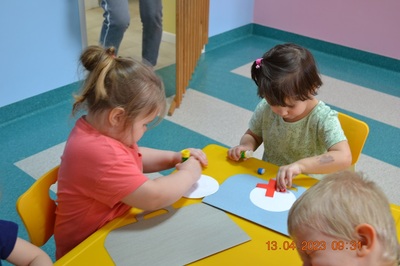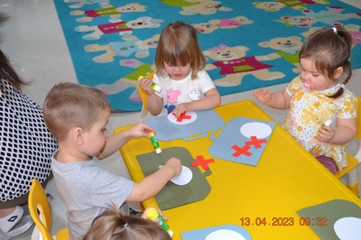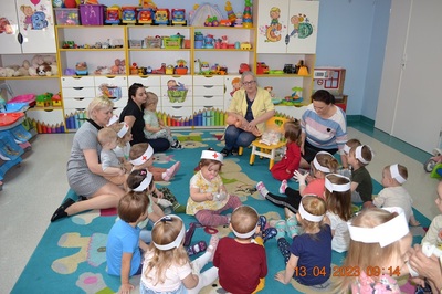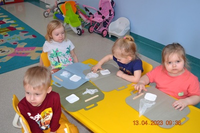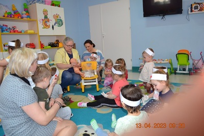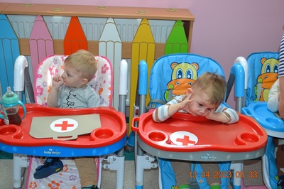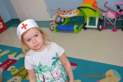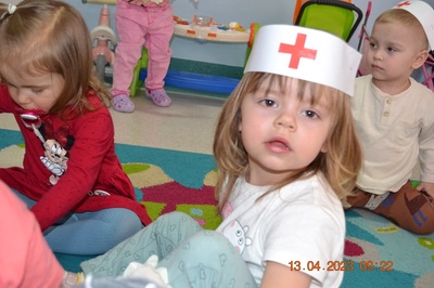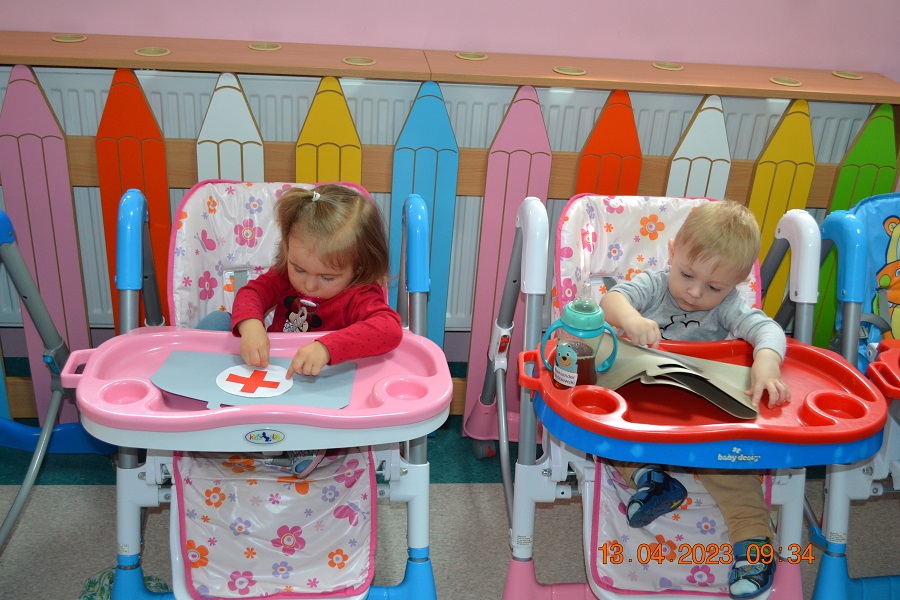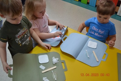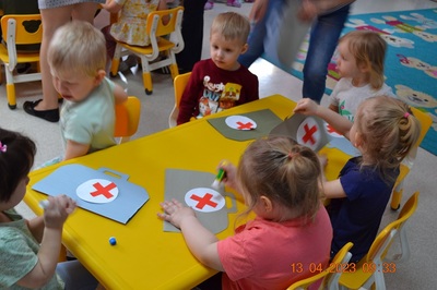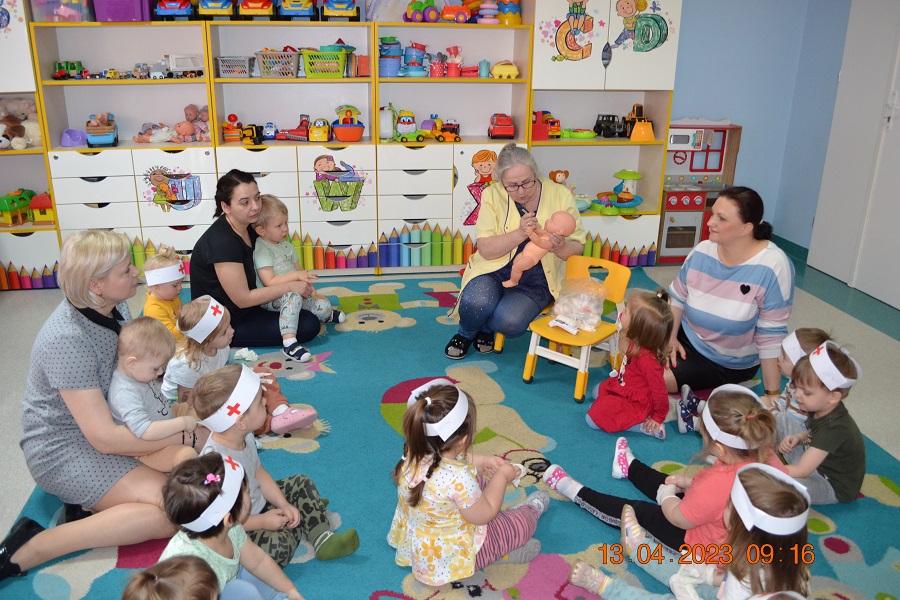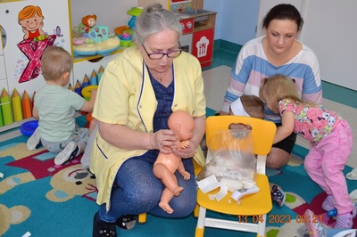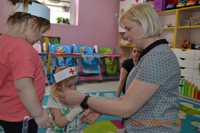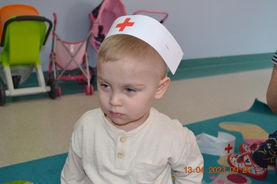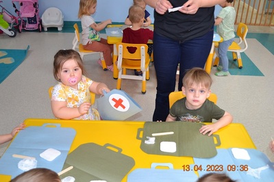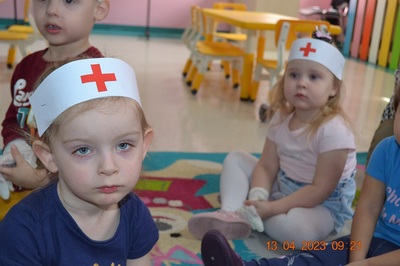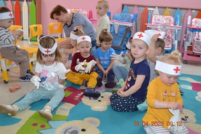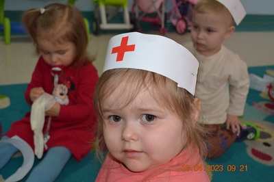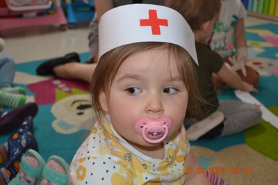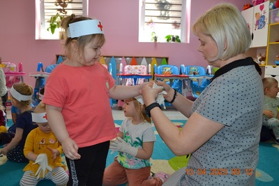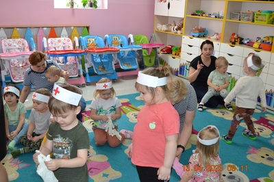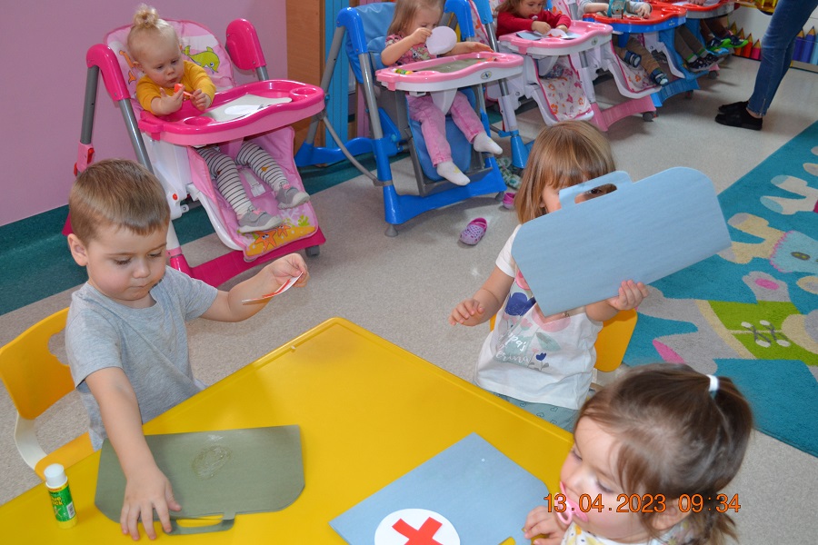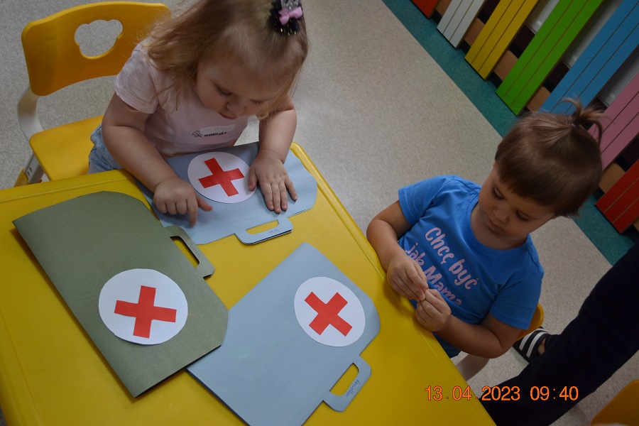 Po omówieniu tego jak trzeba się zachowywać i i co robić jeżeli coś na boli dzieci same zaczęły bawić się w lekarza. Badały lalki i pluszowe misie. Po zabawie zrobiły własne papierowe apteczki w których nie zabrakło plasterka i bandaża.