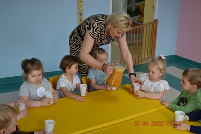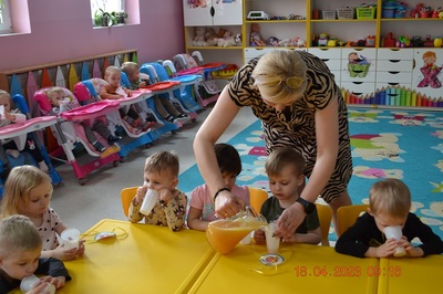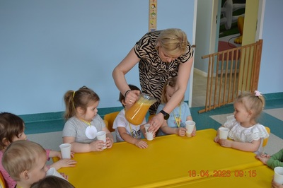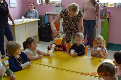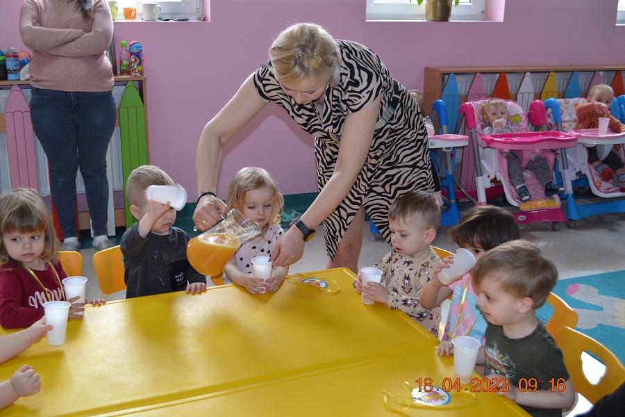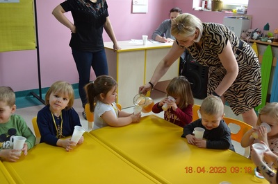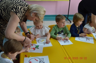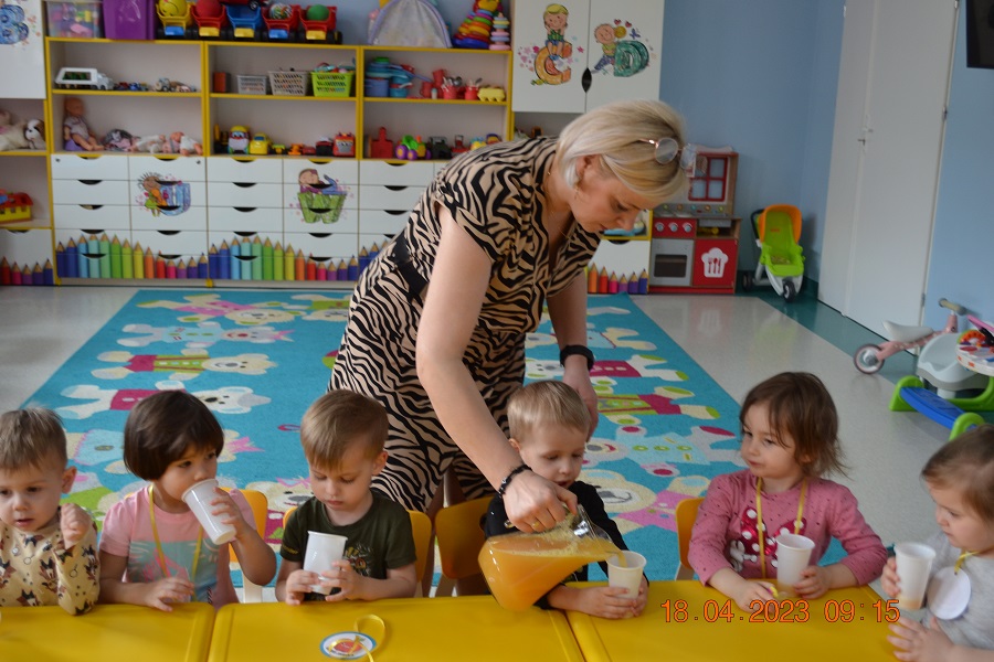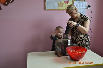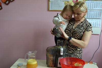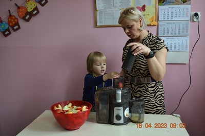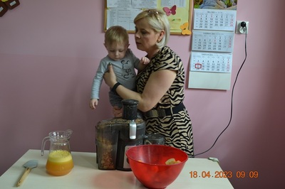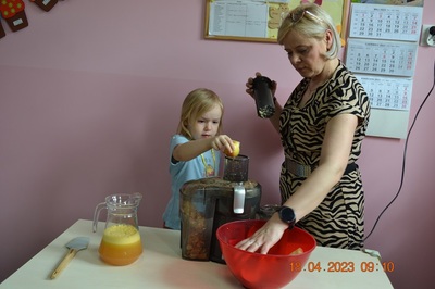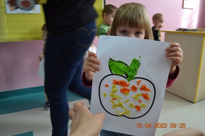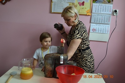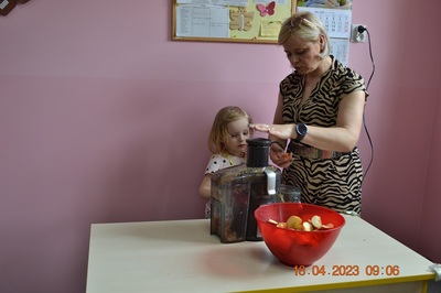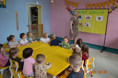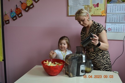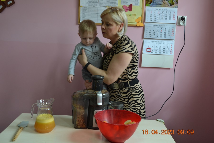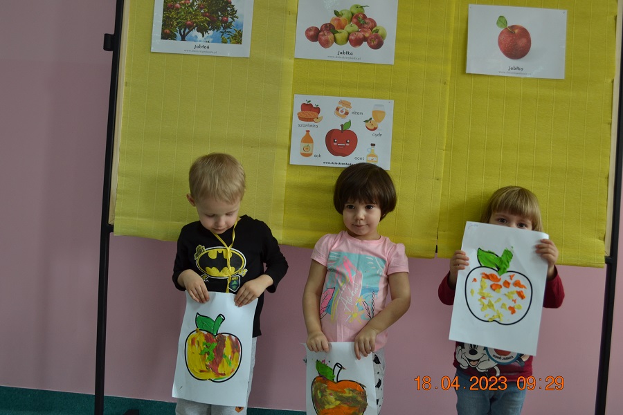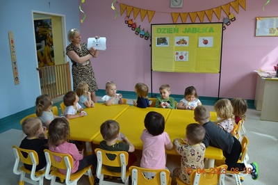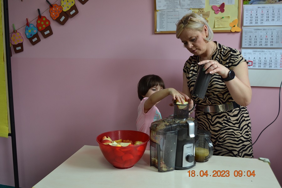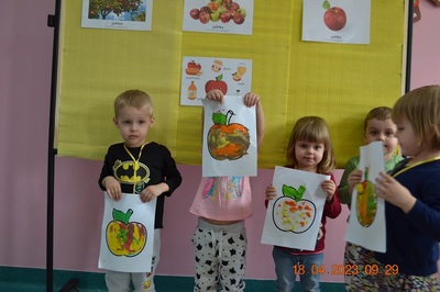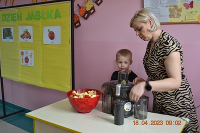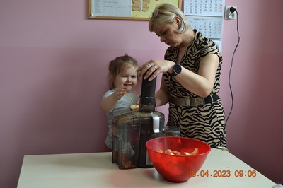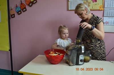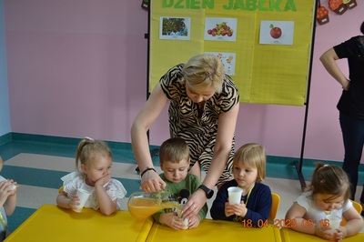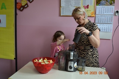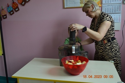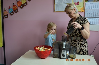 W prosty sposób możemy wytłumaczyć dzieciom, że jabłka trzeba jeść, żeby ładnie wyglądać, żeby nasz brzuszek dobrze pracował, żeby mieć energię do zabawy, żeby być zdrowym. Jabłko jest jednym z pierwszych wprowadzanych produktów do diety małych dzieci, a dokładniej jego przecier. Należy do owoców, które bardzo rzadko powodują objawy niepożądane. Powinniśmy jeść przynajmniej jedno jabłko dziennie. Dlaczego? Jest przynajmniej 10 powodów. Dorośli powinni wiedzieć że :1-jabłka walczą z cholesterolem, 2-są eliksirem młodości, 3-uwielbia je nasze serce, 4-jabłka pomagają schudnąć usprawniając proces trawienia, 5-wspierają układ odpornościowy,6-poprawiają urodę dzięki zawartości wielu minerałów,w tym potasu, żelaza, cynku, krzemu oraz witamin, 7-nie wywołują alergii, 8-odżywiają mózg, 9-dbają o nasze zęby, 10-jabłka wybornie smakują!!! Dużą atrakcją dla dzieci było wyciskanie soku z jabłek i spożywanie świeżutkiego, pysznego soczku.