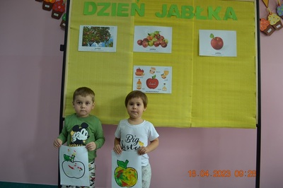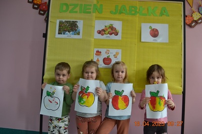 Kolorowy DZIEŃ JABŁKOWY zaliczamy do bardzo udanych i zachęcamy wszystkich do jedzenia jabłek, bo to źródło zdrowia i witamin.