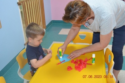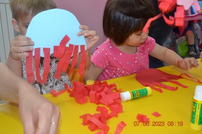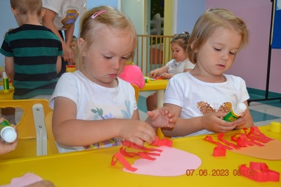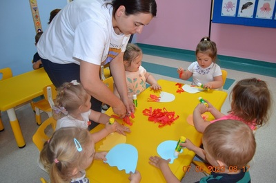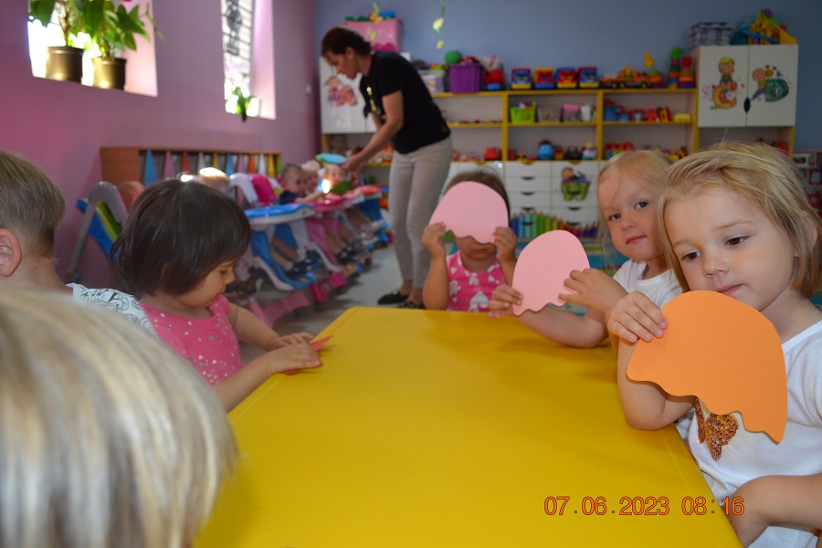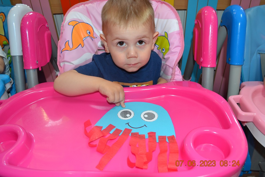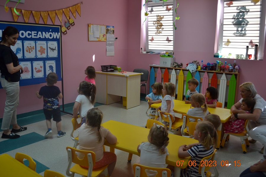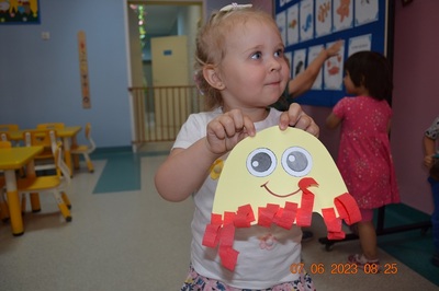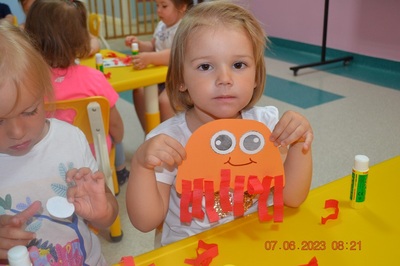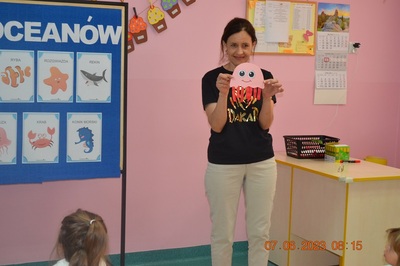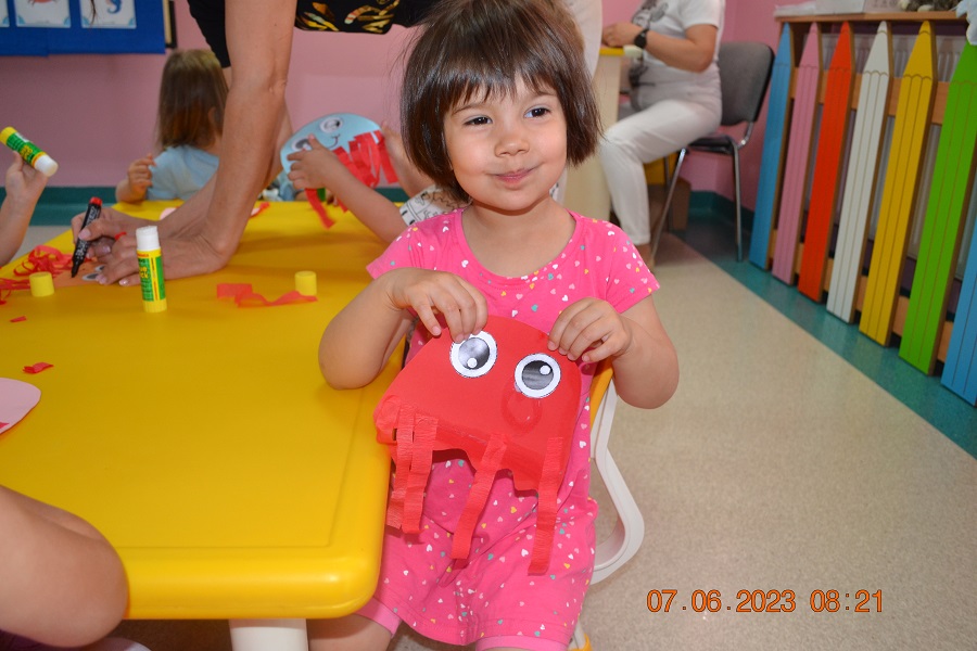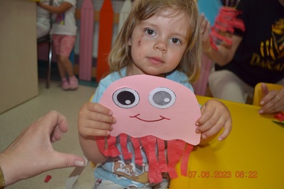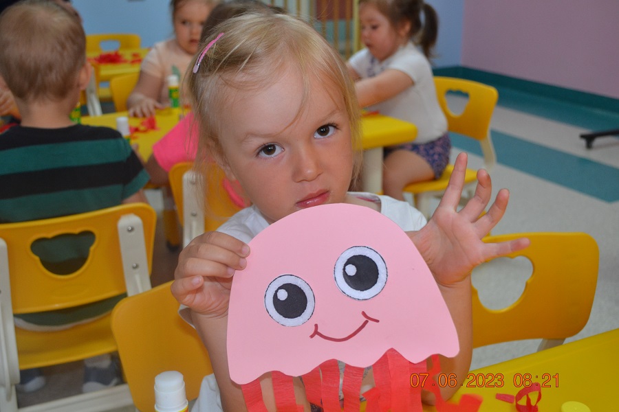 Dnia 7 czerwca obchodziliśmy Światowy Dzień Oceanu. Jest to niezwykle ważny dzień, który przypomina nam, że oceany są skomplikowanym i kruchym organizmem, wciąż pełnym tajemnic. Wraz z atmosferą regulują klimat, pochłaniają dwutlenek węgla, produkują tlen oraz są domem dla wielu zwierząt wodnych. Zajęcia wzbudziły zainteresowanie światem podwodnych głębin, zwierząt i raf koralowych. Maluchy poznały wiele gatunków zwierząt żyjących w głębinach wód. Wszyscy aktywnie uczestniczyli w zajęciach. Na koniec maluchy wykonały piękną pracę plastyczną – Meduzę.