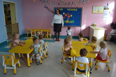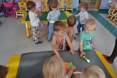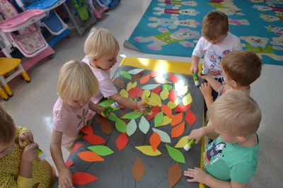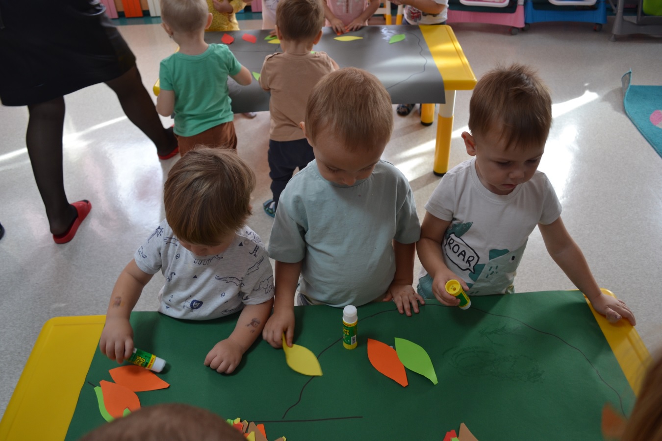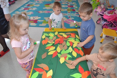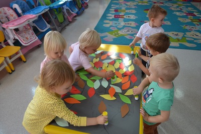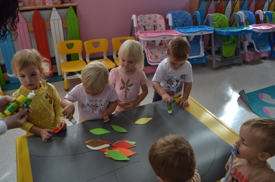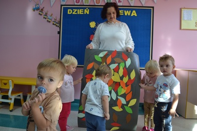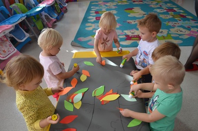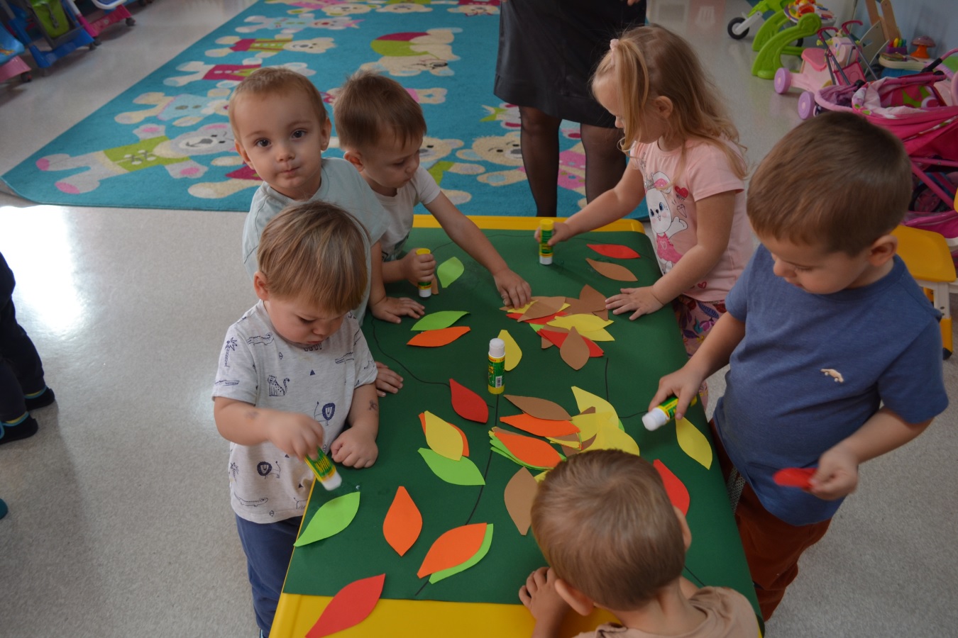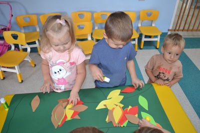 Na dużym brystolu gdzie zostało narysowane drzewo, dzieci przykleiły kolorowe liście. Nasze drzewo było ubrane w kolory jesieni ze względu na porę roku jaką teraz mamy.