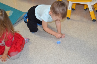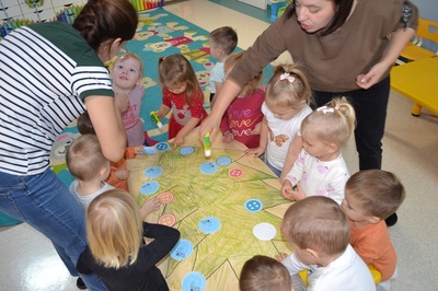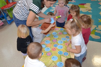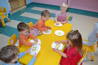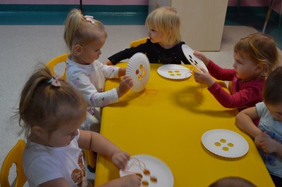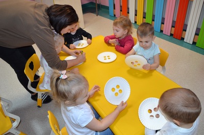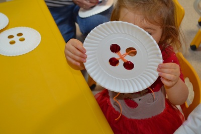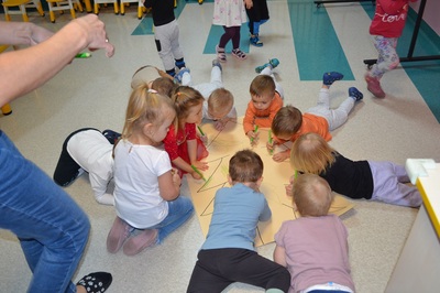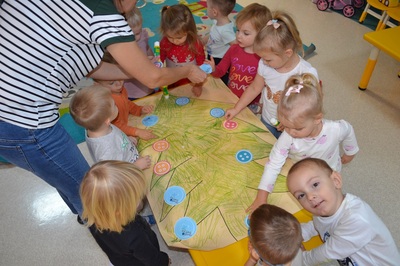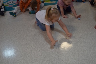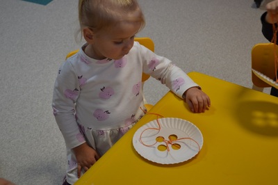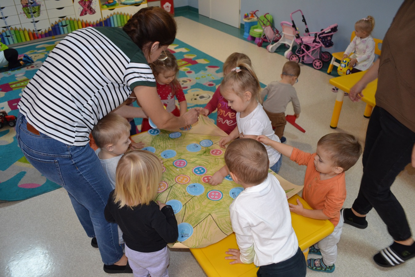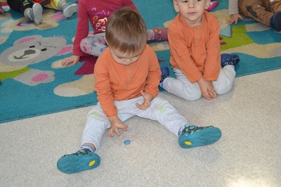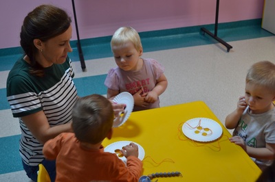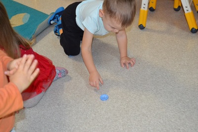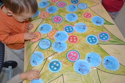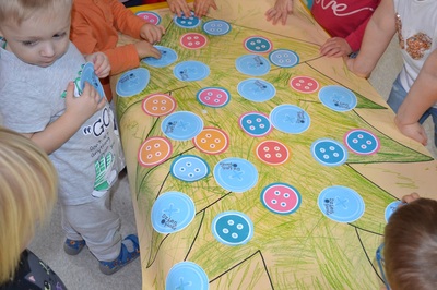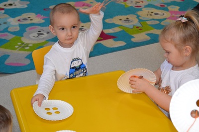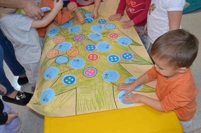 Tego dnia nie zabrakło zabaw z guzikami w roli głównej. Dzieci miały okazję zobaczyć mnóstwo przeróżnych guzików…dużych, małych, okrągłych czy kwadratowych w różnych kolorach. Zabawa guzikami może być naprawdę interesująca. Największą atrakcją okazało się nawlekanie włóczki na papierowy guzik. Dodatkowo zagraliśmy guzikami w „pchełki”.