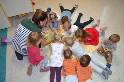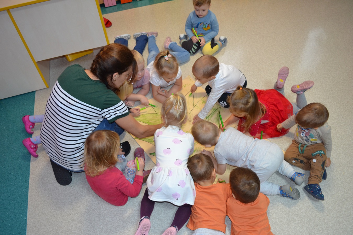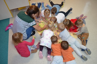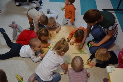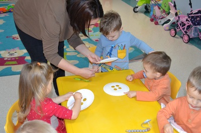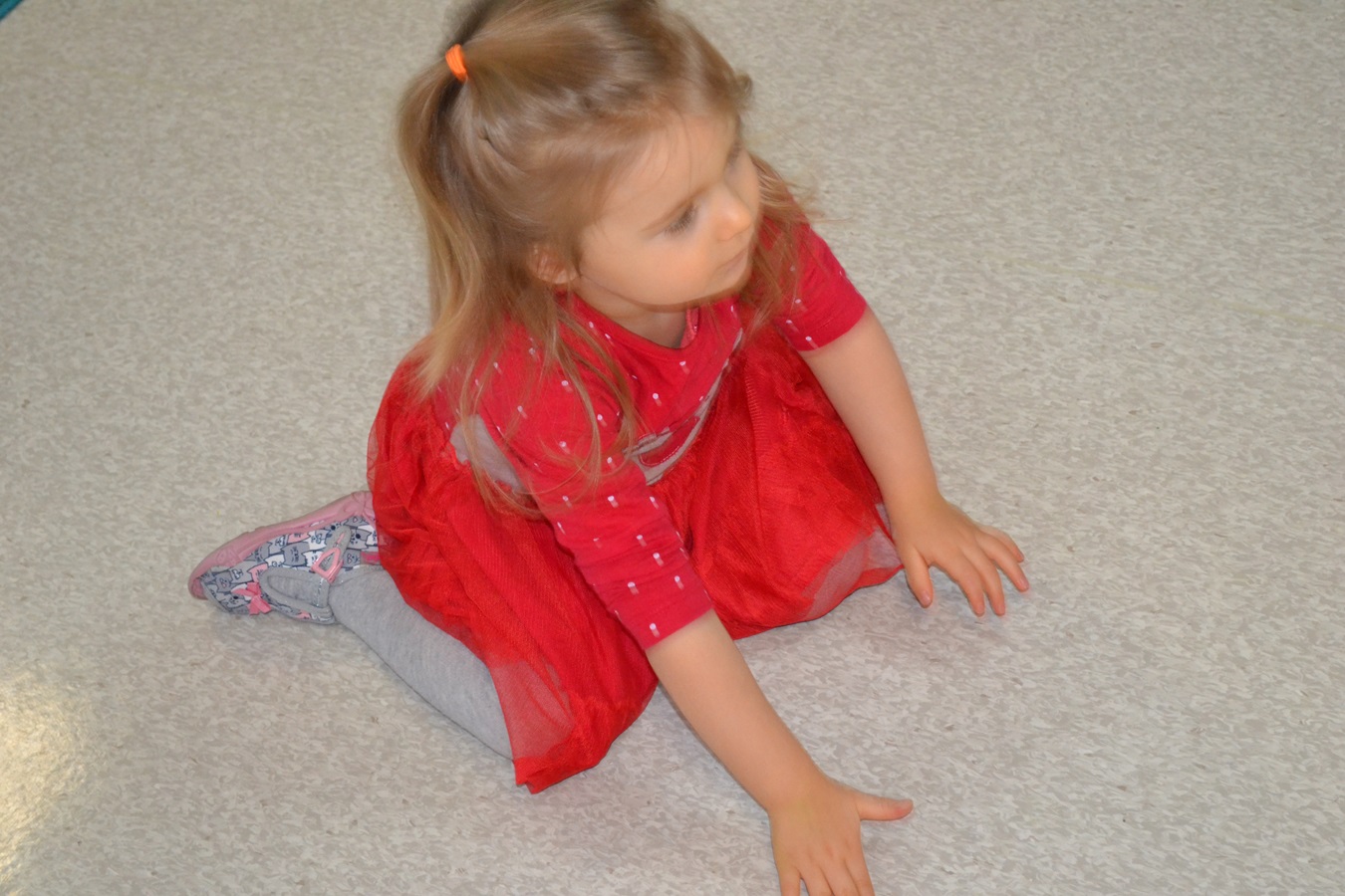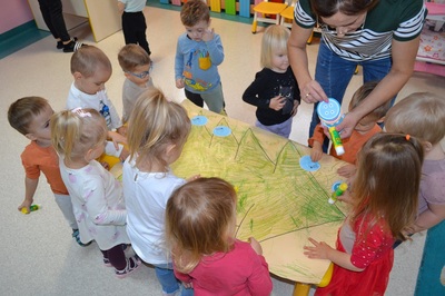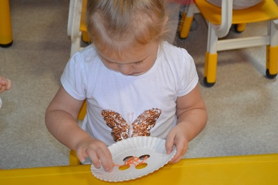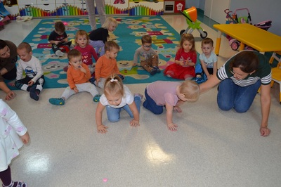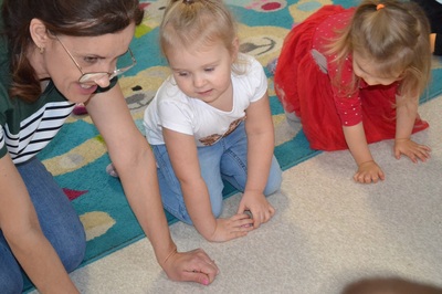 Tego dnia nie zabrakło zabaw z guzikami w roli głównej. Dzieci miały okazję zobaczyć mnóstwo przeróżnych guzików…dużych, małych, okrągłych czy kwadratowych w różnych kolorach. Zabawa guzikami może być naprawdę interesująca. Największą atrakcją okazało się nawlekanie włóczki na papierowy guzik. Dodatkowo zagraliśmy guzikami w „pchełki”.