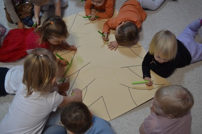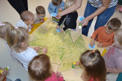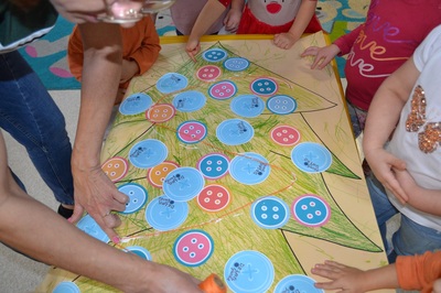 Na zakończenie dnia dzieci udekorowały papierową choinkę, oczywiście z użyciem guzików w roli bombek.