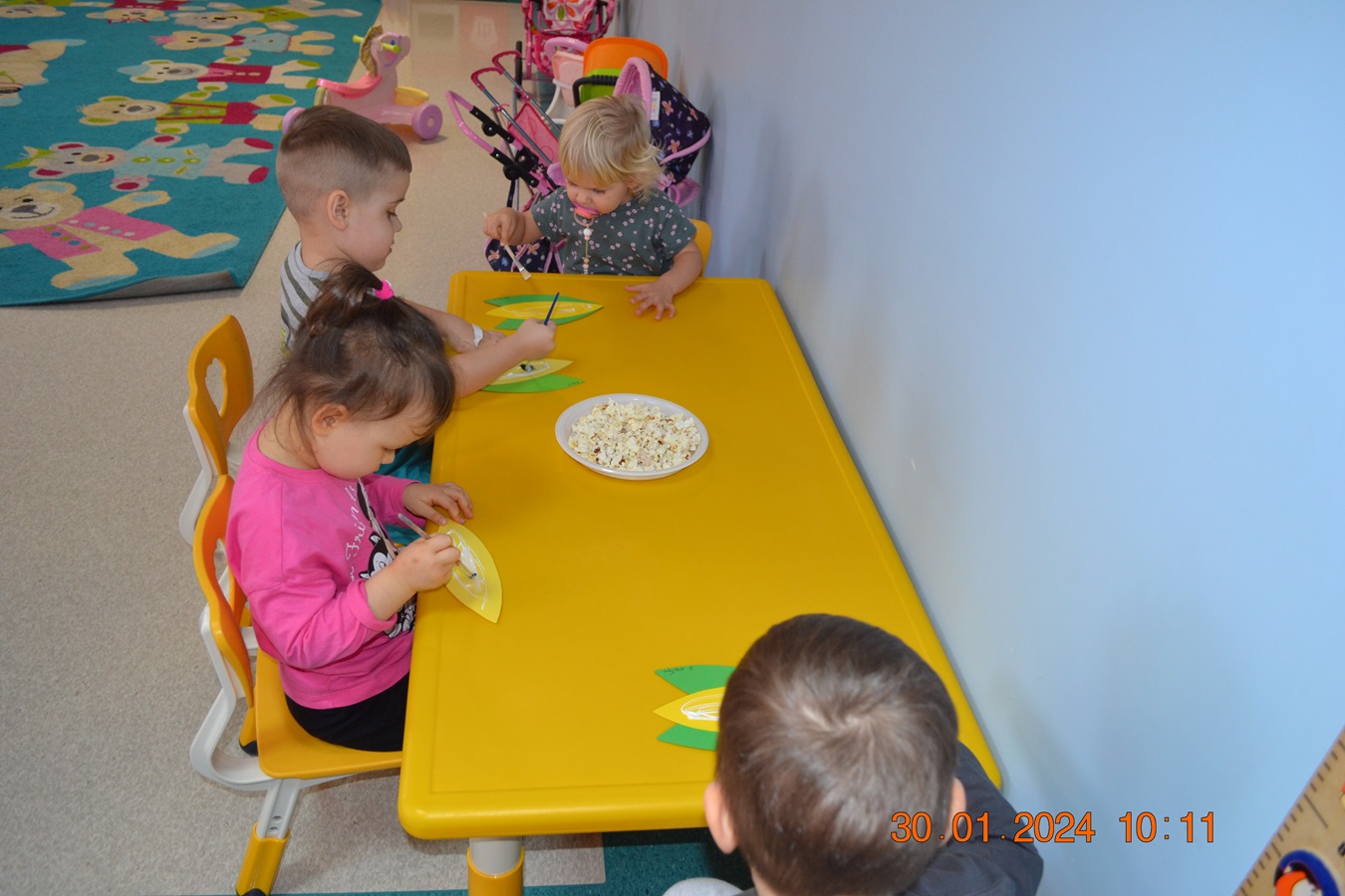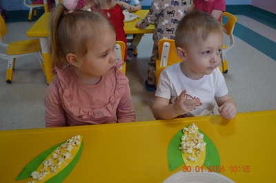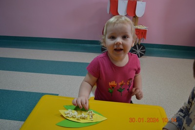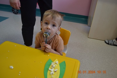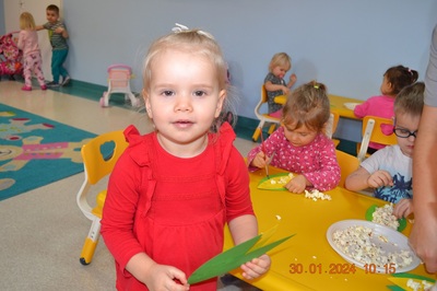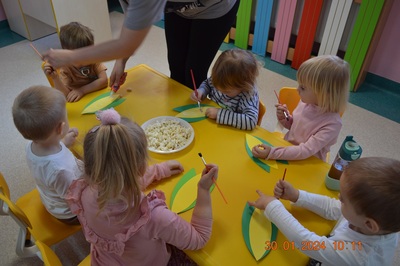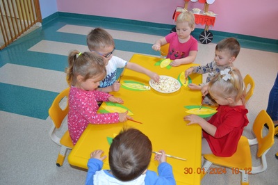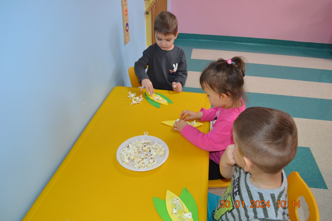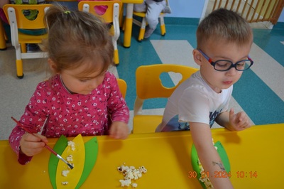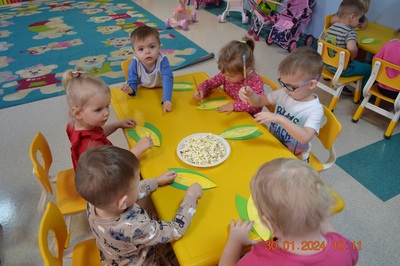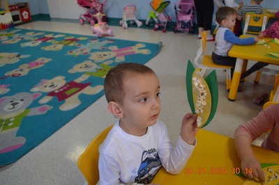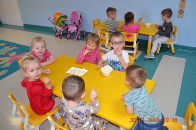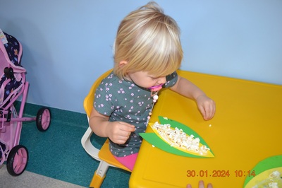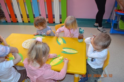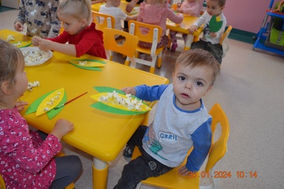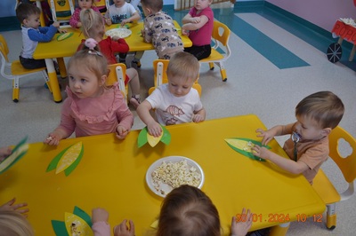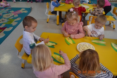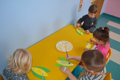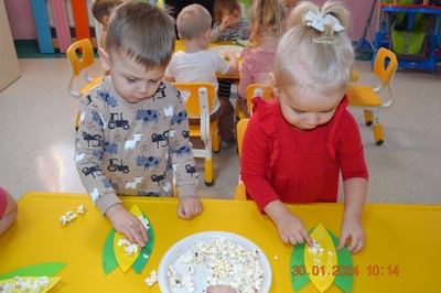 19 Stycznia obchodziliśmy w klubiku nietypowe święto. Nietypowe ale za to jakie pyszne. Najważniejszy tego dnia był przysmak wszystkich dzieci popcorn. Najpopularniejsza przekąska podczas seansów filmowych zarówno tych domowych, jak i w kinach. Jak wiadomo najlepsza nauka jest przez zabawę, dlatego warto wykorzystać święto popcornu, aby rozwijać inne umiejętności dziecka. Popcorn i ziarna kukurydzy mogą służyć nie tylko do jedzenia, ale również do wykonania prac plastycznych, np. wyklejania. Dzieci wykleiły popcornem kolbę kukurydzy z papieru. Zrobione prace zawisły na tablicy.