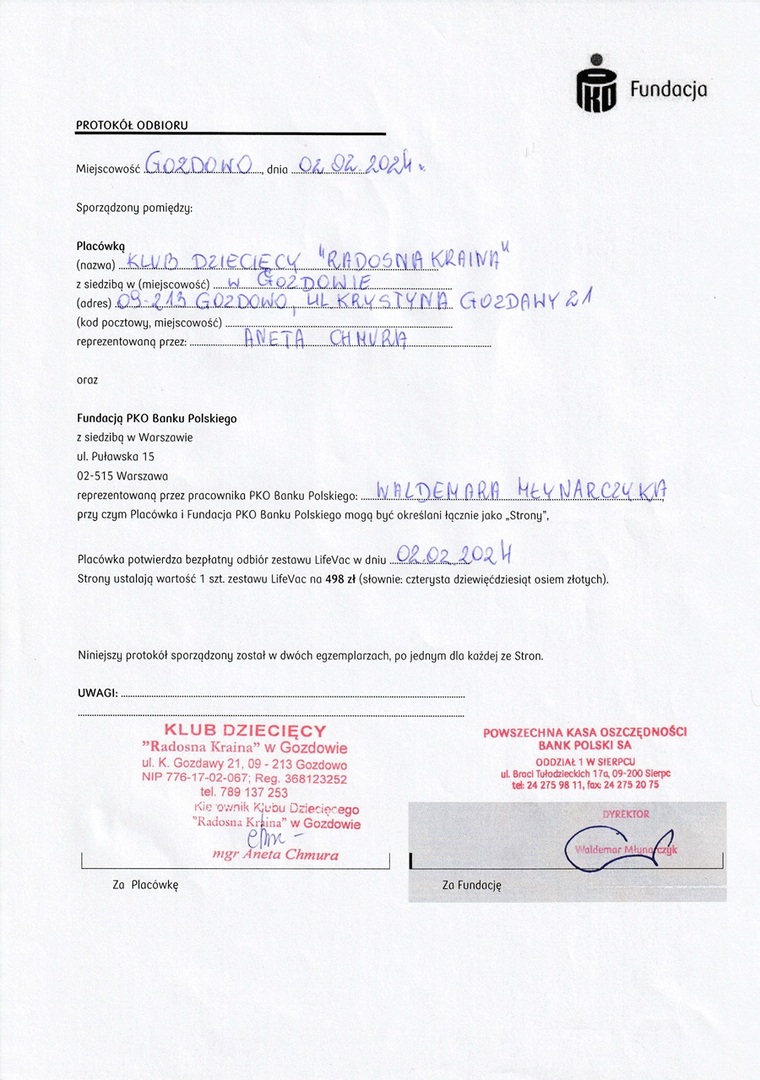 W ramach akcji #PKOdzieciom Fundacja PKO Banku Polskiego zakupiła 1,5 tys. zestawów ratunkowych LifeVac, które szybko i z powodzeniem udrażniają drogi oddechowe osobom, które się krztuszą lub dławią.