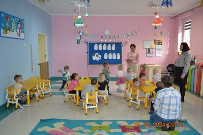 Maluszki aktywnie uczestniczyły w zabawach ruchowych: miałcząc, mrucząc, robiąc koci grzbiet, chlipiąc mleczko. Dzieci wykonywały różnorodne zadania.