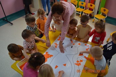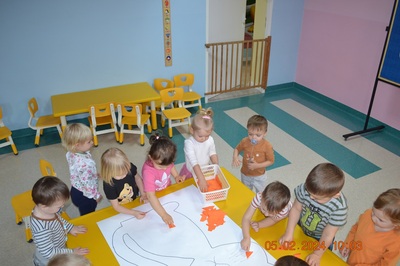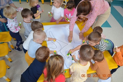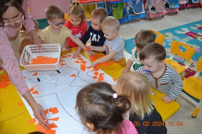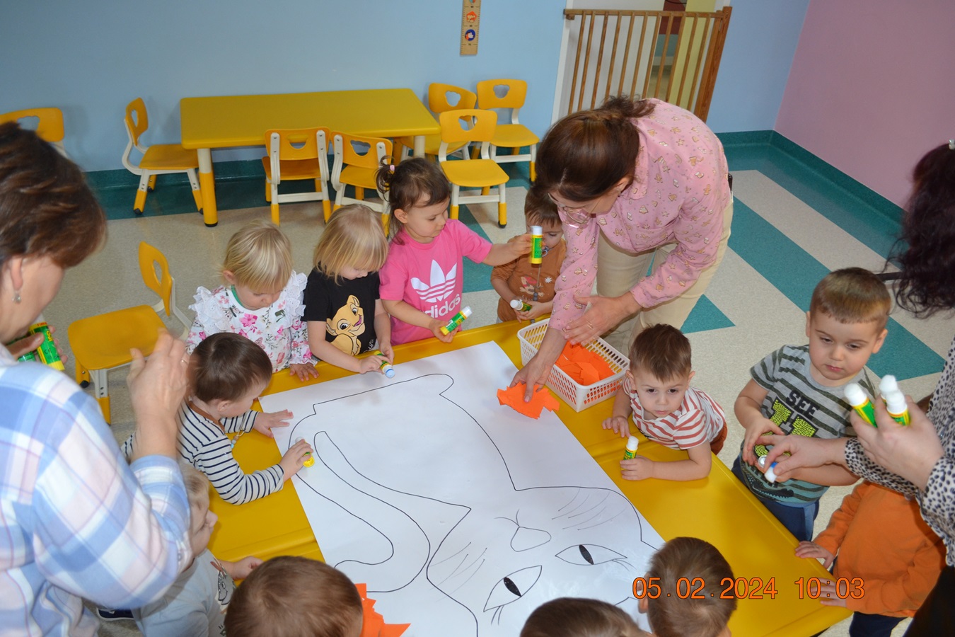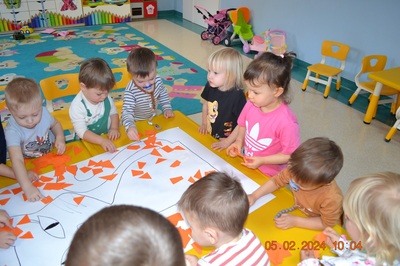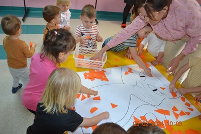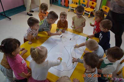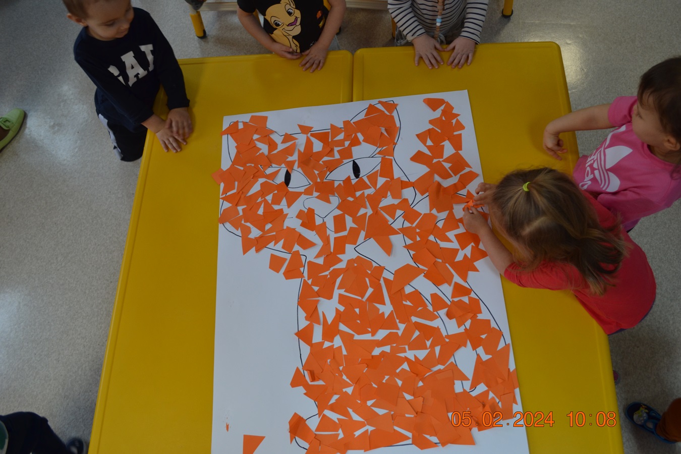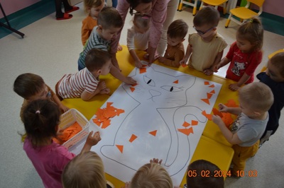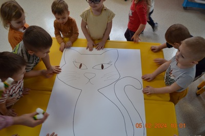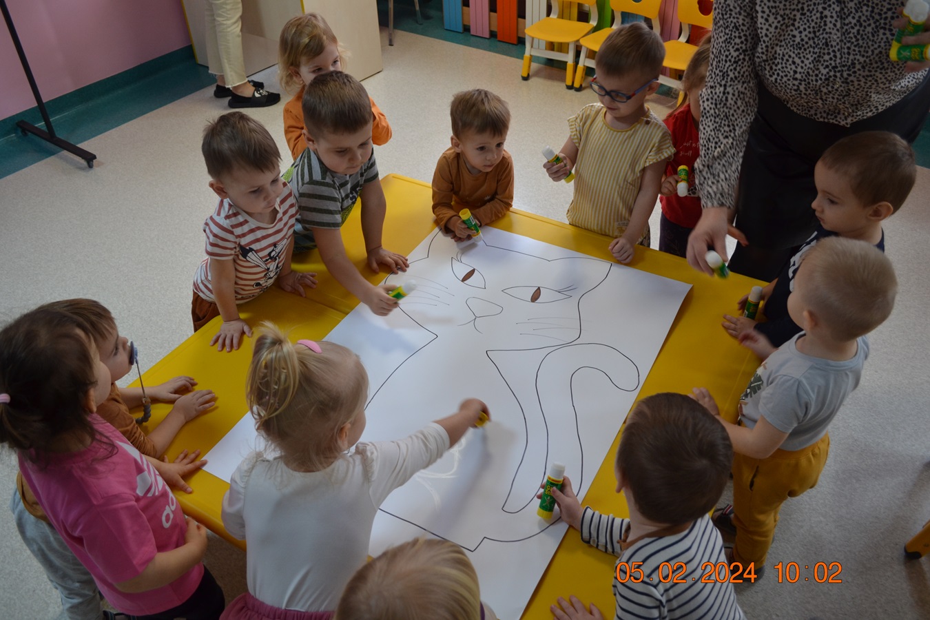 Milusińscy w tym dniu z wielkim zaangażowaniem i wyobraźnią wyklejali sylwetkę kotka. Dzięki temu na klubikowej gazetce pojawiła się przepiękna grupowa praca plastyczna, która wprawiała w dumę i zachwyt rodziców.