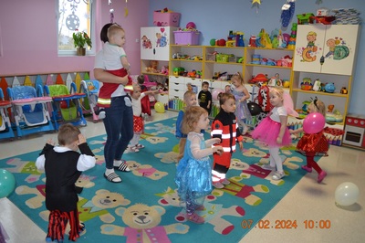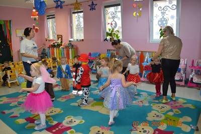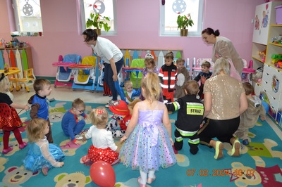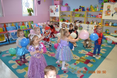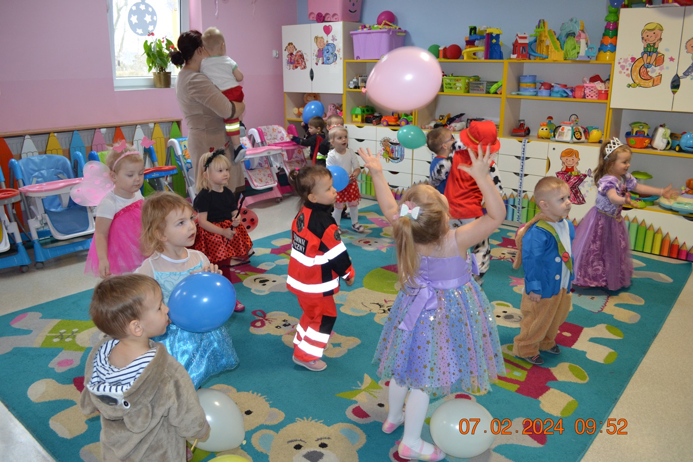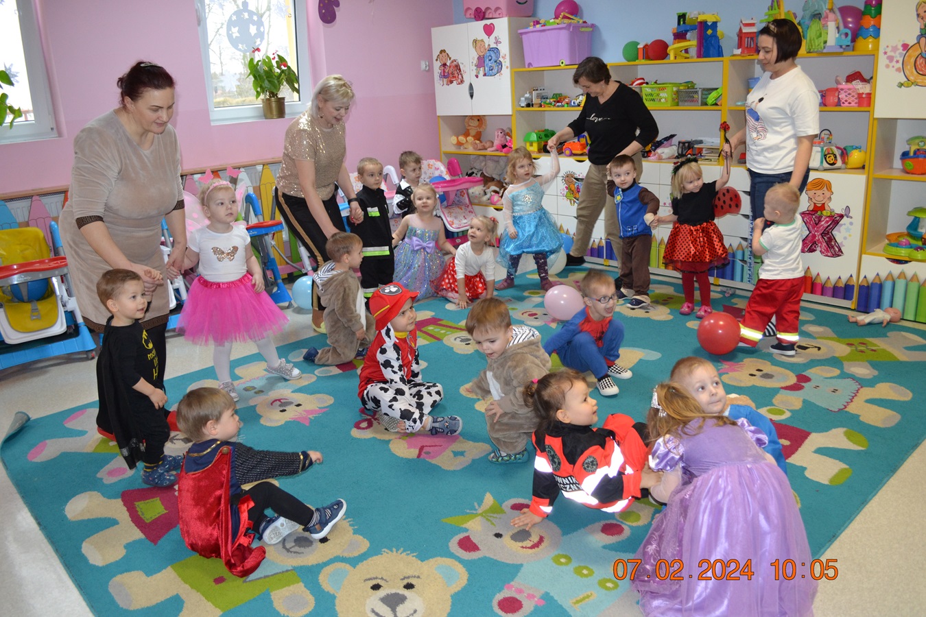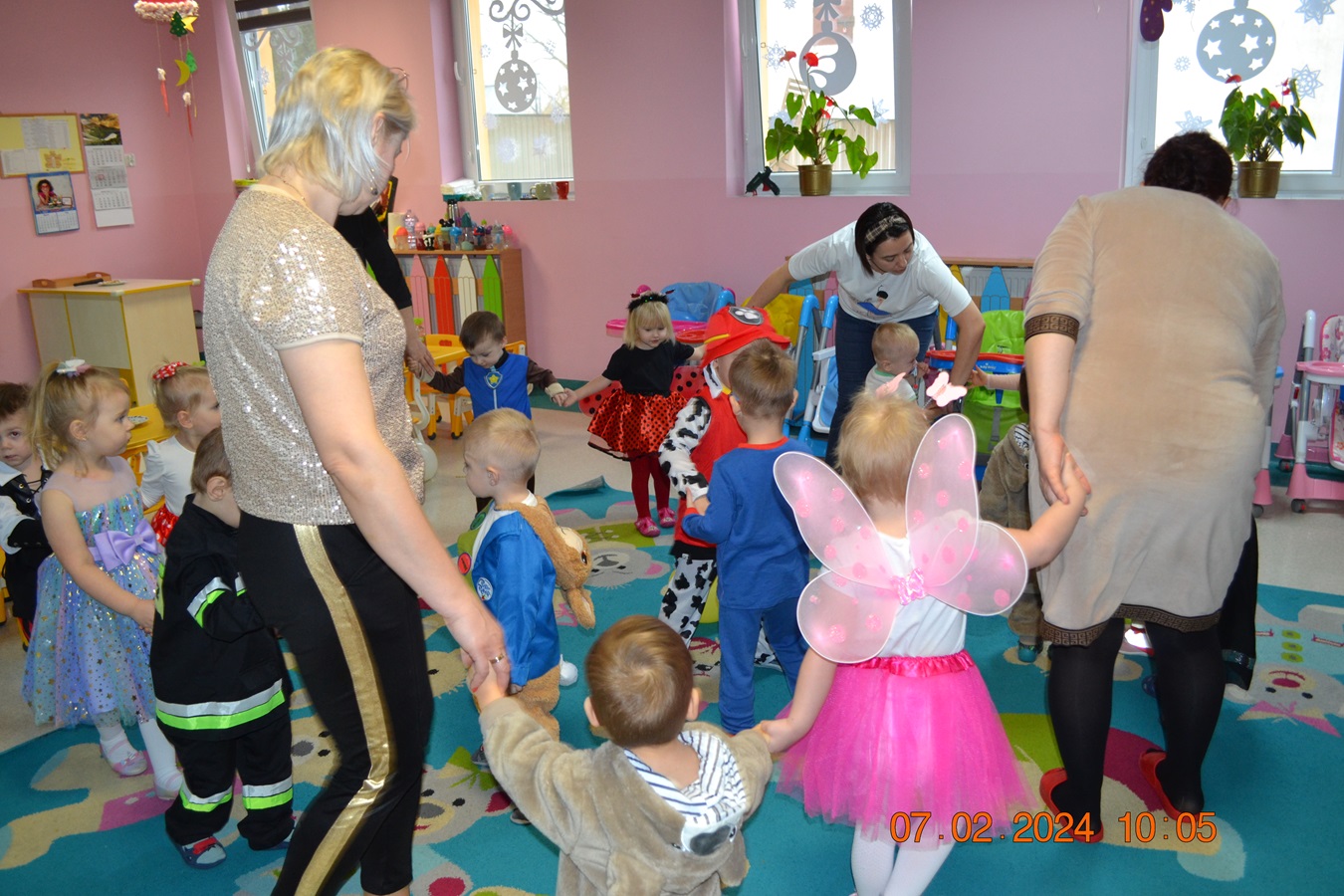 Wszystkie maluszki  z wielką ochotą brały udział w zabawach w rytm muzyki. Rozpoczęły się wesołe tańce i pląsy. Ciocie również zadbały o dodatkowe atrakcje. Dzięki temu maluszki świetnie się bawiły, rozwijały swoją wyobraźnię, kreatywność i umiejętności społeczne. Tego dnia milusińscy mogli przenieść się do świata swoich marzeń i poczuć się wyjątkowo, panował klimat beztroskiej zabawy.