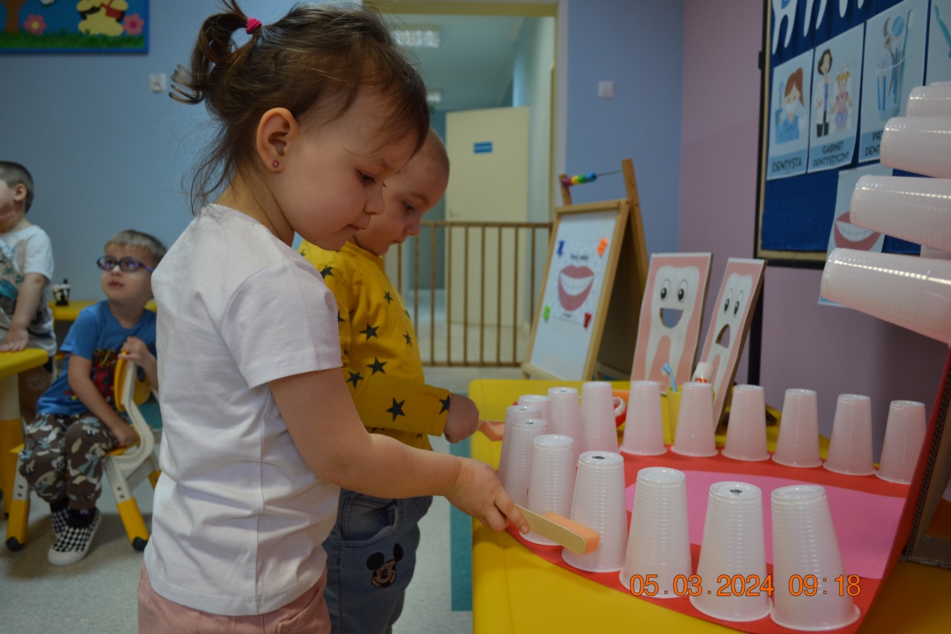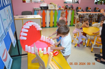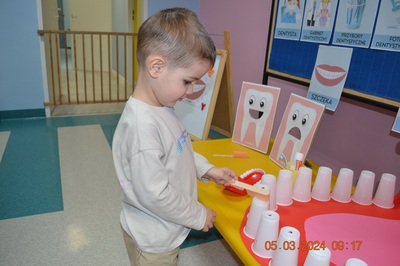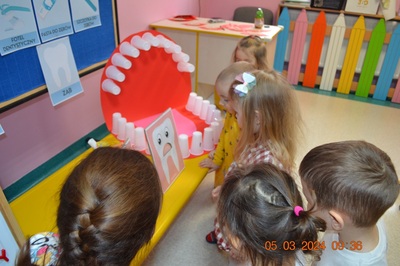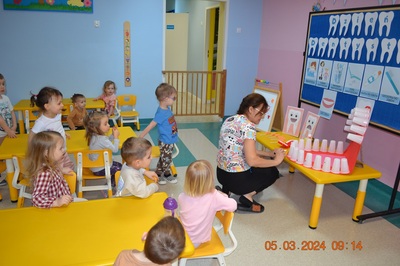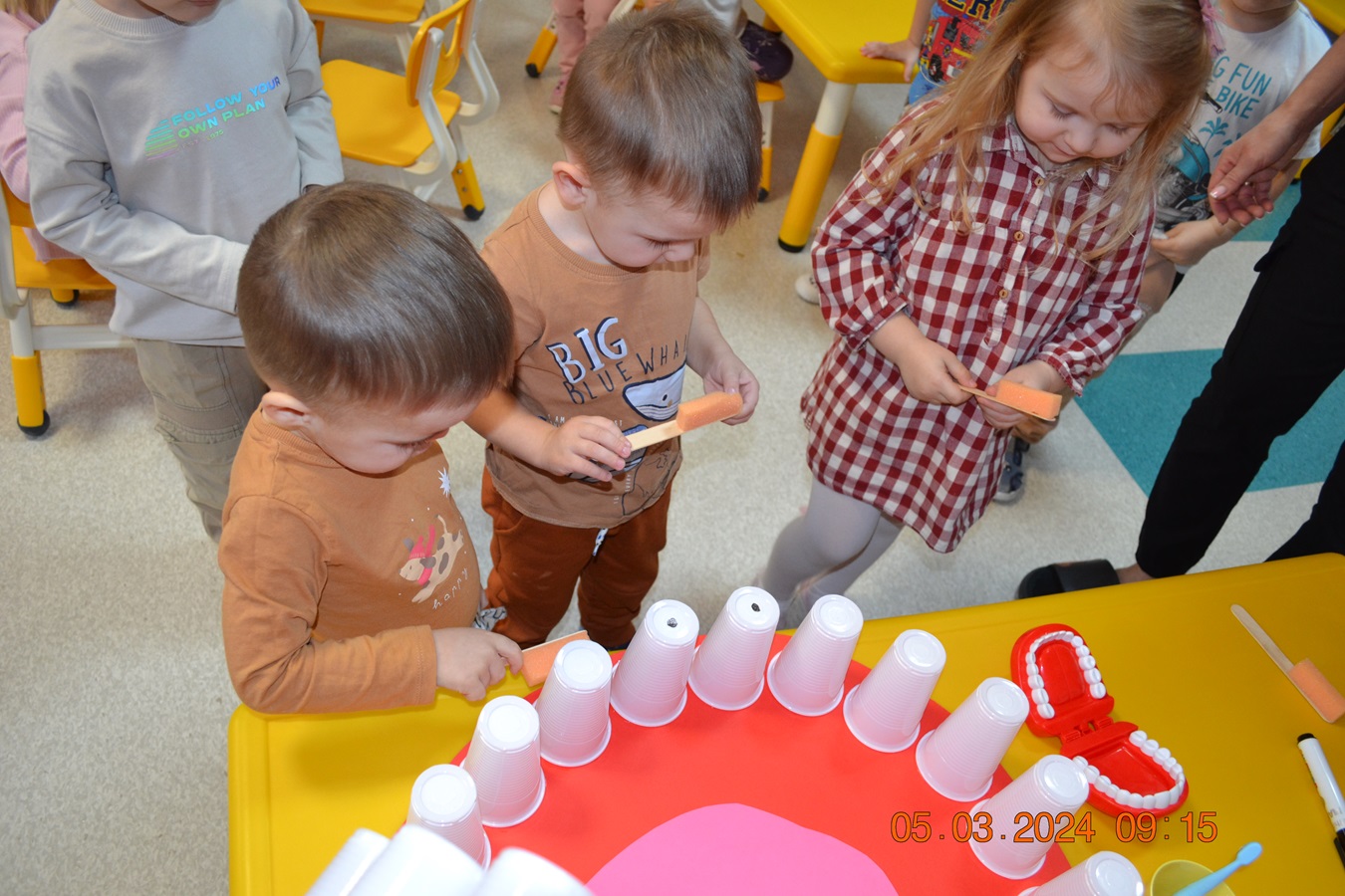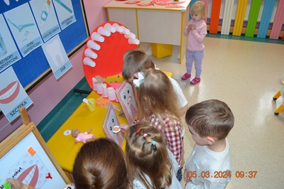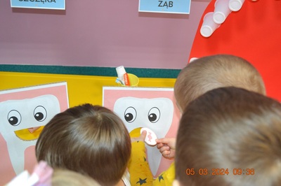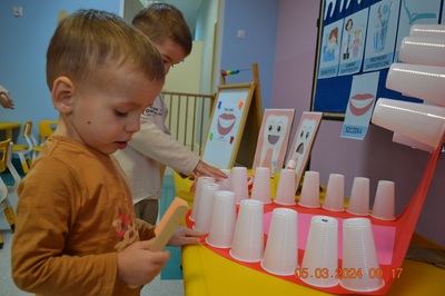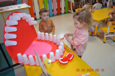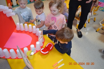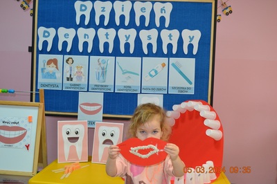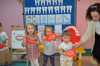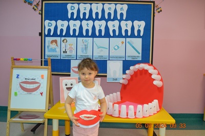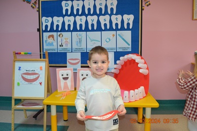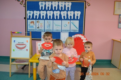 Dnia 5 marca obchodziliśmy w naszym klubiku "Dzień Dentysty". Maluszki miały okazję dowiedzieć się jak dbać o higienę jamy ustnej, aby ząbki były zawsze zdrowe, a uśmiech błyszczał czystością. Zwrócono także uwagę dzieci na etapy mycia zębów oraz na systematyczne kontrolowanie stanu uzębienia. Podkreślono jak ważna dla zdrowych zębów jest dieta bogata w owoce i warzywa oraz produkty mleczne. Dzieci dowiedziały się również (choć z wielkim smutkiem), że słodycze mają negatywny wpływ na nasze zęby. Po tym dniu maluszki wiedzą co to jest próchnica, co ją powoduje oraz jak jej zapobiegać Prowadzenie tego typu działań edukacyjnych ma na celu wdrożenie dzieci do codziennego szczotkowania zębów i dbania o higienę jamy ustnej ale również niwelowanie lęku i strachu przed wizytą u stomatologa. Na zakończenie dzieci wykonały pracę plastyczną przedstawiająca czyste i błyszczące zęby.