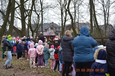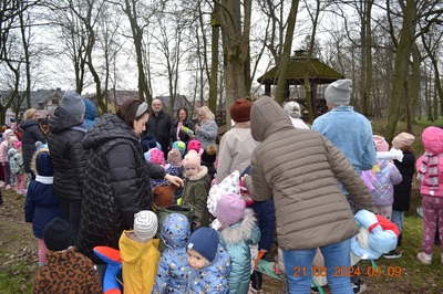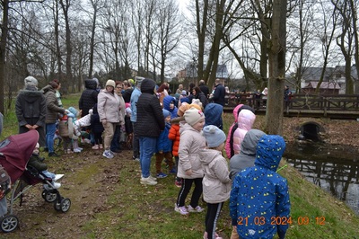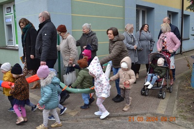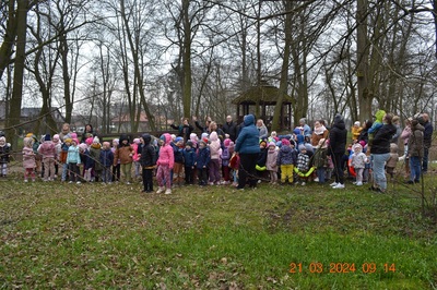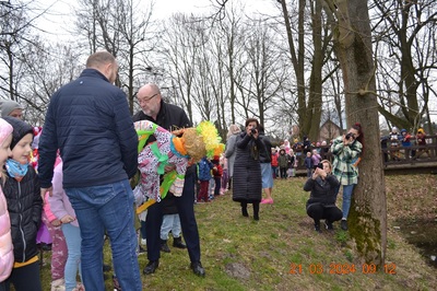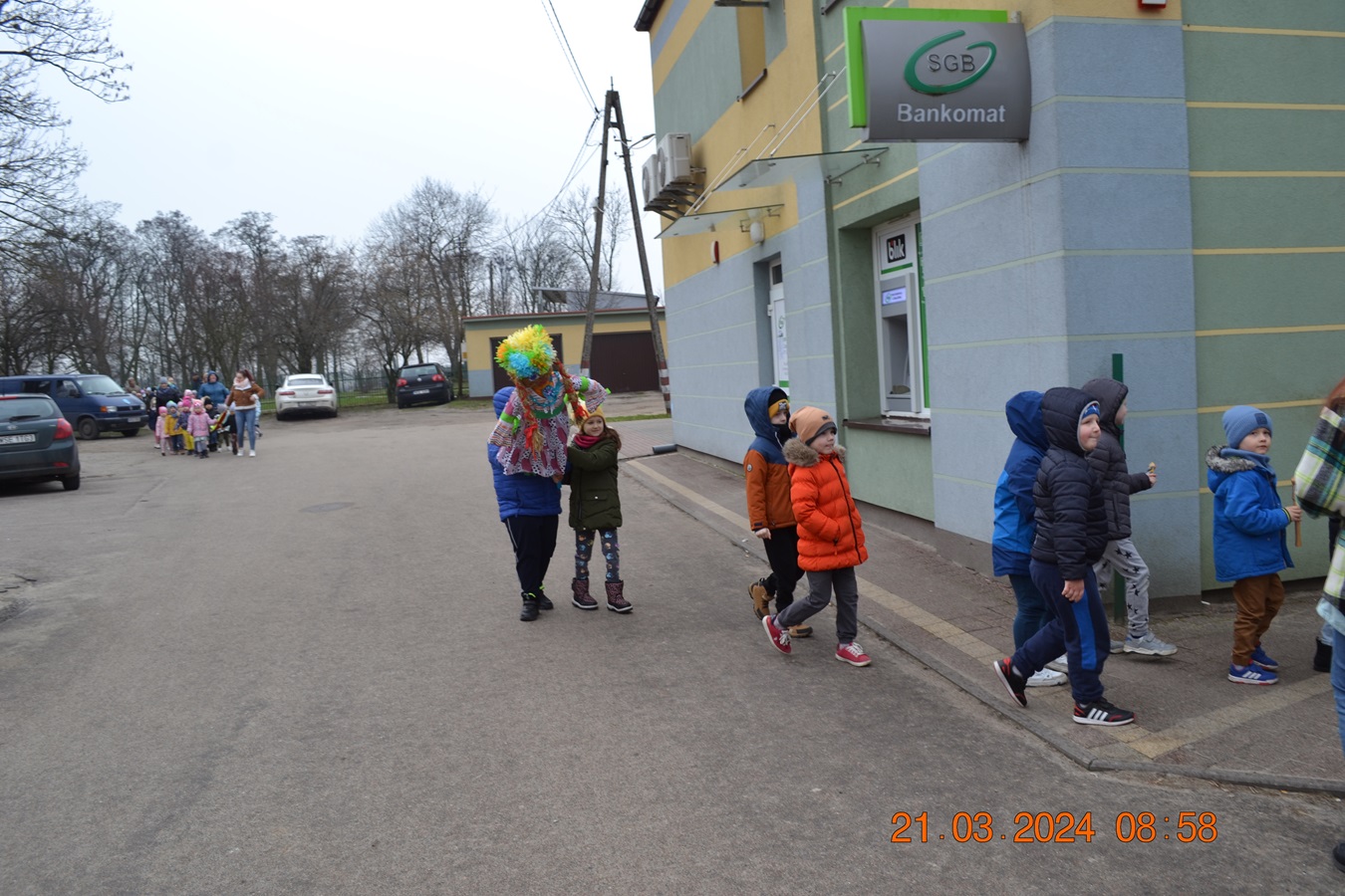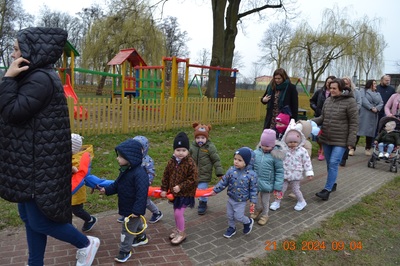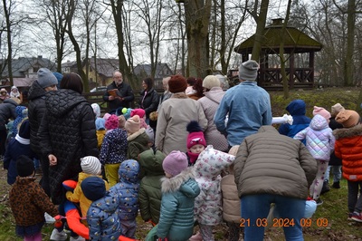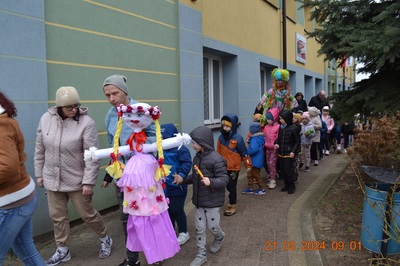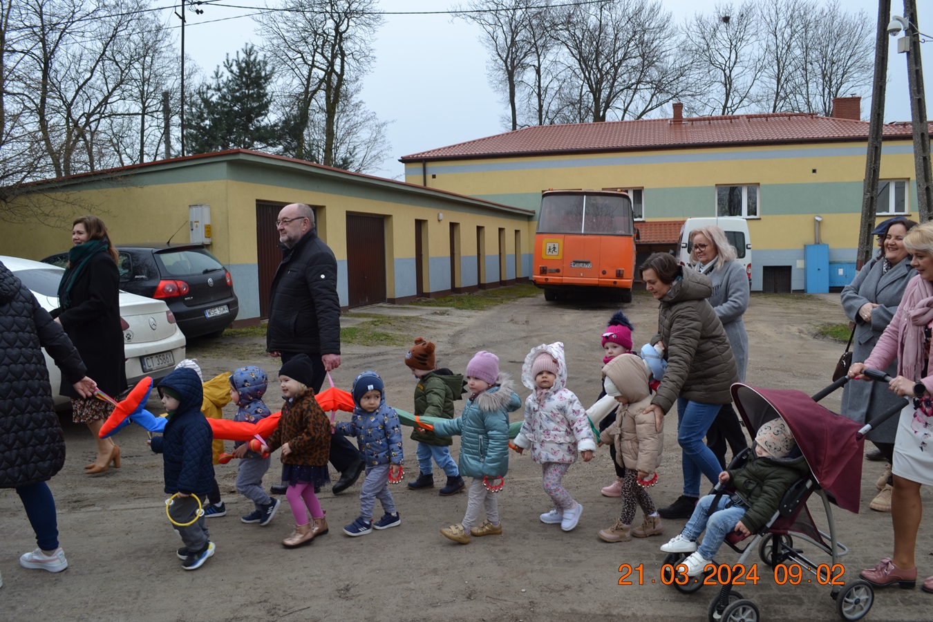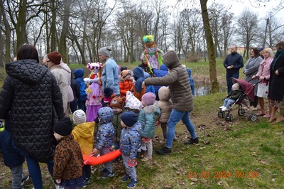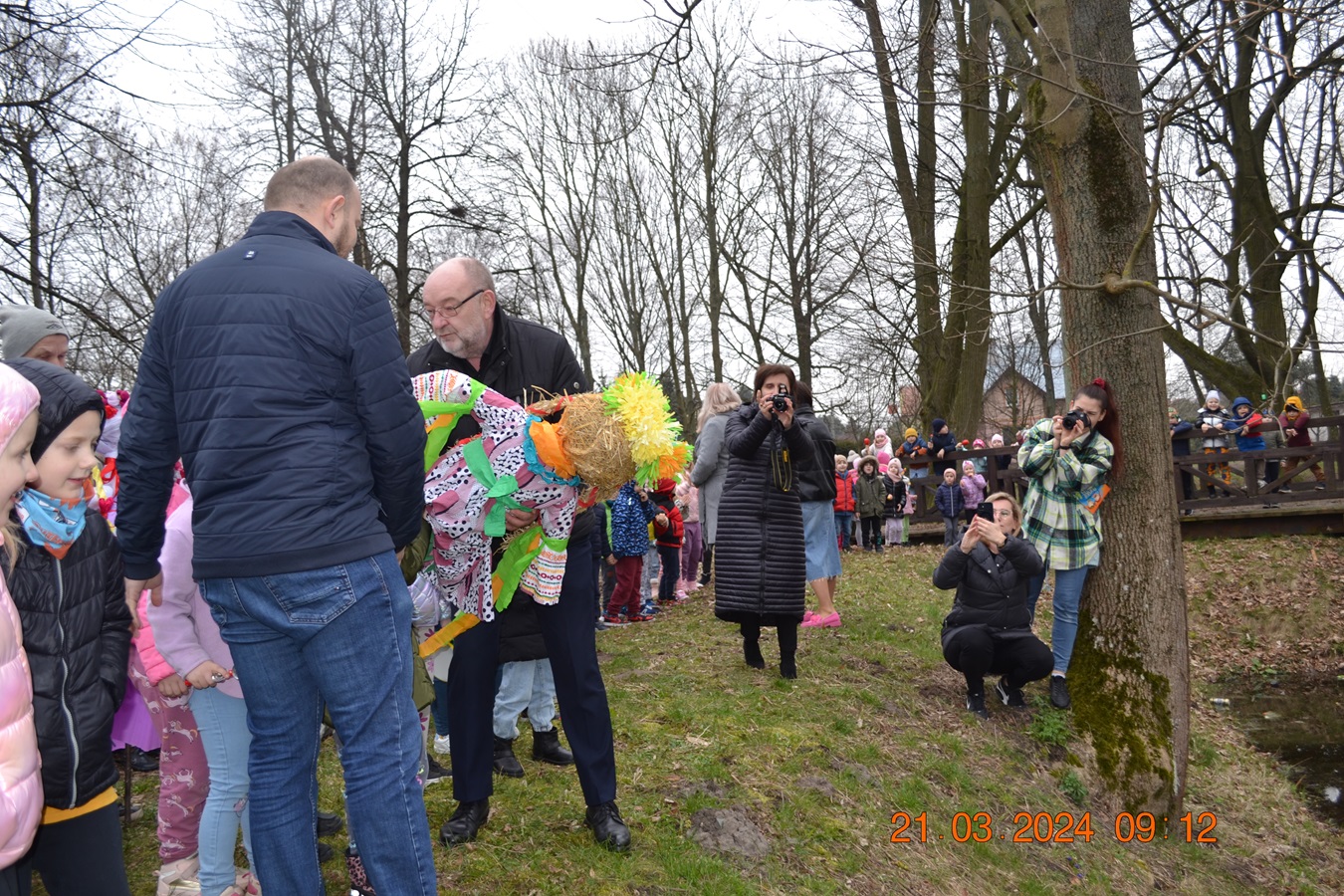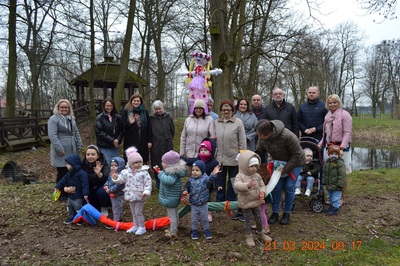 21 marca wspólnie z ciociami z biblioteki, Panem Wójtem, kolegami i koleżankami z przedszkola zgodnie z tradycją udało się nam utopić Marzannę w naszym parku. Nawet padający leciutko deszczyk nie zepsuł naszych planów. Było nas dużo, a dodatkowo, żeby szybciej zima odeszła zabraliśmy ze sobą instrumenty muzyczne i głośno żegnaliśmy odchodzącą porę roku, żeby szybko i bez ociągania przyszła do nas wiosna. Dzieci radośnie maszerowały w wiosennym korowodzie na czele którego widniała Marzanna, którą następnie pożegnaliśmy według tradycji. Wierzymy, że nasze wspólne starania sprawią, że wiosna obudzi ze snu wszystkie kwiatki, drzewka i ptaszki. Zrobi się już ciepło, dni będą coraz dłuższe, a świat będzie bardziej kolorowy. Zwierzątka, które przespały zimę, opuszczą swoje kryjówki i zrobi się już radośnie.