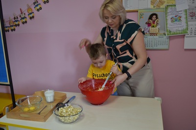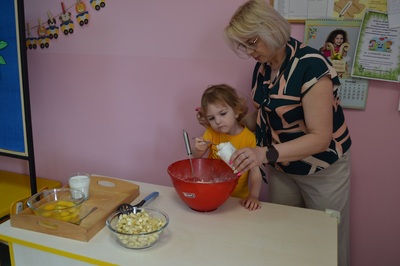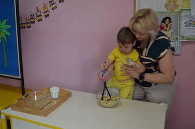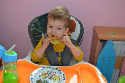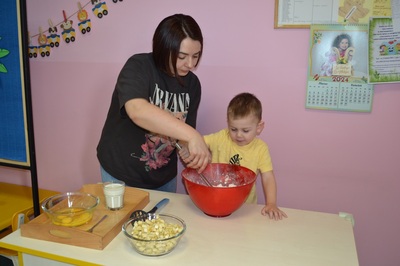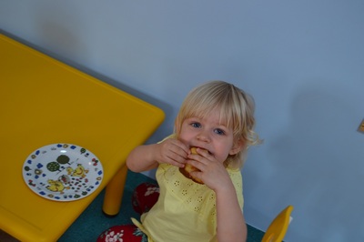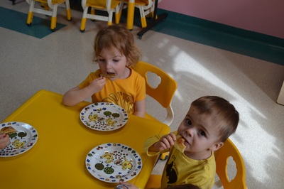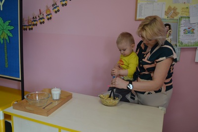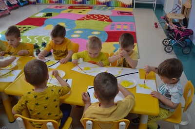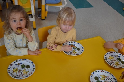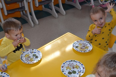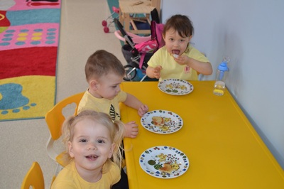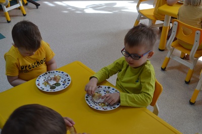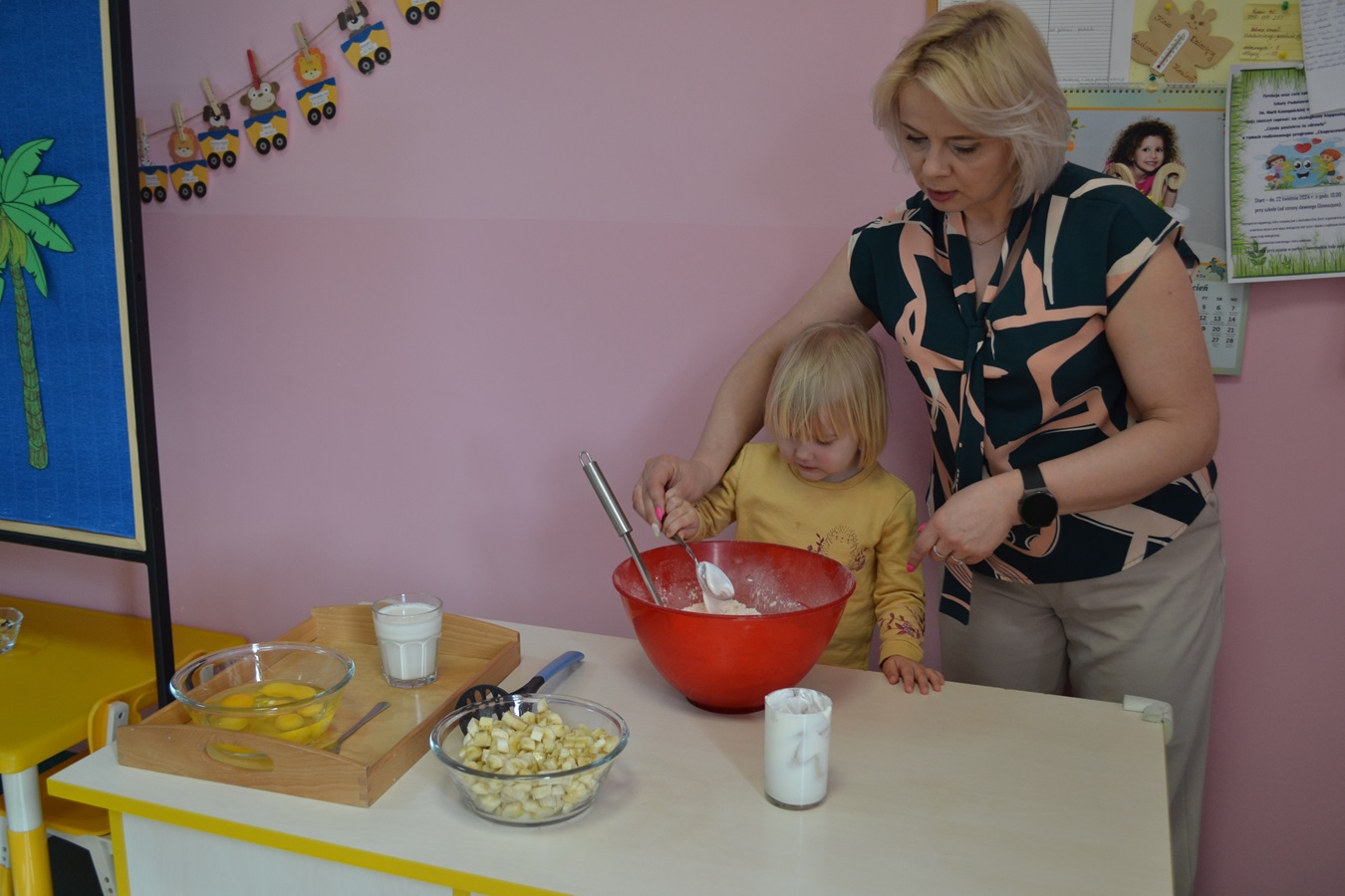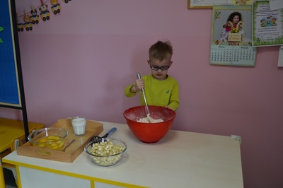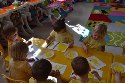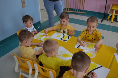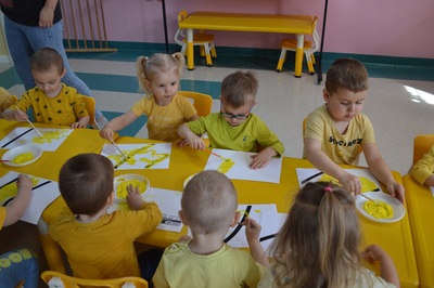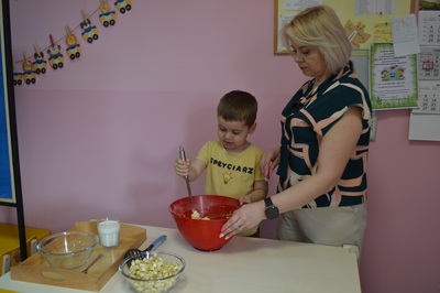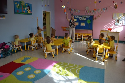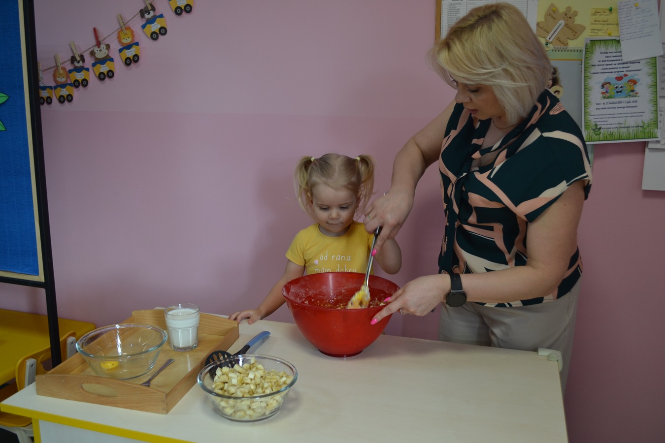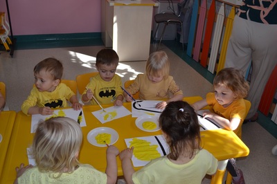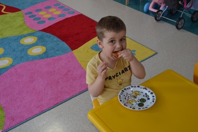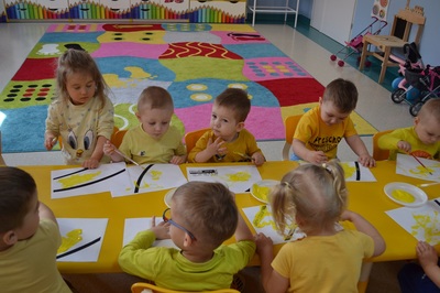 W dniu dzisiejszym było u nas bananowo. Zaczęliśmy od przygotowania ciasta na placuszki bananowe, każde dziecko miało swój wkład w powstanie tych smakołyków. Maluchy mieszały składniki, a nasza ciocia Marzenka czarowała w kuchni i łakomczuszki konsumowały pyszne placuszki. A że to uczta bananowa to nie mogło zabraknąć oczywiście soczku bananowego. Jednak, żeby nie było to maluchy miały też do wykonania wspólną pracę. Dzieci dostały kartki i musiały pomalować na żółto zgodnie z poleceniem, a później złożyć z puzzli dużego banana. Wspólna praca wyszła dała dużo zabawy i śmiechu.