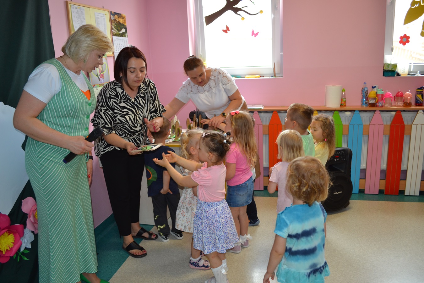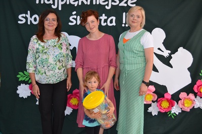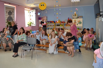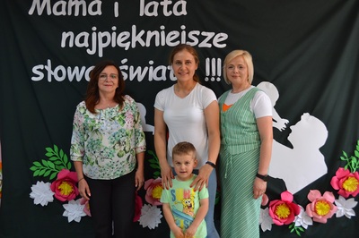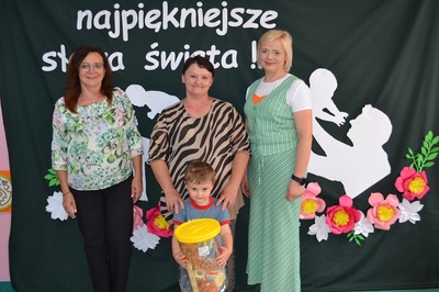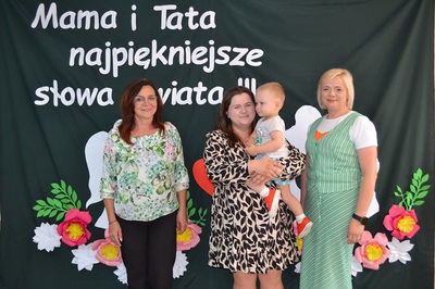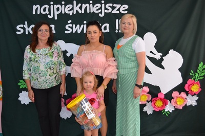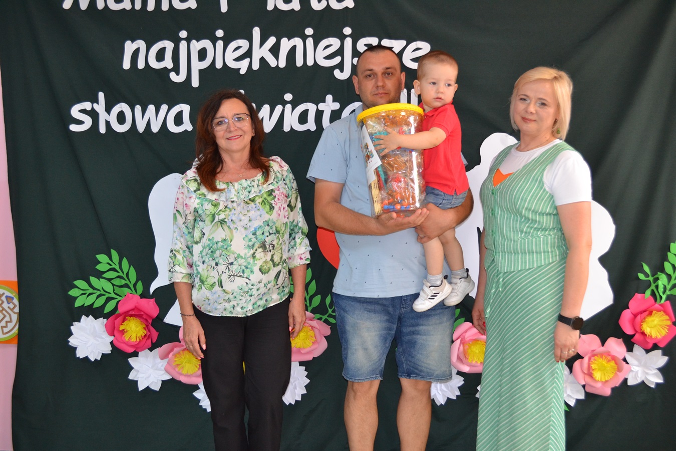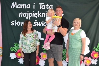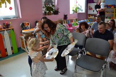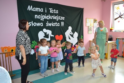 Maluszki zaprezentowały dla swoich rodziców, rodzeństwa , dziadków oraz gościa Jolanty Lewandowskiej Kierownika Oświaty , piosenkę z układem pt : ,,Mamo , Tato”. Następnie z uśmiechem na twarzy każde dziecko wręczyło rodzicom drobne upominki.