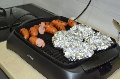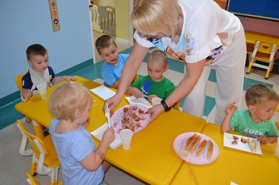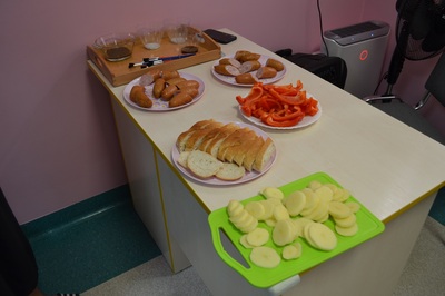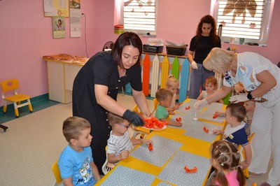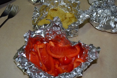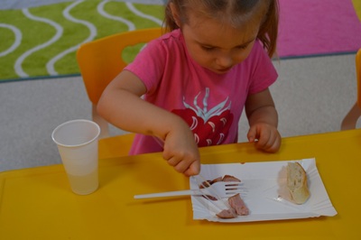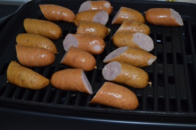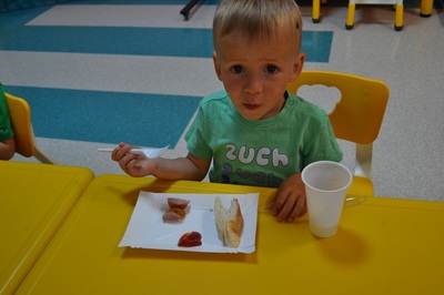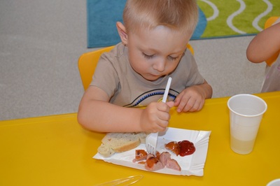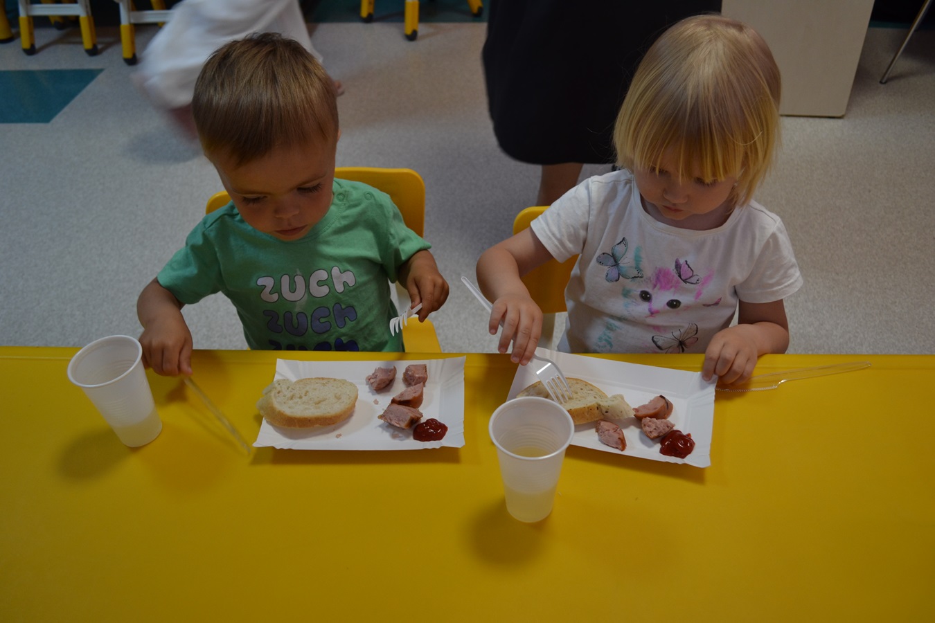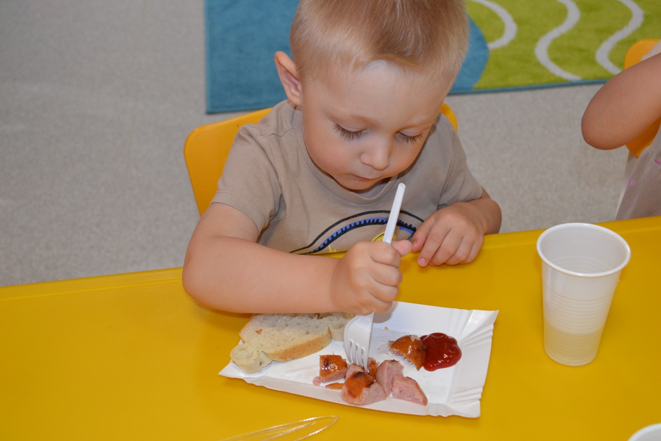 Kiedy przyszedł czas na grilla wszyscy zasiedli do wspólnego stołu z zapałem konsumując pyszne pieczone kiełbaski, chleby tostowe i oczywiście warzywa pełne witamin.