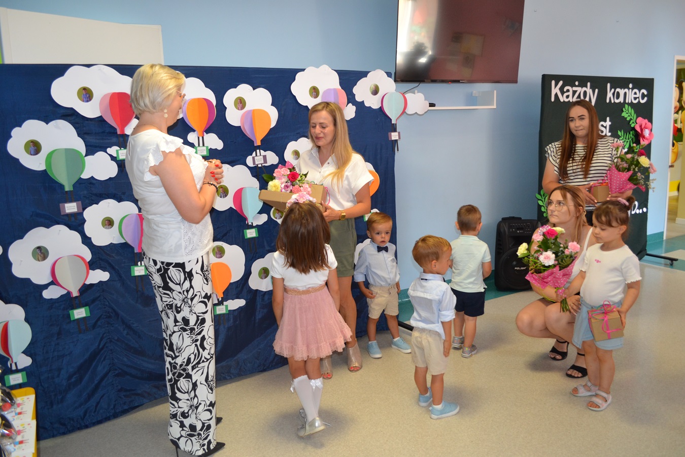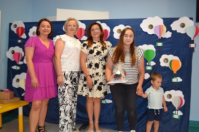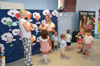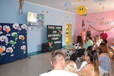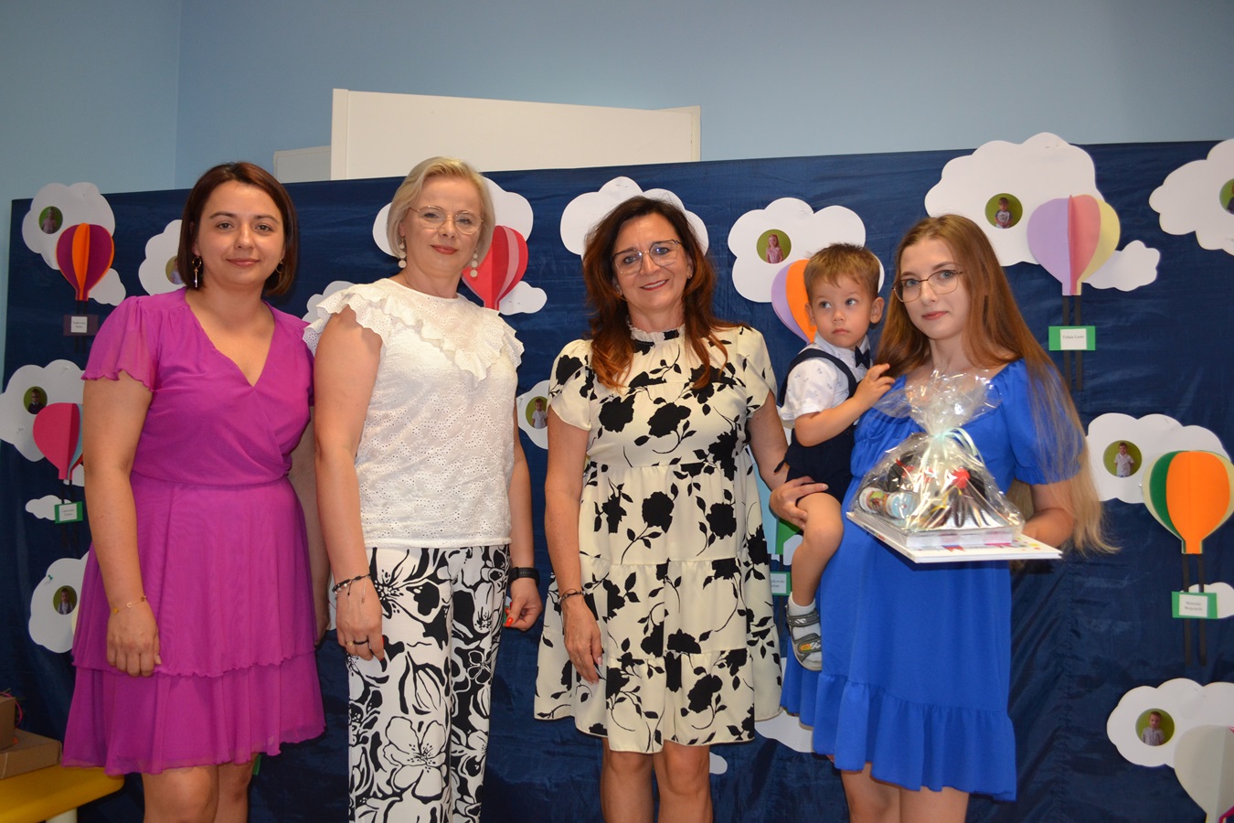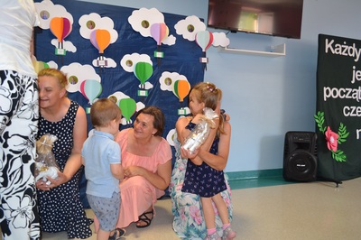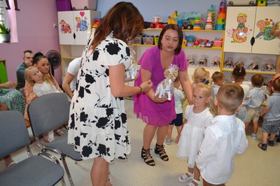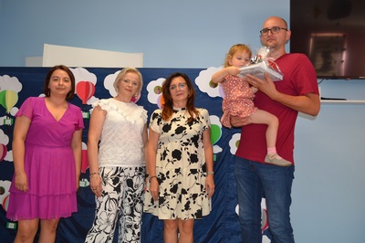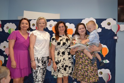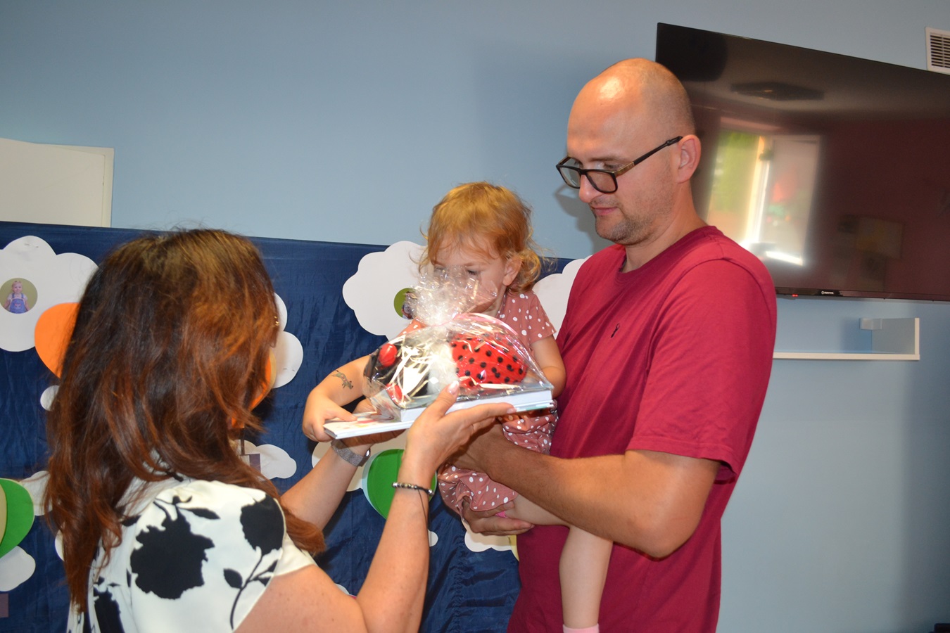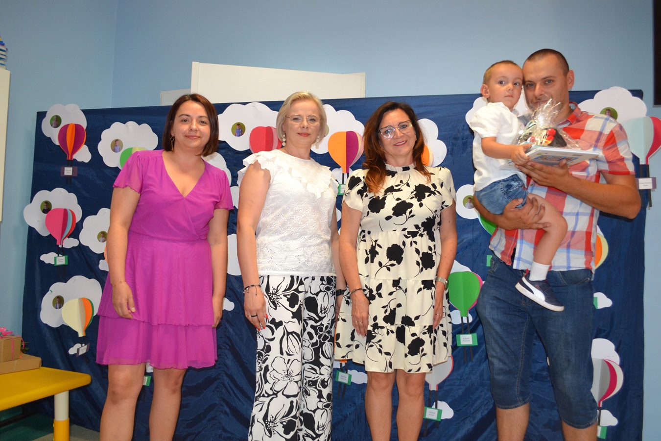 Dziękuję również naszym fantastycznym ciociom, których praca, ciepło i troska sprawiają, że nasz klubik jest wyjątkowym miejscem. Wasze oddanie i profesjonalizm są fundamentem, na którym budujemy naszą codzienność. Dziękuję Wam za każdą chwilę poświęconą naszym maluchom. Ten rok był pełen niezapomnianych chwil i małych, ale ważnych sukcesów. Dzieci nauczyły się wielu nowych umiejętności, odkryły swoje pierwsze pasje i zawiązały pierwsze przyjaźnie. To właśnie te chwile tworzą piękne wspomnienia, które pozostaną z nami na zawsze. Przed nami wakacje, czas odpoczynku i zabawy. Życzę Wam wszystkim, aby były pełne słońca, radości i wspólnych, beztroskich chwil spędzonych z rodziną i przyjaciółmi. Niech ten czas będzie dla Was okazją do nabrania sił i energii na nowe przygody, które czekają na nas po wakacjach. Dziękuję Wam wszystkim za ten wspólnie spędzony rok. Życzę wspaniałych wakacji i do zobaczenia wkrótce! Po przedstawieniu przyszedł czas na oficjalne pożegnanie dzieci, które opuszczają w tym roku mury klubiku. Wszystkie maluchy otrzymały pamiątkowe dyplomy oraz drobne upominki, które będą im przypominać o tym wyjątkowym okresie. Część dzieci z nami zostaje i cieszymy się że będziemy się jeszcze spotykać.