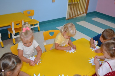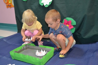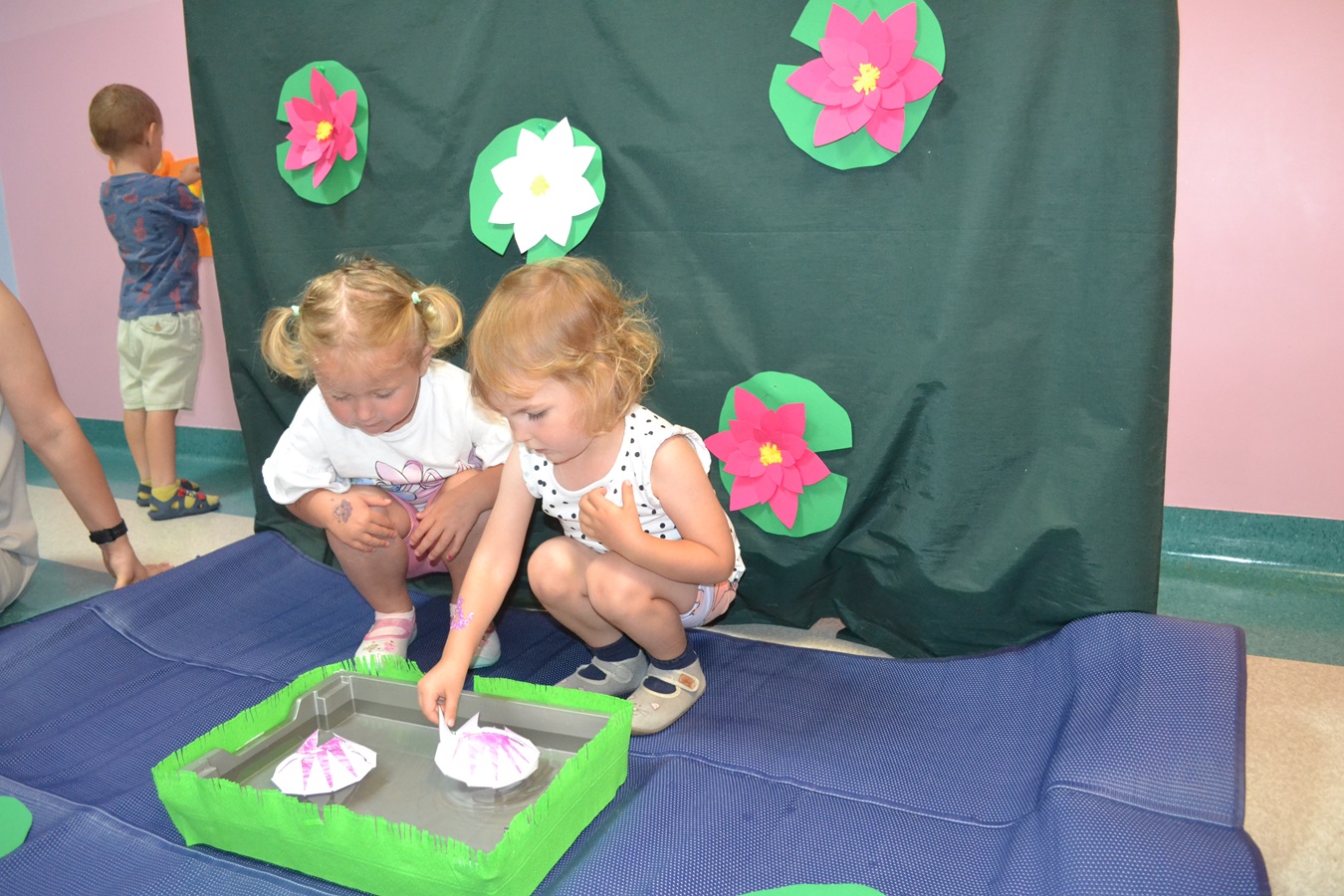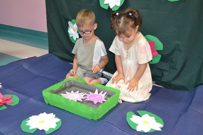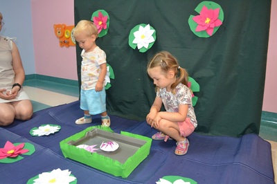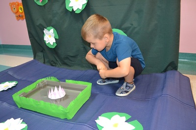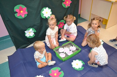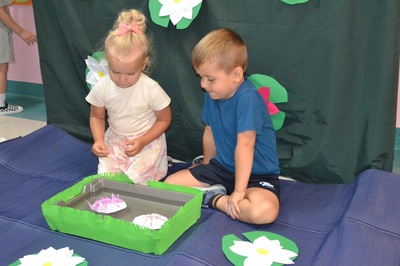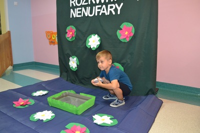 Każde dziecko otrzymało własnoręcznie wykonany, papierowy nenufar. Po krótkim pokazie i omówieniu, dzieci ustawiły się przy przygotowanym pojemniku z wodą, gotowe wypuścić swoje nenufary na wodną powierzchnię. W momencie, gdy papierowe kwiaty dotknęły wody, zaczął się cudowny proces – płatki nenufarów delikatnie się rozwijały, tworząc piękne, rozłożyste kwiaty. Dzieci obserwowały ten proces z zachwytem i zdumieniem, a muzyka walca dodawała całemu wydarzeniu wyjątkowej elegancji.