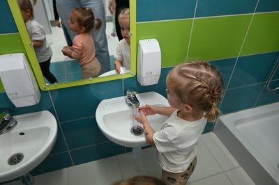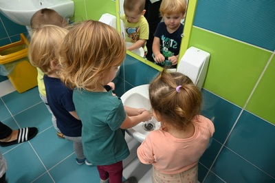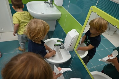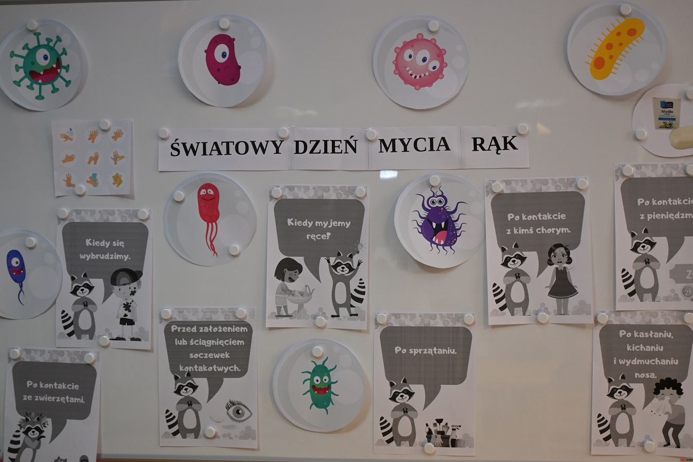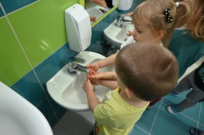 15 października obchodzony jest Światowy Dzień Mycia Rąk. Celem tego dnia jest uświadomienie dzieciom jak ważne znaczenie na w ich życiu codzienne mycie rąk. Odbyliśmy rozmowę na temat zarazków , bakterii i wirusów , które dostają się do naszego organizmu poprzez brudne ręce. Dzieci dowiedziały się , jakie znaczenie dla zdrowia ma dokładne mycie rąk. Omawialiśmy także schemat mycia rąk oraz zastosowaliśmy go w praktyce. Wspólnie wykonaliśmy prace plastyczne promujące mycie rąk.