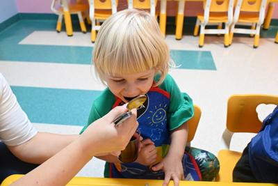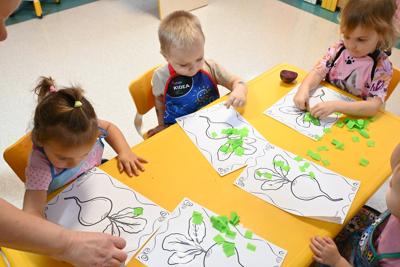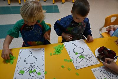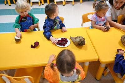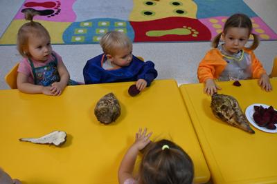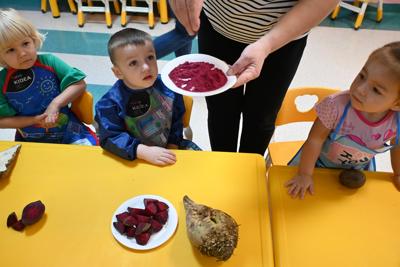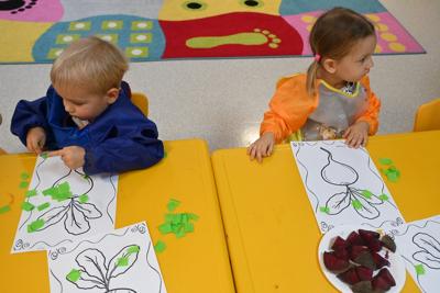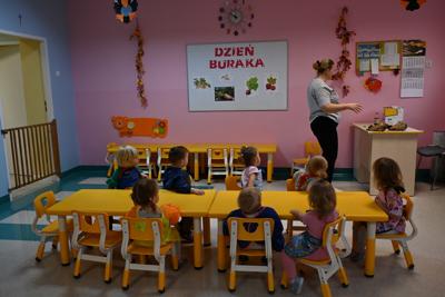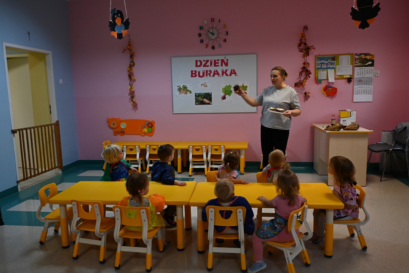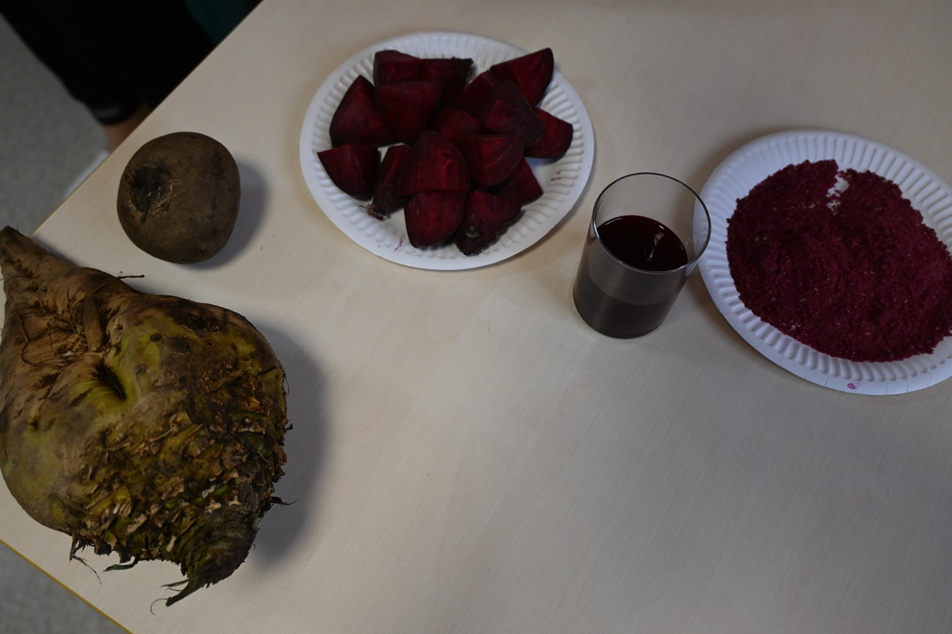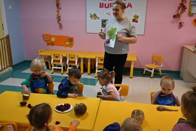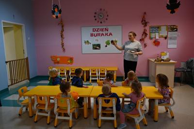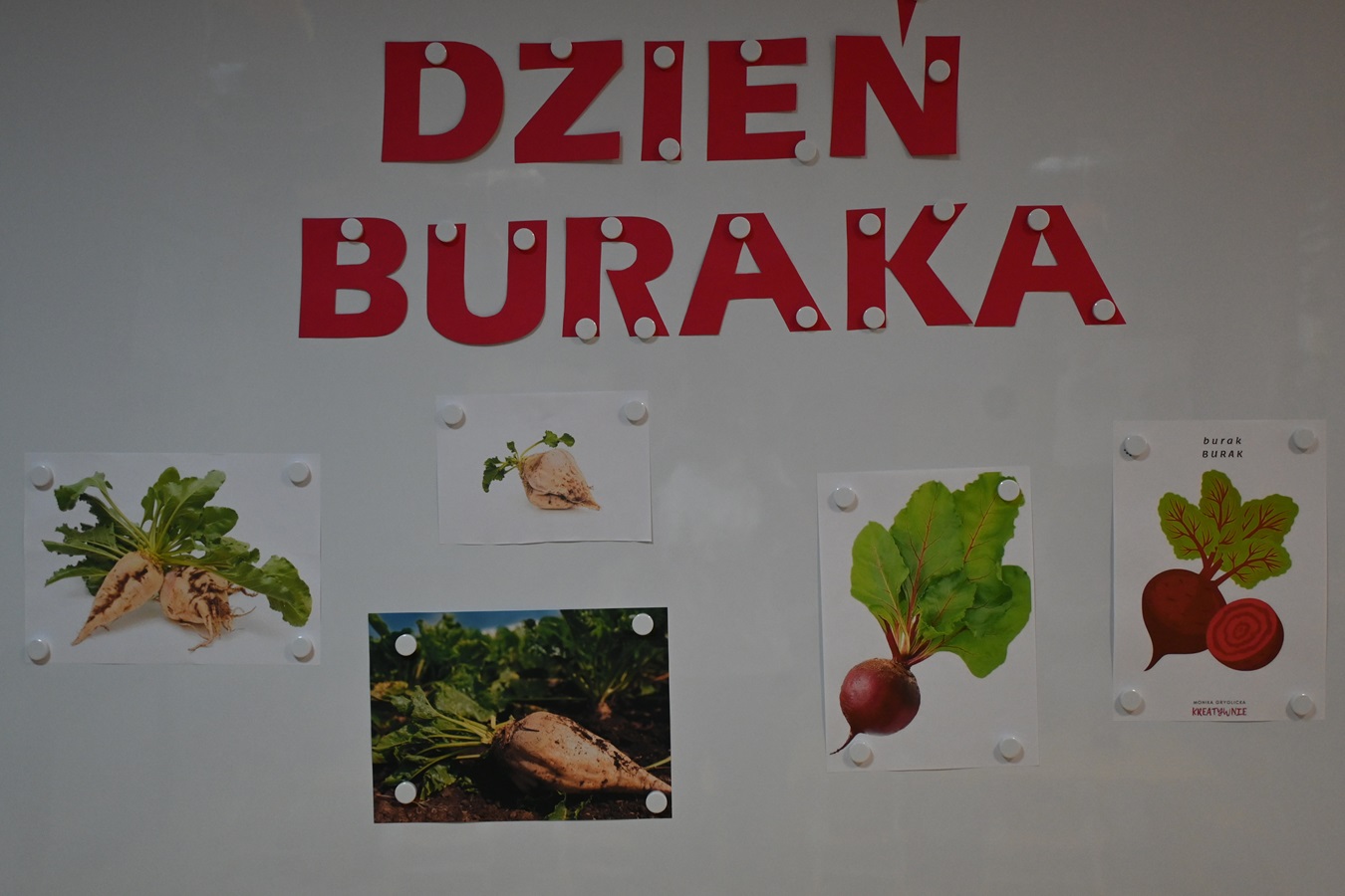 Tego dnia dzieci poznały buraka ćwikłowego i cukrowego. Wysłuchały ciekawostek na ich temat poznały go przez dotyk i smak próbowały soku z buraka  ćwikłowego. Dzień buraka obfitował w kolor bordowy. Maluszki wykonały pracę plastyczną malowały rysunek buraka kawałkiem tego warzywa. To przecież naturalny środek koloryzujący trudny do odplamiania mamy coś wiedzą na ten temat . Jednak prace dzieci wyszły bardzo buraczkowe na koniec obejrzały film edukacyjny o buraku.