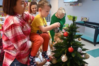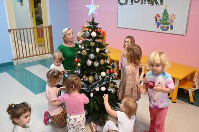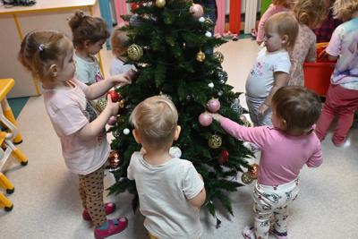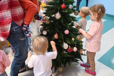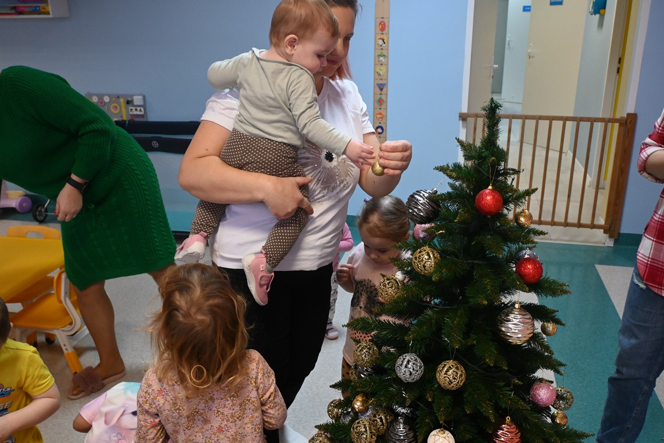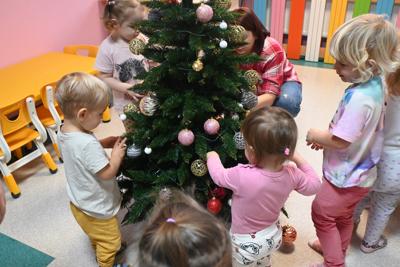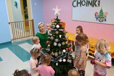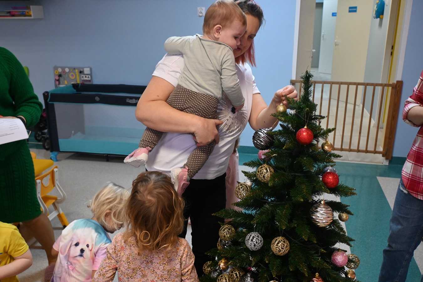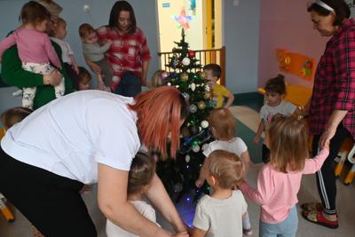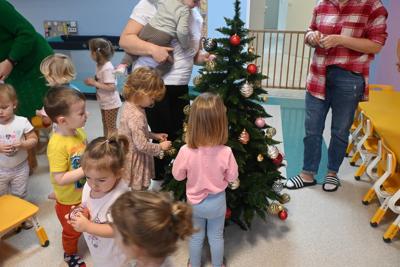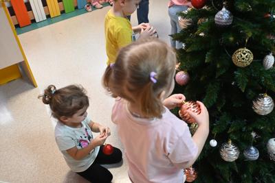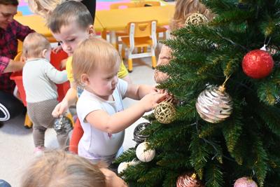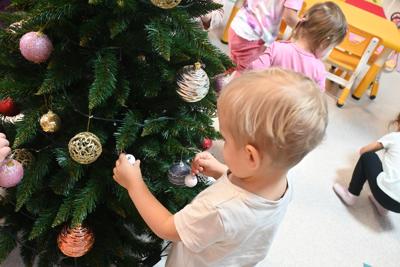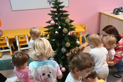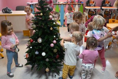 Święta Bożego Narodzenia wiążą się z tradycją ubierania świątecznego drzewka. W klubiku również nie mogło zabraknąć tego rytuału. Dzień ubierania choinki  jest dniem wyjątkowym. Dzieci z wielkim zaangażowaniem zawieszały choinkowe ozdoby: bombki, gwiazdę betlejemską, zielono białe łańcuchy, kolorowe światełka. Ileż było radości wśród dzieci a w grupie od razu zrobiło się świątecznie. Drzewko zostało przystrojone bardzo szybko, wygląda wyjątkowo i przypomina nam, że Święta Bożego Narodzenia już tuż, tuż… Wszystkie dzieci jednogłośnie stwierdziły, ze choinka jest prześliczna, a na koniec nie mogło obejść się bez grupowego zdjęcia z świątecznym drzewkiem.