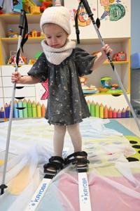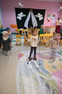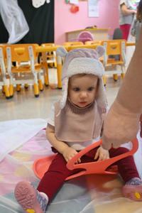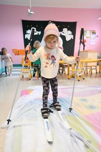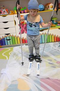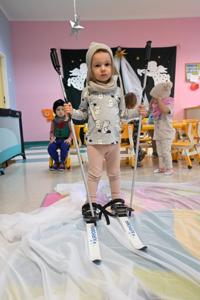 Po intensywnym lepieniu przyszedł czas na zimowe atrakcje! Dzieci z zapałem korzystały z rozłożonego woalu, który stał się idealnym stokiem do jazdy na nartach. Uśmiechy na twarzach maluchów mówiły same za siebie - radość z zimowych aktywności była nie do opisania.