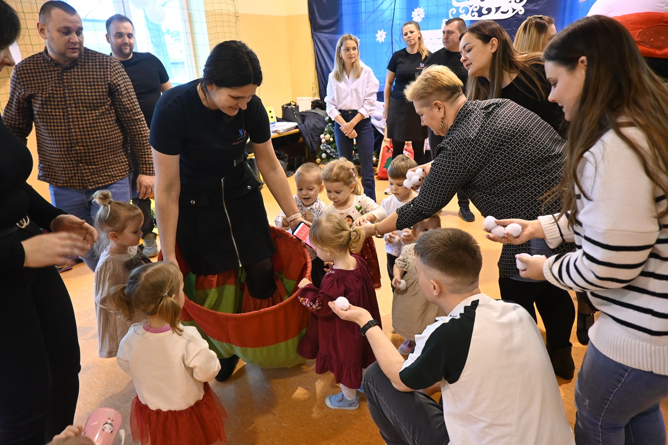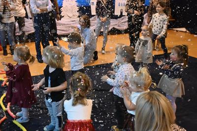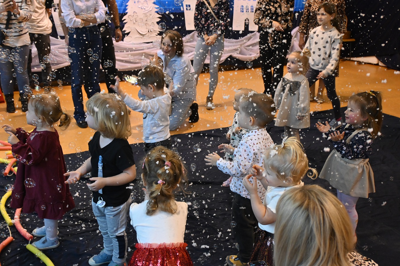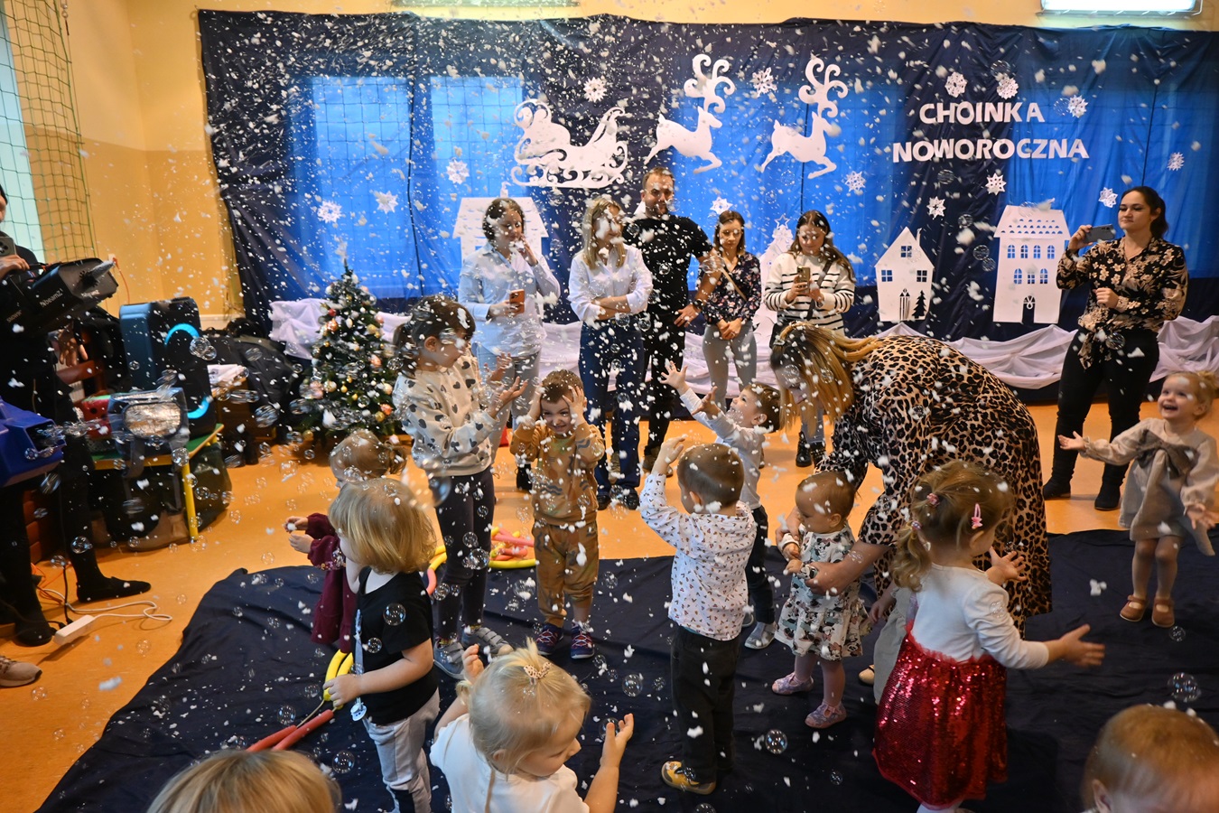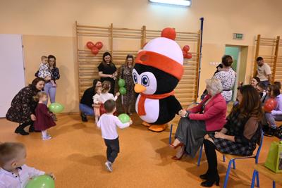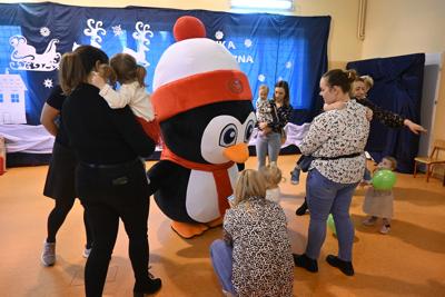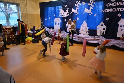 Na wstępie Pani Kierownik w imieniu swoim i wszystkich pracowników powitała gościa Panią Kierownik Referatu Oświaty Jolantę Lewandowską , rodziców oraz dzieci , złożyła życzenia noworoczne i tym samym rozpoczęła uroczystość. A zabawa zaczęła się od tanecznych piruetów z chustą , później było bańkowego  szaleństwo , konkurencje sportowe , balonowe miecze , brokatowe tatuaże i poczęstunek. Oczywiście dzieci dostały wyczekiwane prezenty od pomocnika Świętego Mikołaja ,renifera Rudolfa. To był miło spędzony dzień z ciociami i rodzicami , pełen śmiechu i pozytywnych emocji !