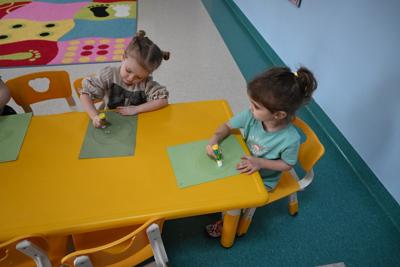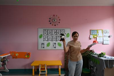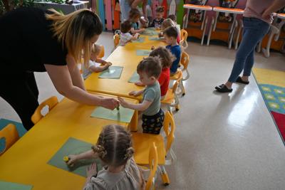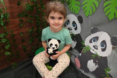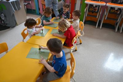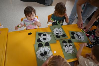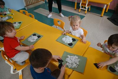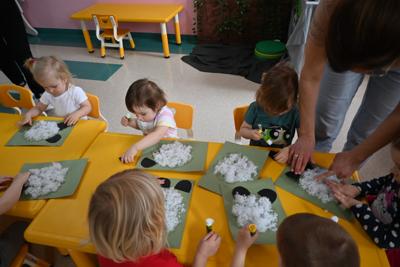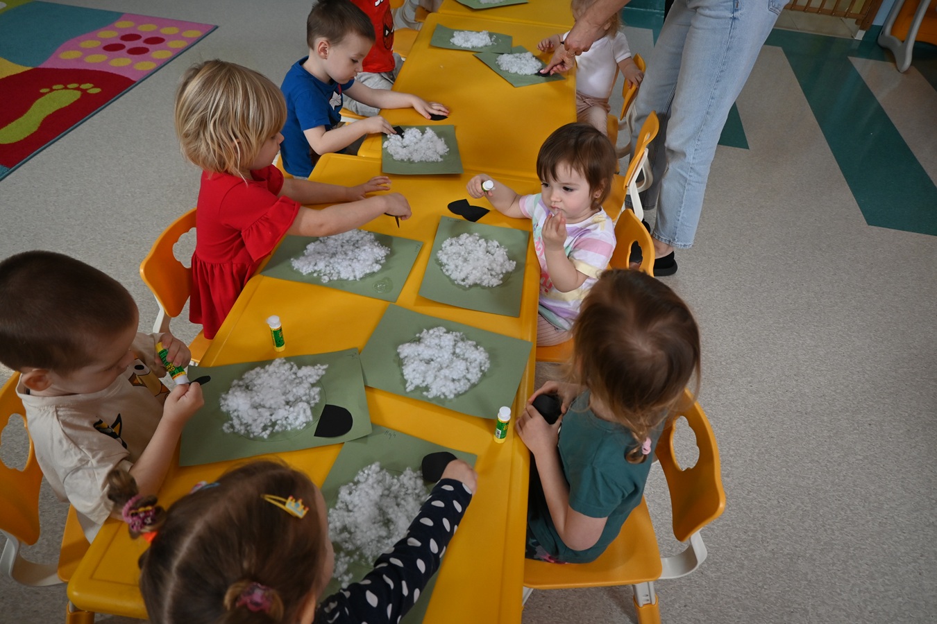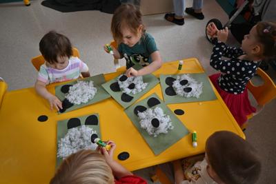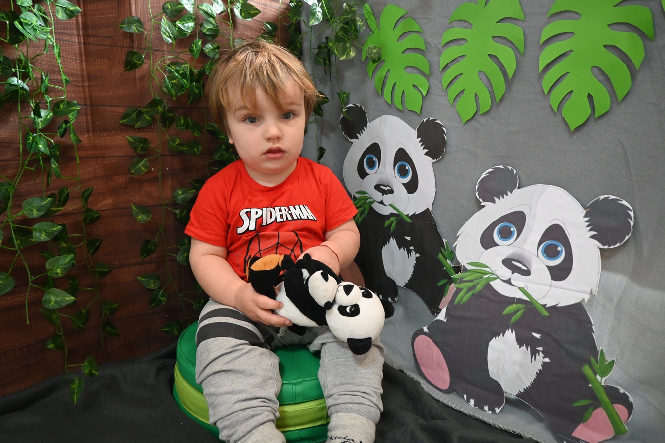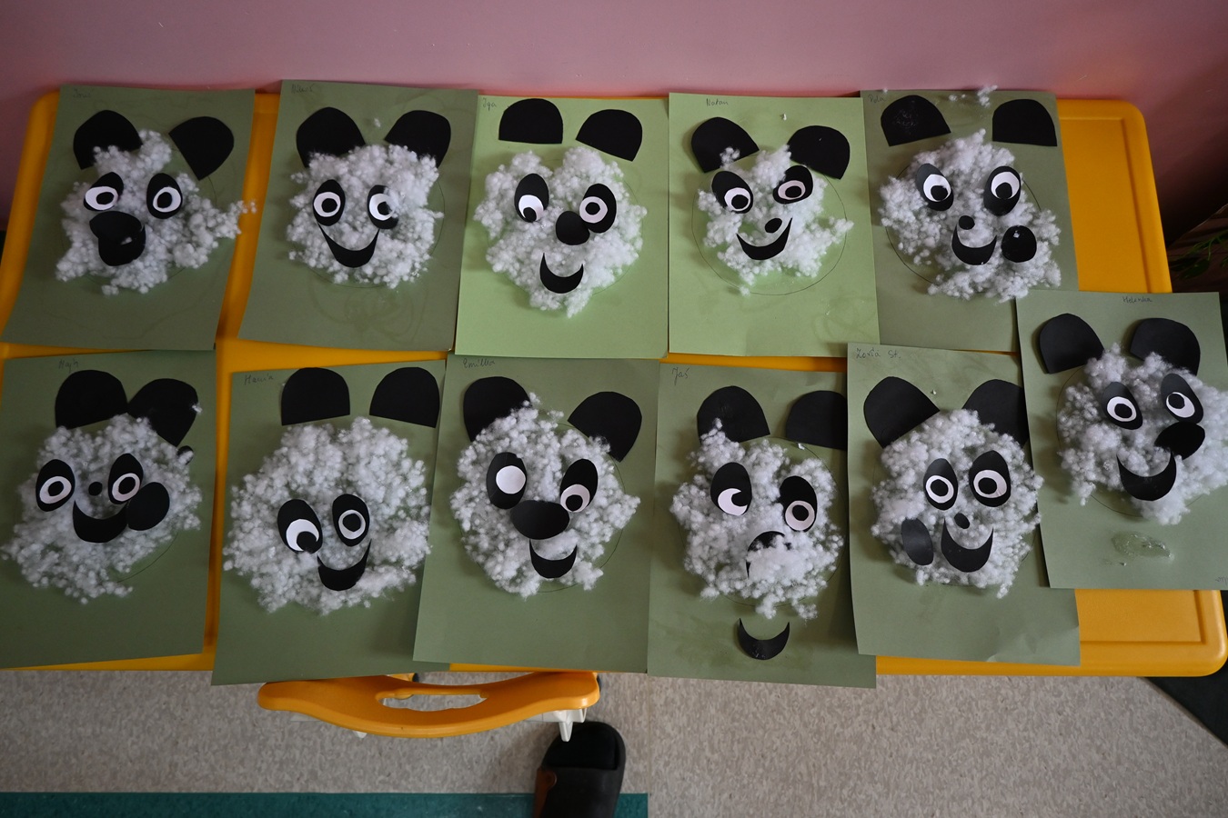 Nie zabrakło również pamiątkowych zdjęć – maluchy z radością pozowały na tle dekoracji przedstawiającej pandę. Następnie przystąpiły do pracy plastycznej, w której wyklejały głowę pandy za pomocą waty oraz czarnego papieru. Efekty ich twórczości były zachwycające!