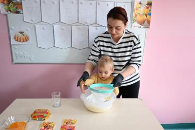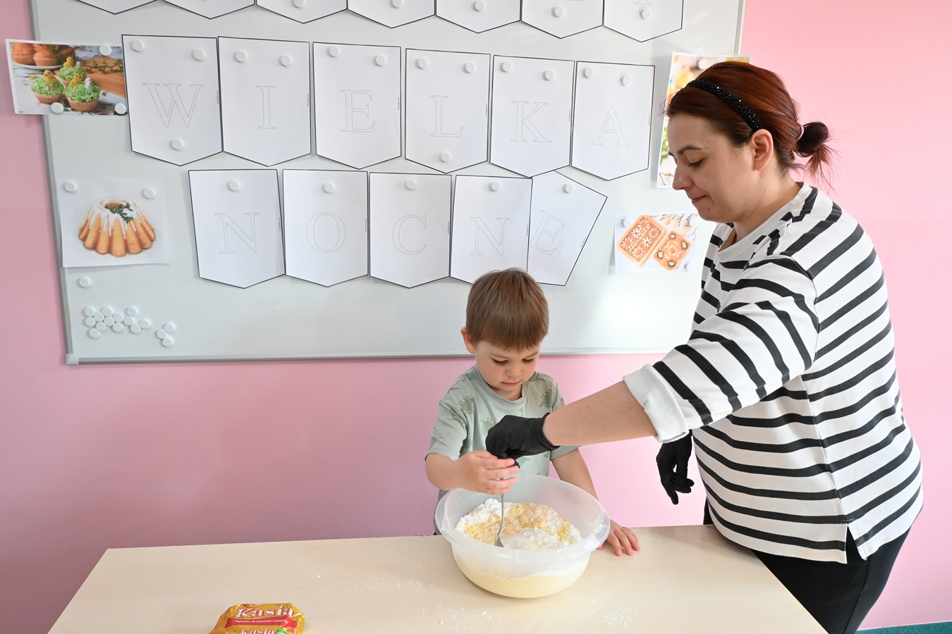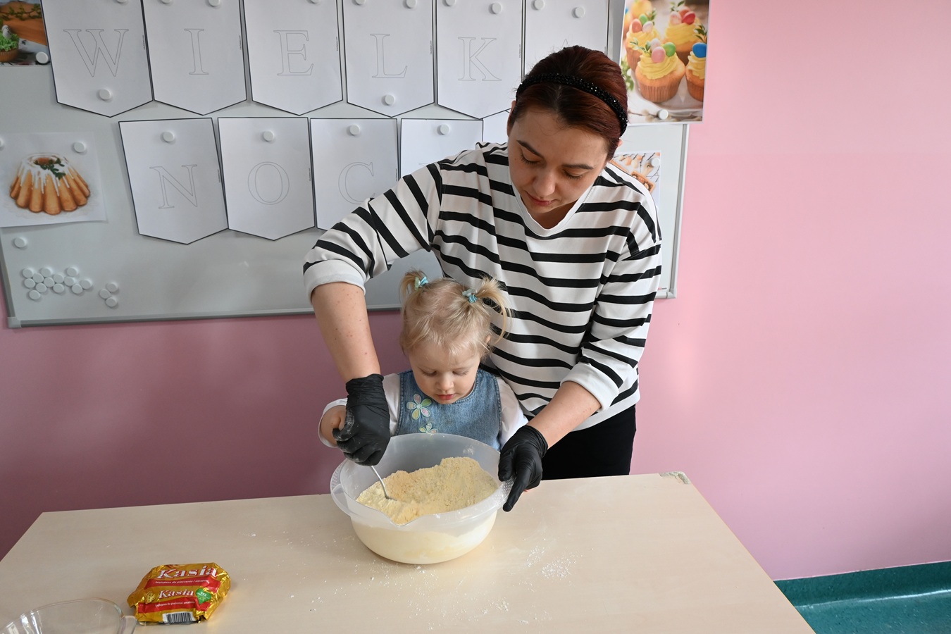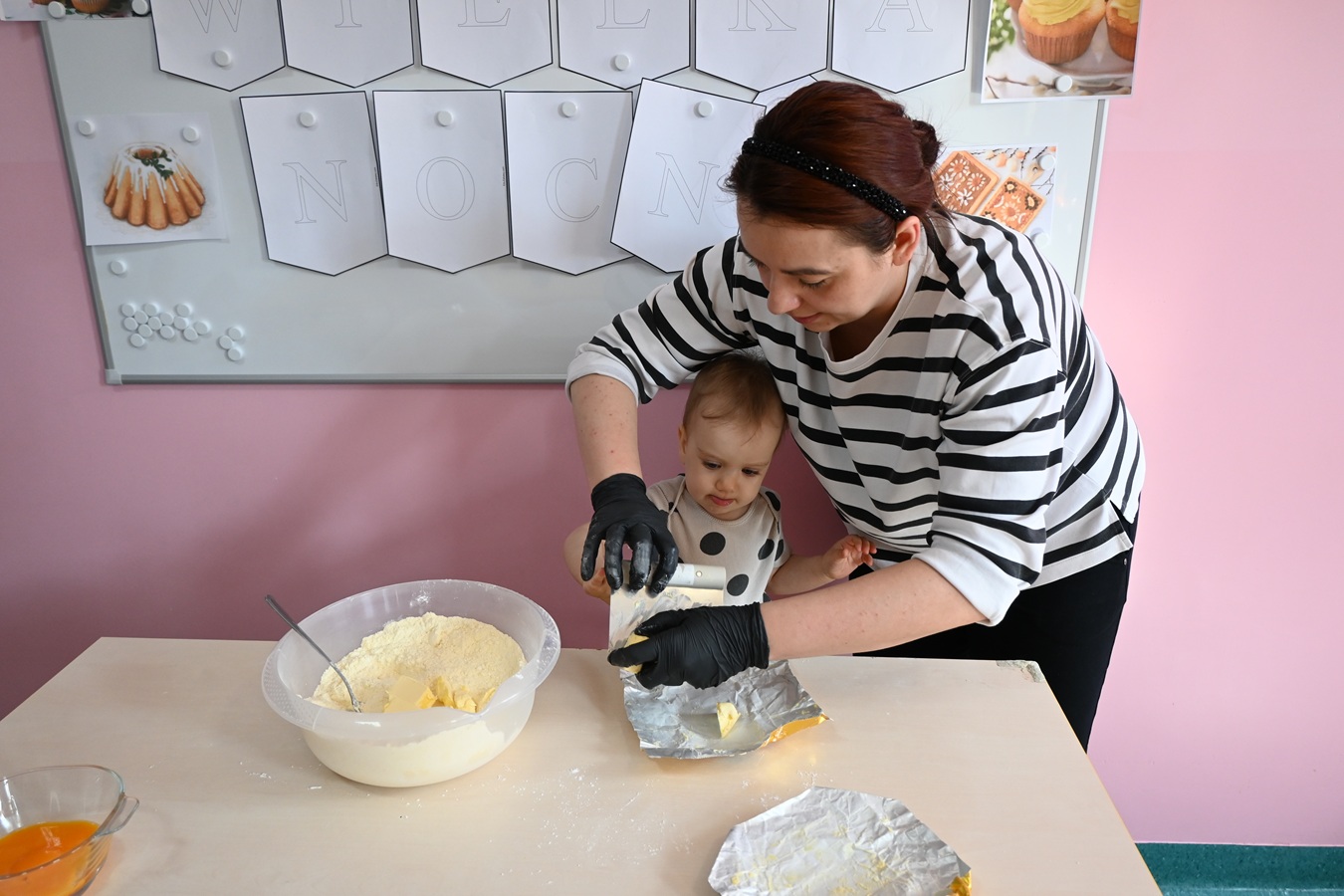 Podczas zajęć dzieci poznają tradycje wielkanocne związane z pieczeniem słodkości takich jak np. Babka wielkanocna. Wspólnie przygotowaliśmy proste, kolorowe wypieki- kukurydziane ciasteczka w kształcie jajek ,zajączków i kurczaczków.