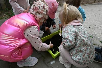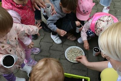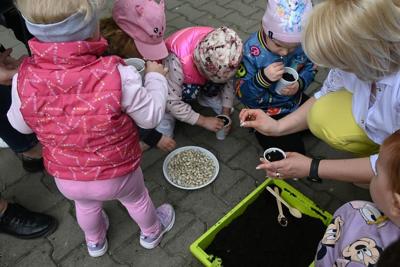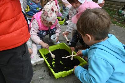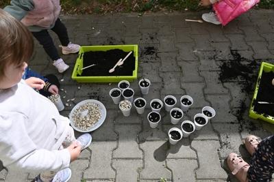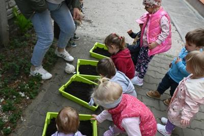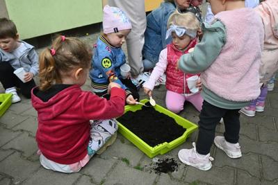 Po teatrzyku przyszedł czas na działania praktyczne. Dzieci wsypywały ziemię do przygotowanych wcześniej kubeczków, a następnie samodzielnie sadziły cebulę. Było przy tym mnóstwo radości, emocji i zaangażowania. Każde dziecko otrzymało swój własny kubeczek z posadzoną cebulką, który zabrało do domu z zadaniem codziennego podlewania i obserwacji wzrostu roślinki.
