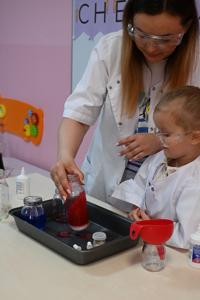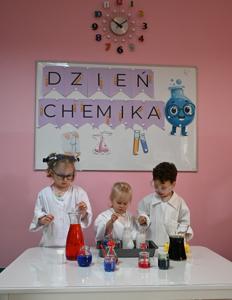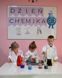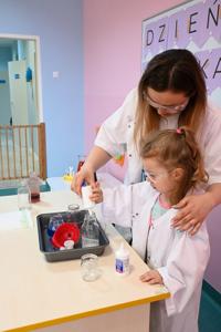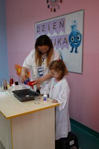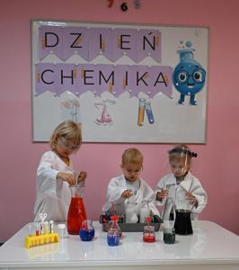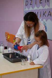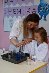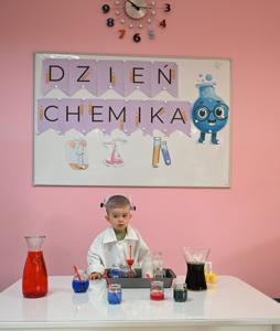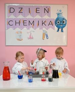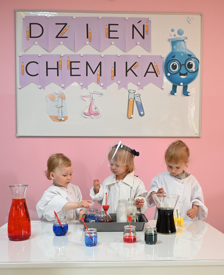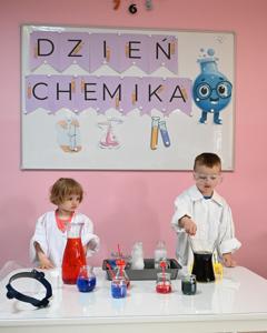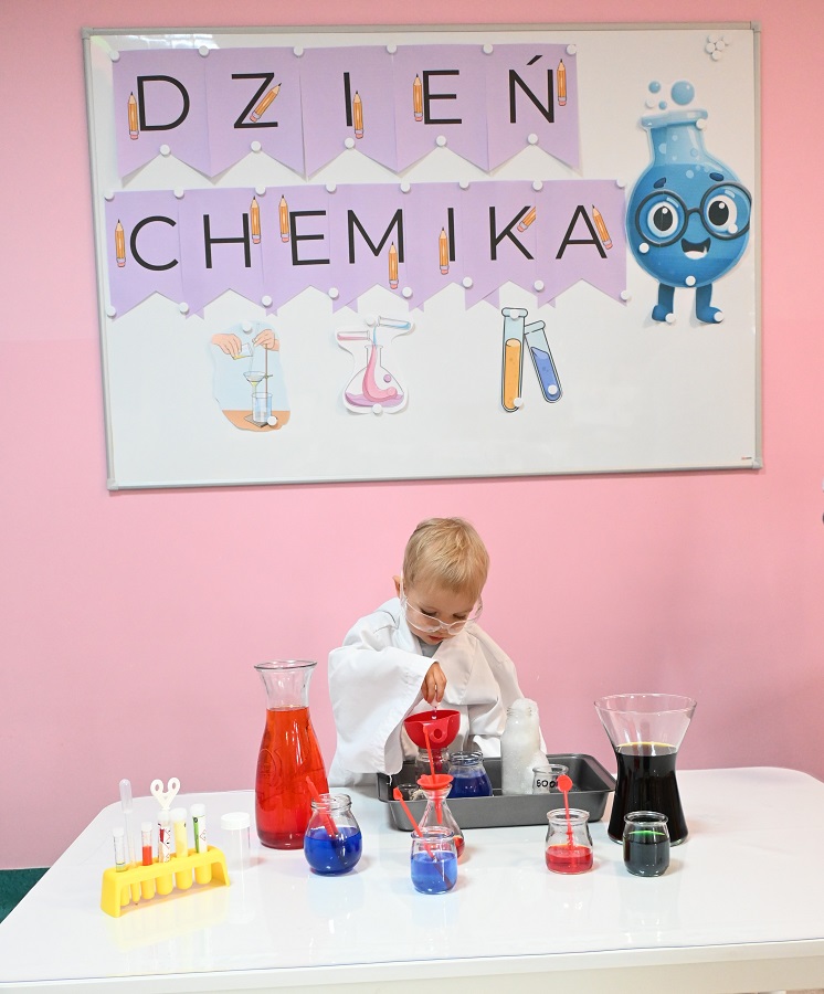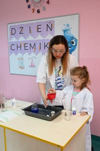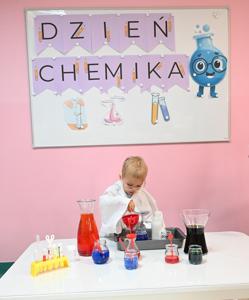 Dla podkreślenia wyjątkowego charakteru dnia, każde dziecko założyło ochronne okulary i biały fartuch laboratoryjny. Przy stole pełnym kolorowych karafek z zabarwioną wodą dzieci chętnie pozowały do pamiątkowych zdjęć w stroju chemika.