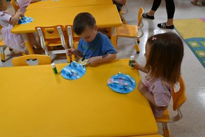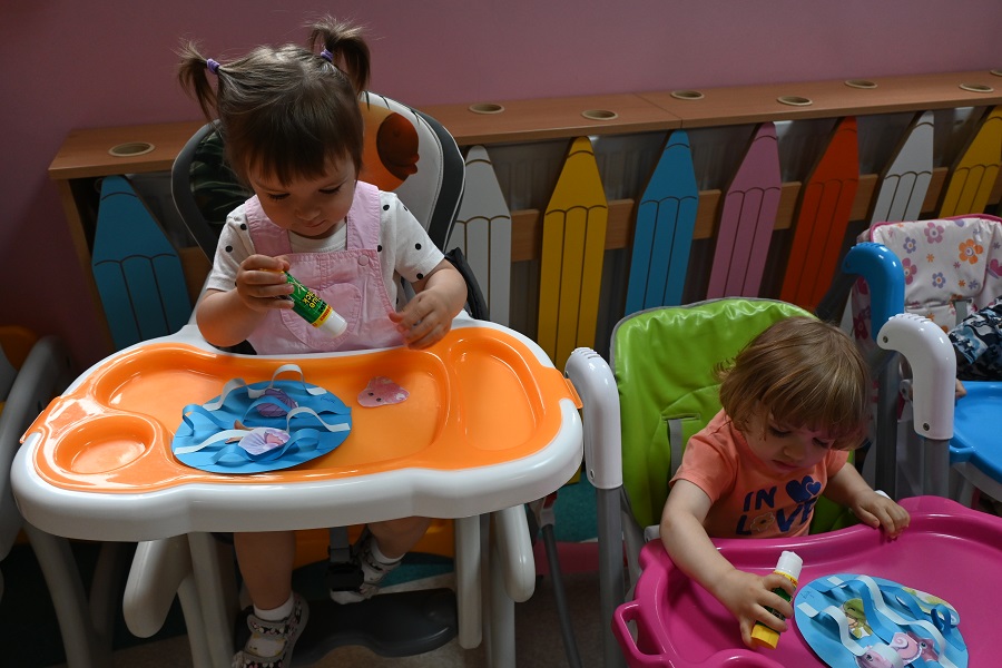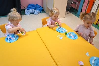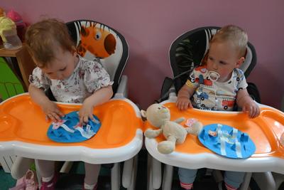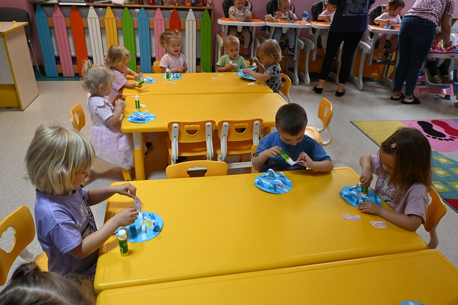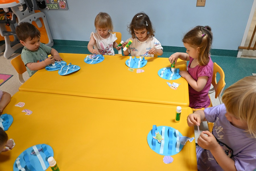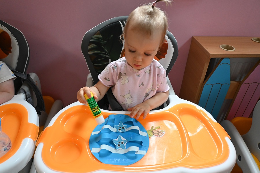 Podczas zajęć dzieci wykonały pracę plastyczną – każdy dostał owalny kawałek niebieskiej kartki, symbolizujący ocean, z przyczepionymi paskami fal. Zadaniem dzieci było ozdobienie swojego oceanu – przyklejały na nim muszelki, rybki, żółwie i inne morskie stworzenia, tworząc kolorowe, podwodne krajobrazy.