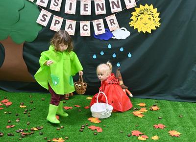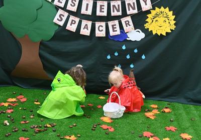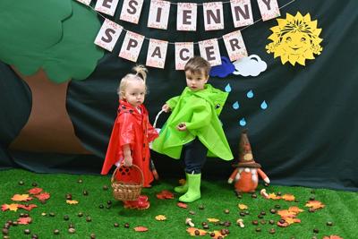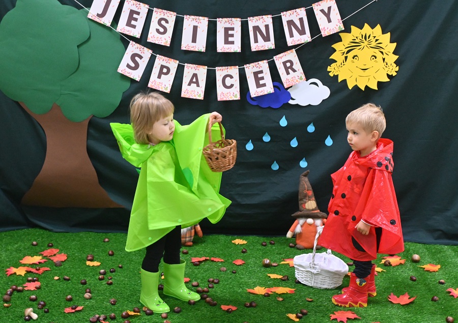 Dzieci w kolorowych płaszczykach wybrały się na spacer, żeby zbierać kasztany, żołędzie i grzybki.