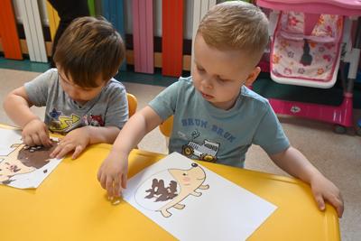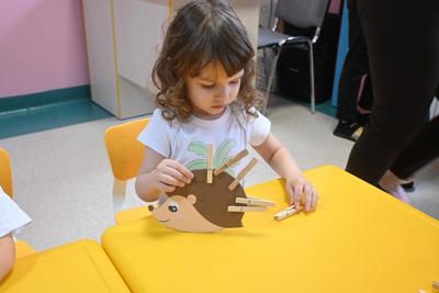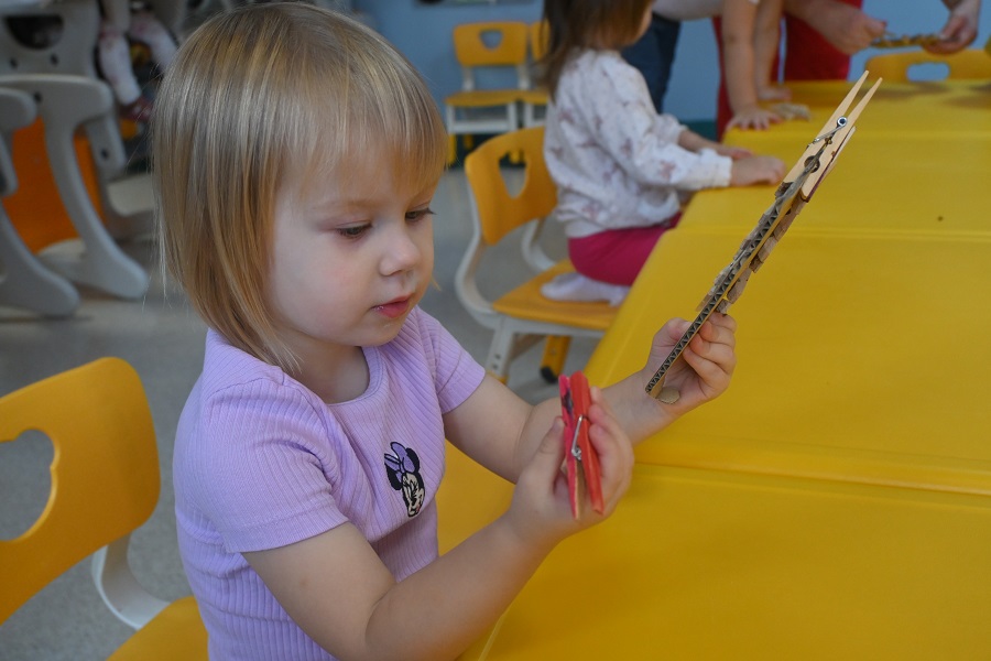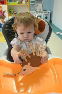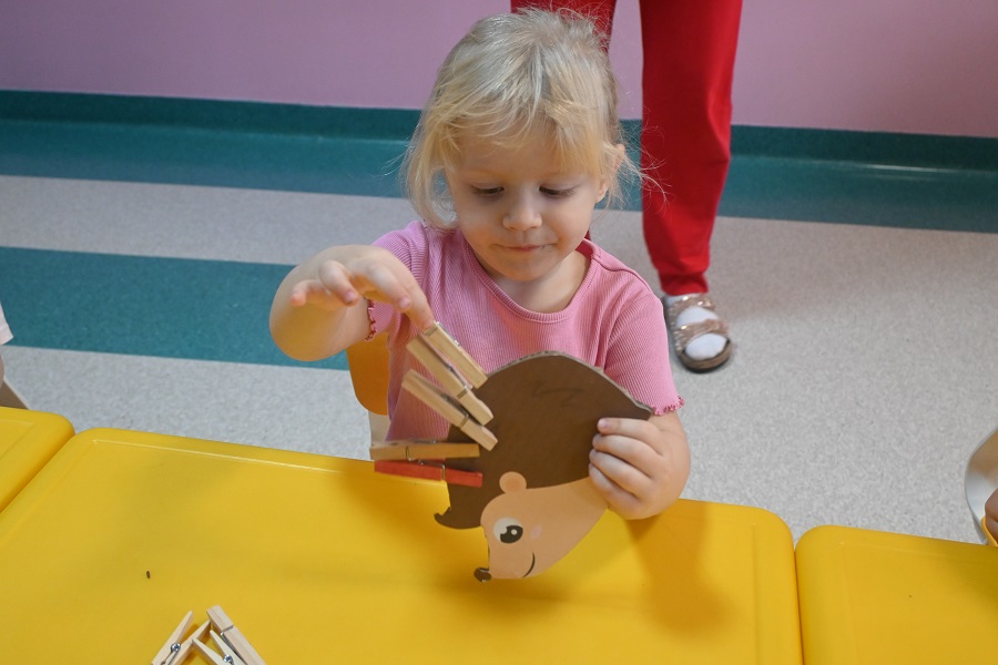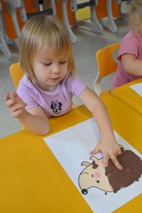 Nie zabrakło także zabawy ruchowo–manualnej z użyciem spinaczy do bielizny. Dzieci przypinały i odpinały spinacze do kolorowego rysunku jeża, dzięki czemu ćwiczyły siłę dłoni oraz koordynację oko–ręka.