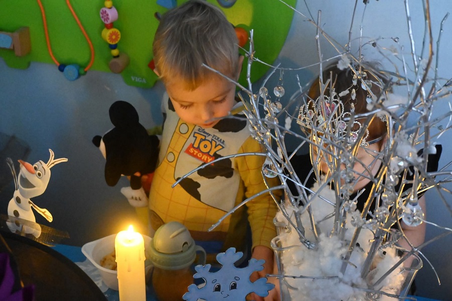 Tego wyjątkowego dnia sala zamieniła się w zimową krainę rodem z Krainy Lodu – błękitne światła, białe dekoracje i mieniące się kryształki stworzyły bajkową atmosferę, która od razu oczarowała dzieci.